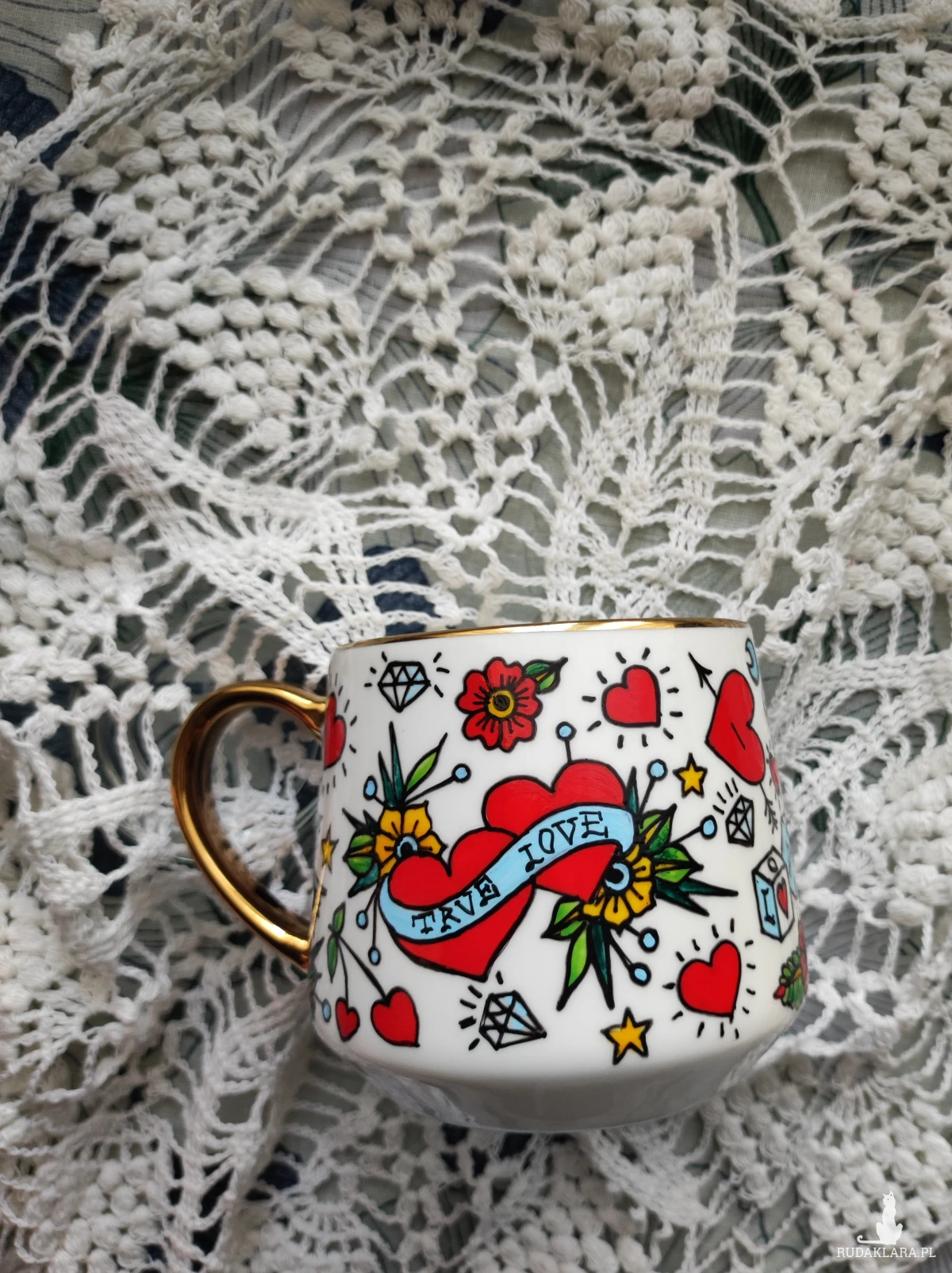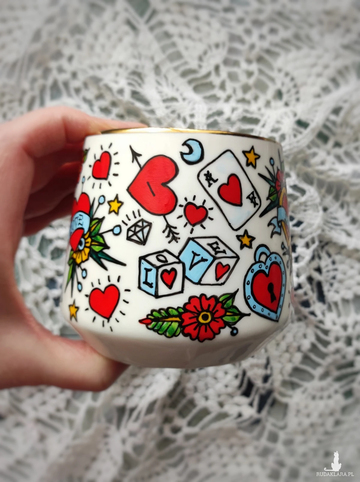 Ręcznie malowany kubek w żywych kolorach, z oryginalnym wzorem będzie doskonałym podarunkiem dla osoby kochającej oryginalne przedmioty. Wzór wykonany został przy użyciu nietoksycznych farb do porcelany, jest wodoodporny - naczynie może być myte ręcznie, bez użycia ostrych narzędzi.