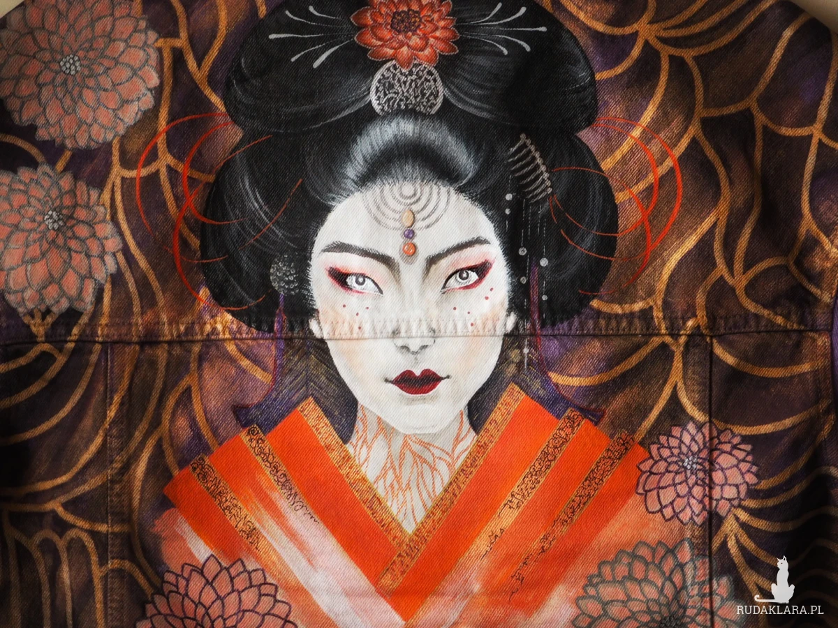Portret tajemniczej gejszy, ozdobiony kwiatami dalii, to wyjątkowo kobiecy projekt.