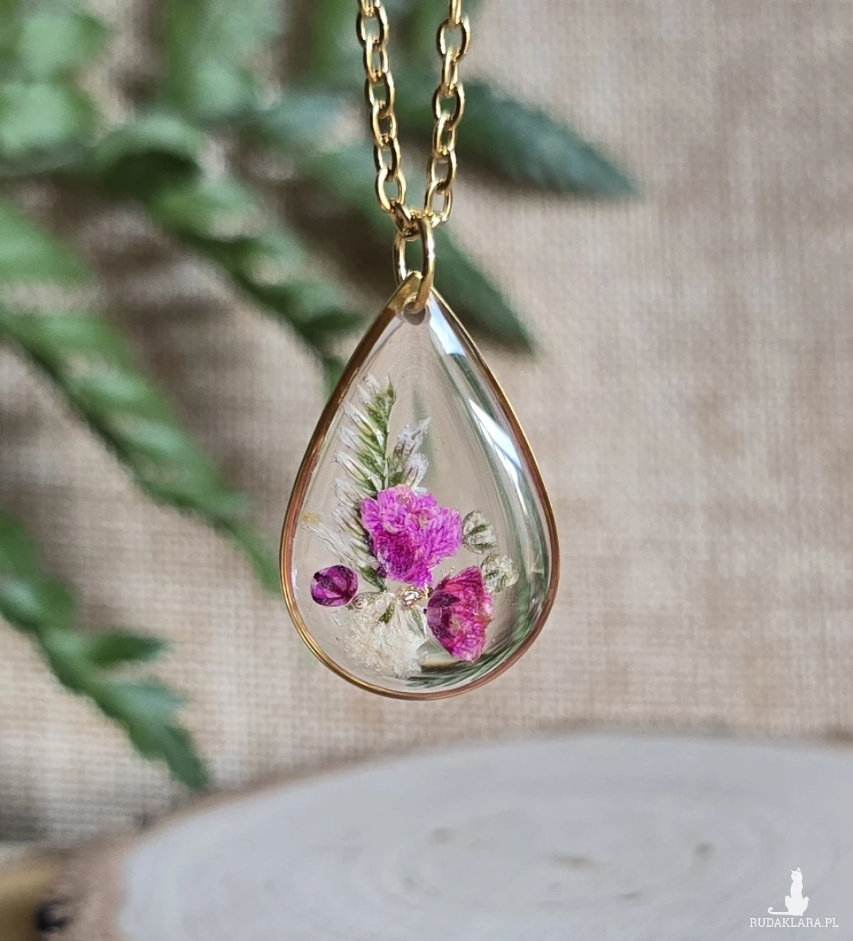 Oferuję Państwu unikalną biżuterię. Zawieszka jest wykonana z suszonych kwiatów i żywicy epoksydowej. Biżuteria jest wspaniałym i oryginalnym prezentem na lata.