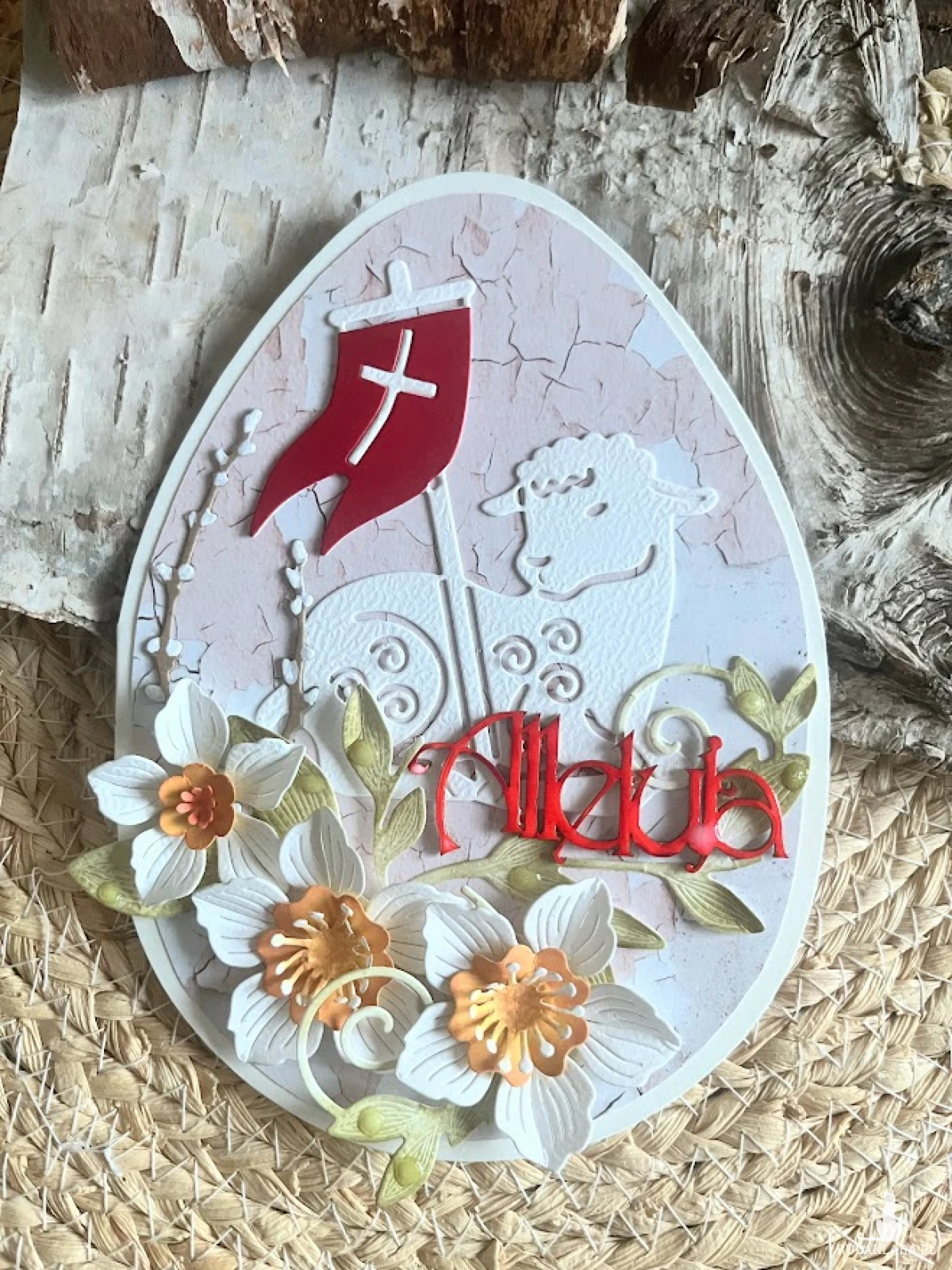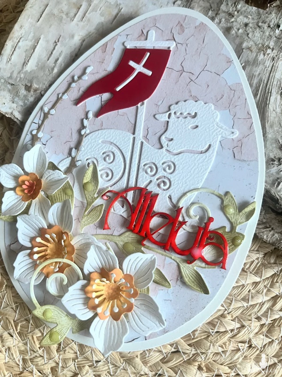 Wyjątkowa, oryginalna kartka w kształcie jajka, na życzenia z okazji Świąt Wielkanocnych. Wykonana z bezkwasowych papierach do scrapbookingu,Ozdobiona barankiem i kwiatami.Całość warstwowa dając efekt 3D. Kartka otwierana, wewnątrz miejsce na wpisanie życzeń.