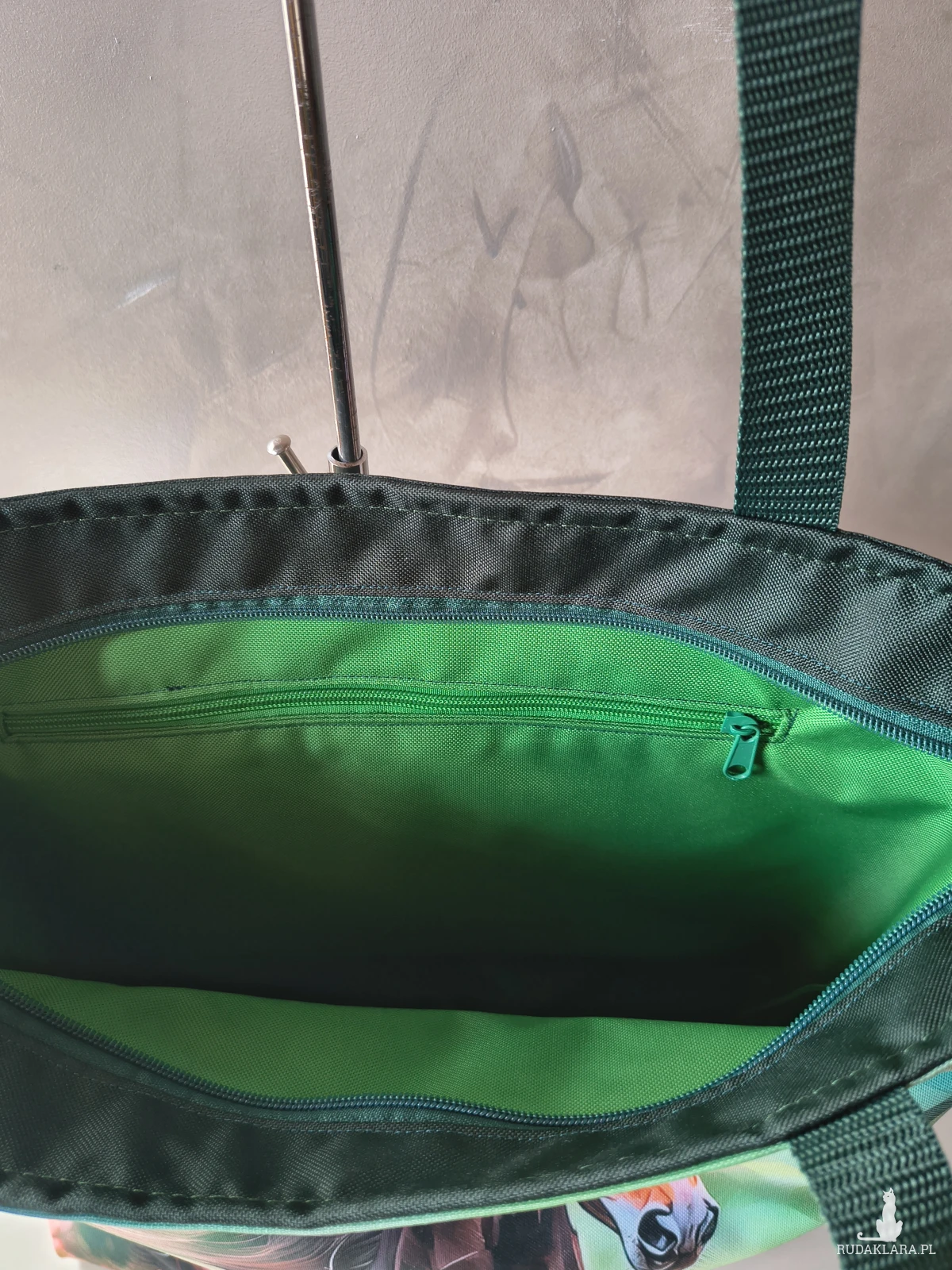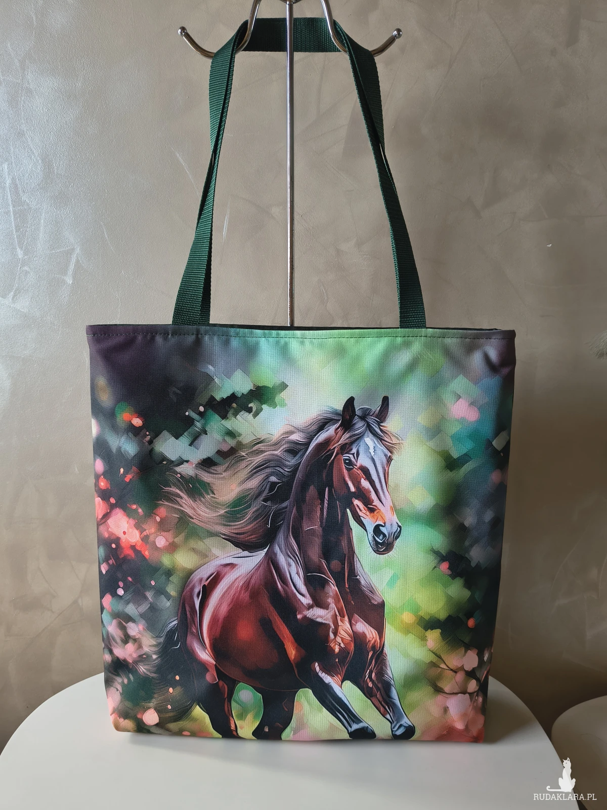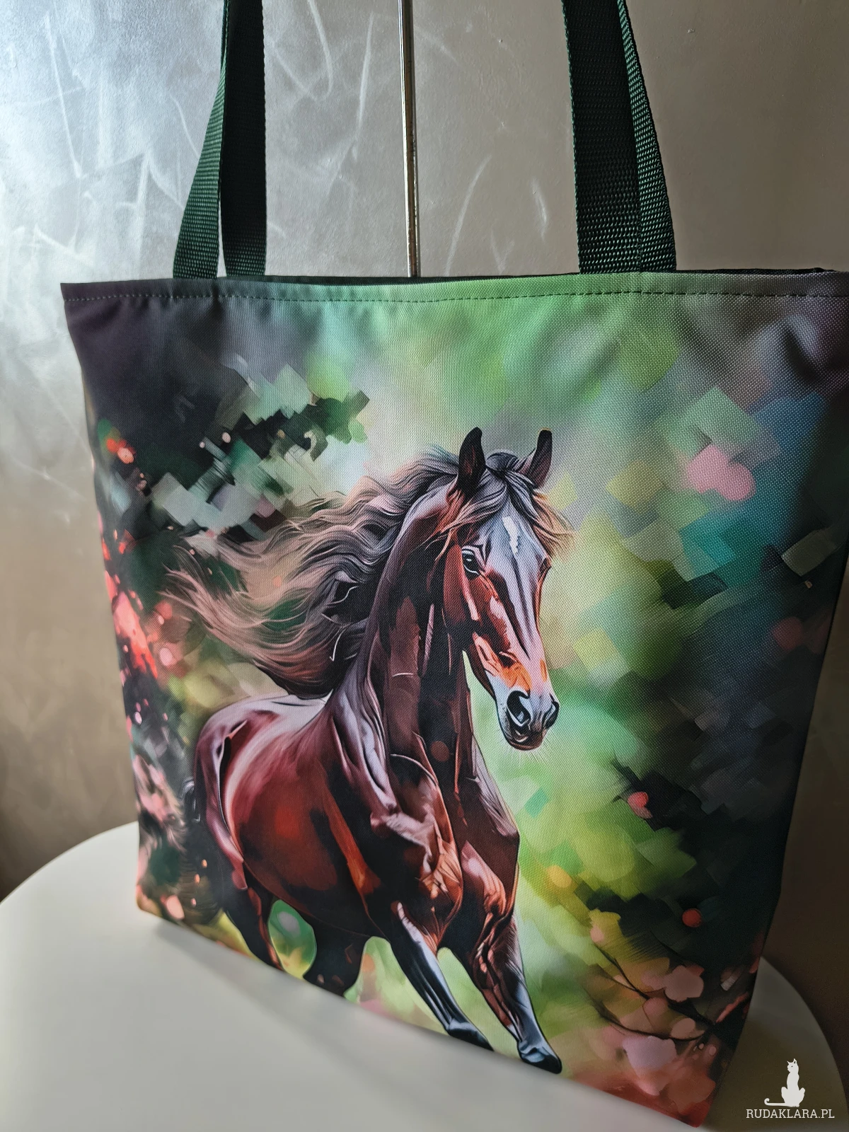To całkiem spora torba, a do tego wytrzymała Wykonana z materiału wodoodpornego, więc nie straszny jej deszcz czy zabrudzenia. Wewnątrz znajduje się wodoodporna podszewka z kieszonką na zamek. Zapinana na zamek. Na przedniej ścianie panel z pięknym koniem. Tył torby butelkowa zieleń..