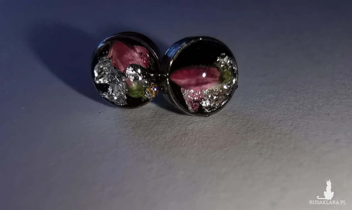 Wyjątkowe, błyszczące się kolczyki z zasuszonymi kwiatkami.