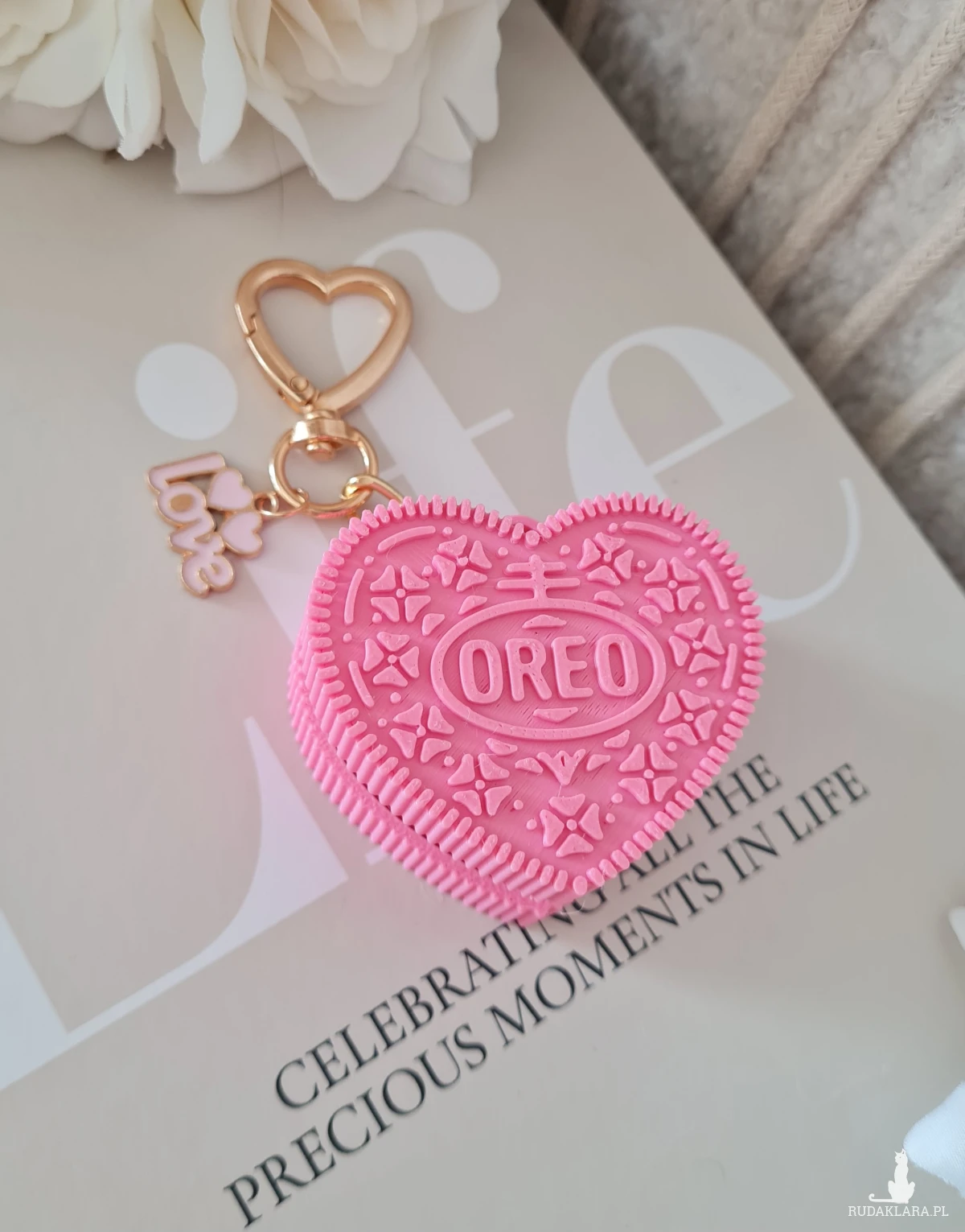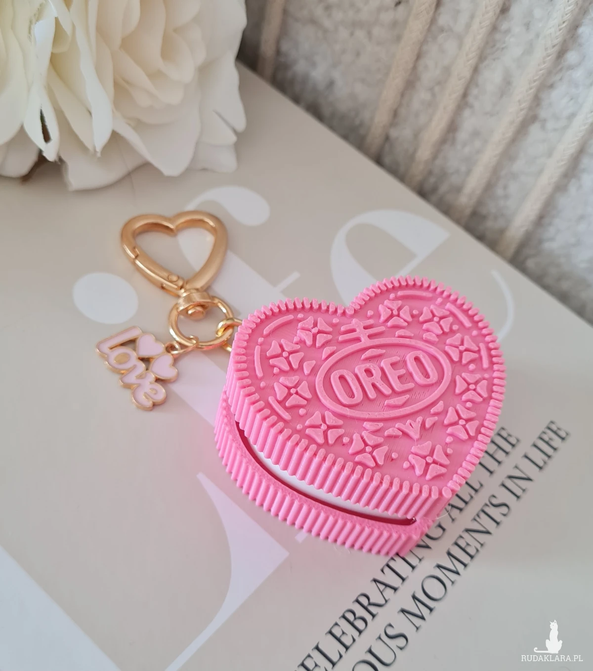 Uroczy breloczek do kluczy lub torebki w kształcie różowego serca z jednej strony z napisem "Love" z drugiej "Oreo" wzorowany na kultowym ciasteczku. Ciasteczko wykonane jest drukiem 3d z wysokiej jakosci biodegradowalnego polilaktydu (PLA), produkowanego z odnawialnych surowców, takich jak trzcina cukrowa czy mączka kukurydziana. Idealny drobiazg który doda odrobiny słodyczy codziennym przedmiotom lub stanie się symbolicznym prezentem prosto z serca ♡