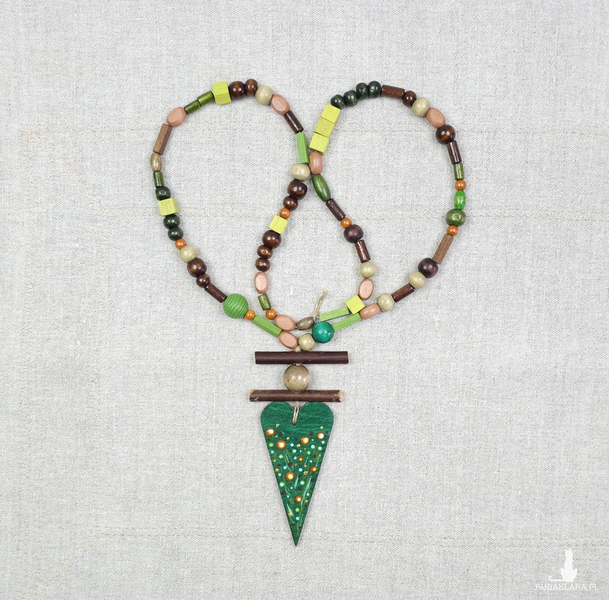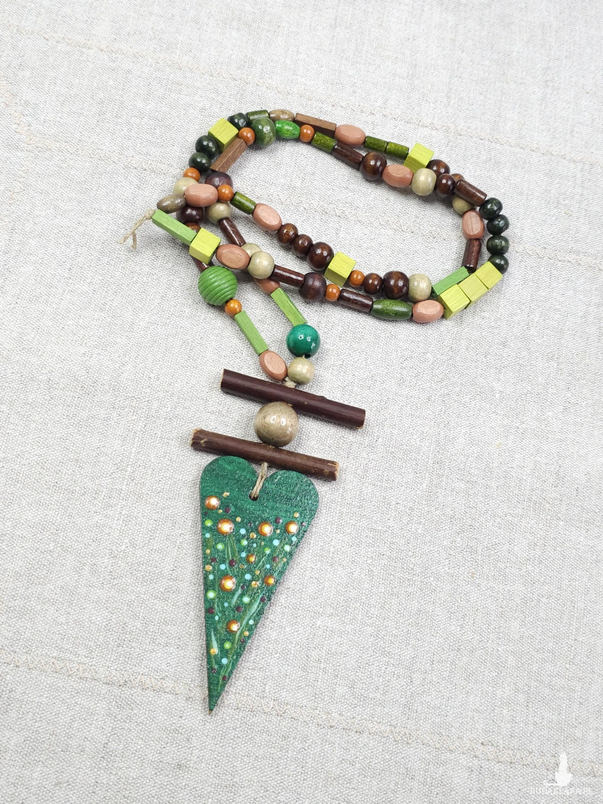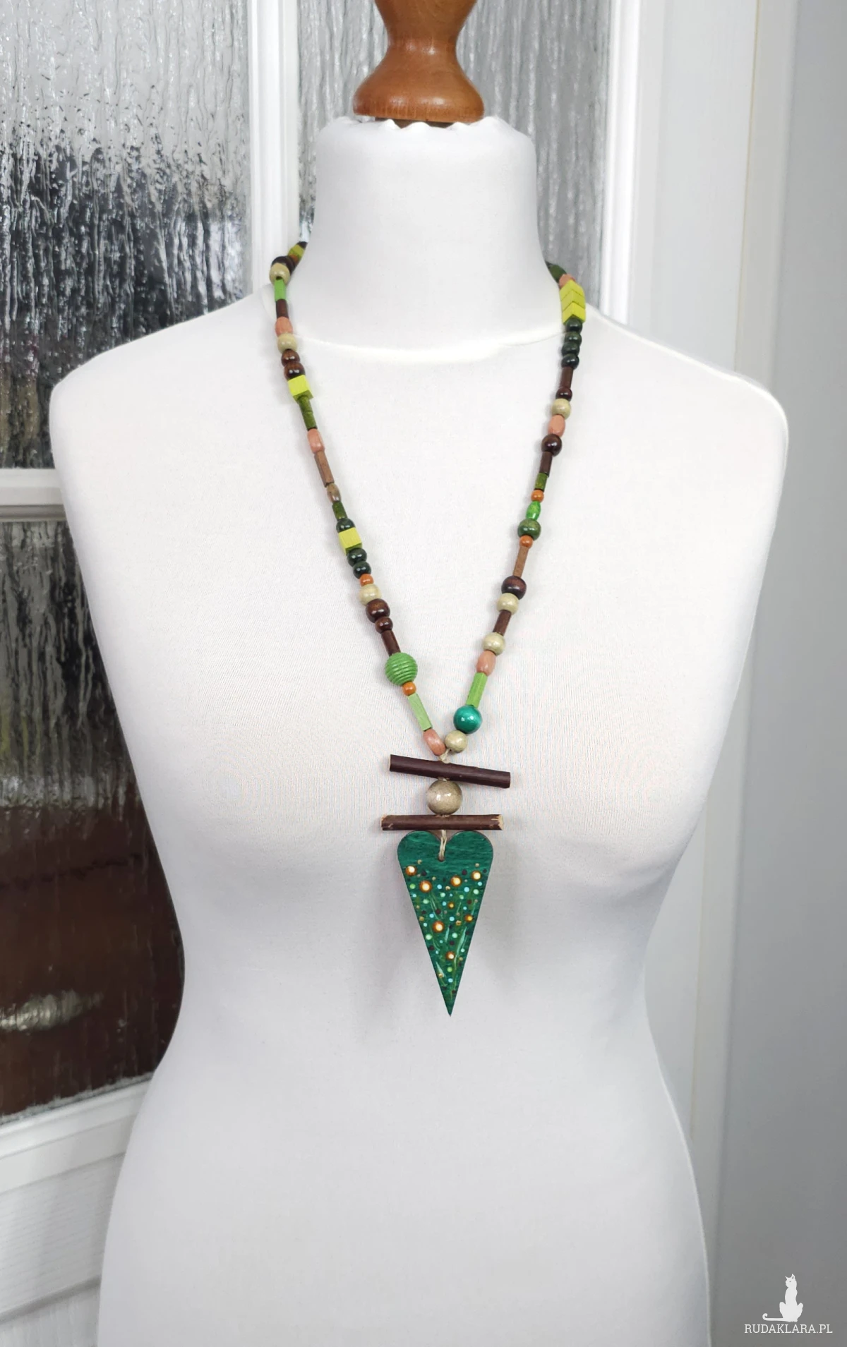 Centralnym punktem jest podłużne, drewniane serce w kolorze głębokiej zieleni. Zostało ono ozdobione ręcznie malowanym wzorem w kropki i motywy roślinne, co nadaje mu unikatowego charakteru.