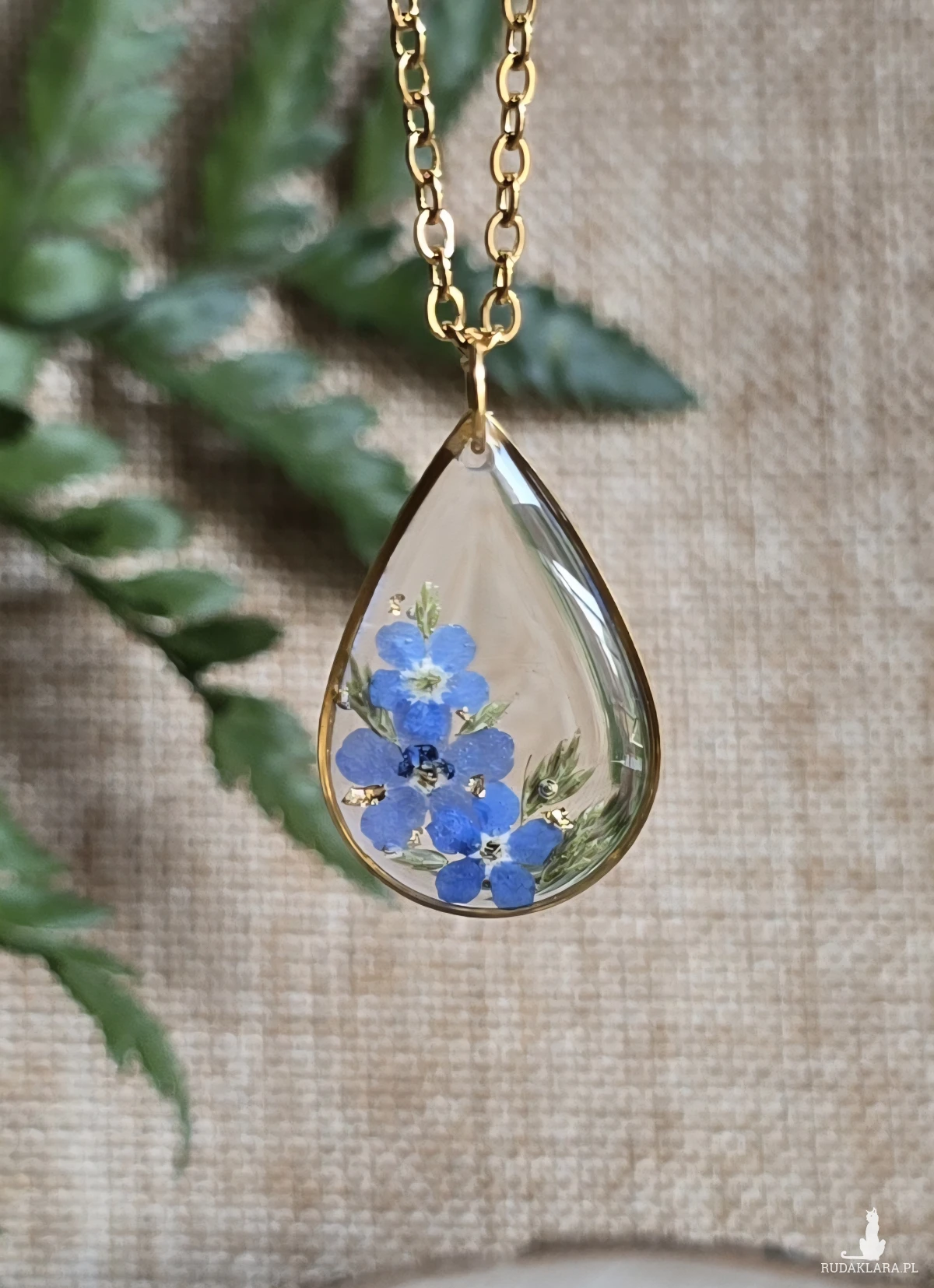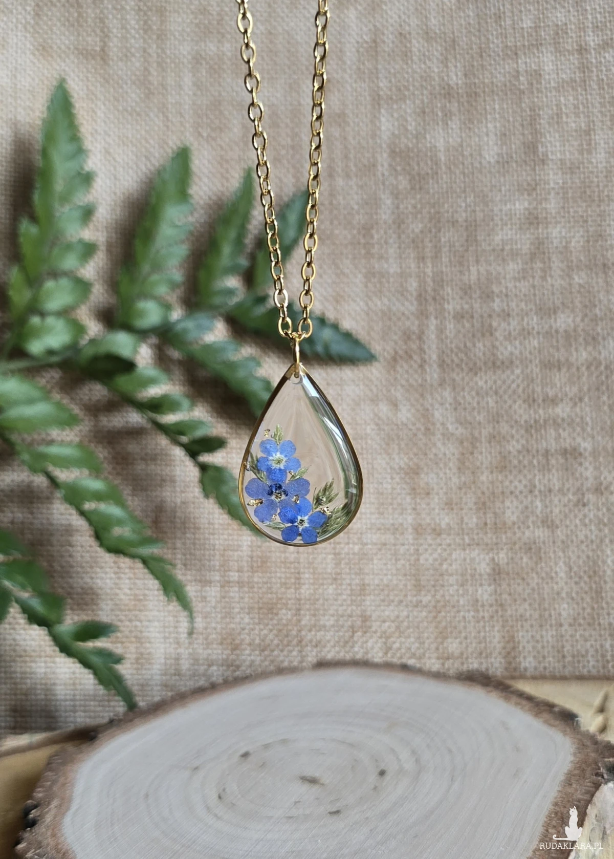 Złota zawieszka złoty wisiorek kwiat naszyjnik żywica z żywicy kwiaty łezka łza niezapominajki