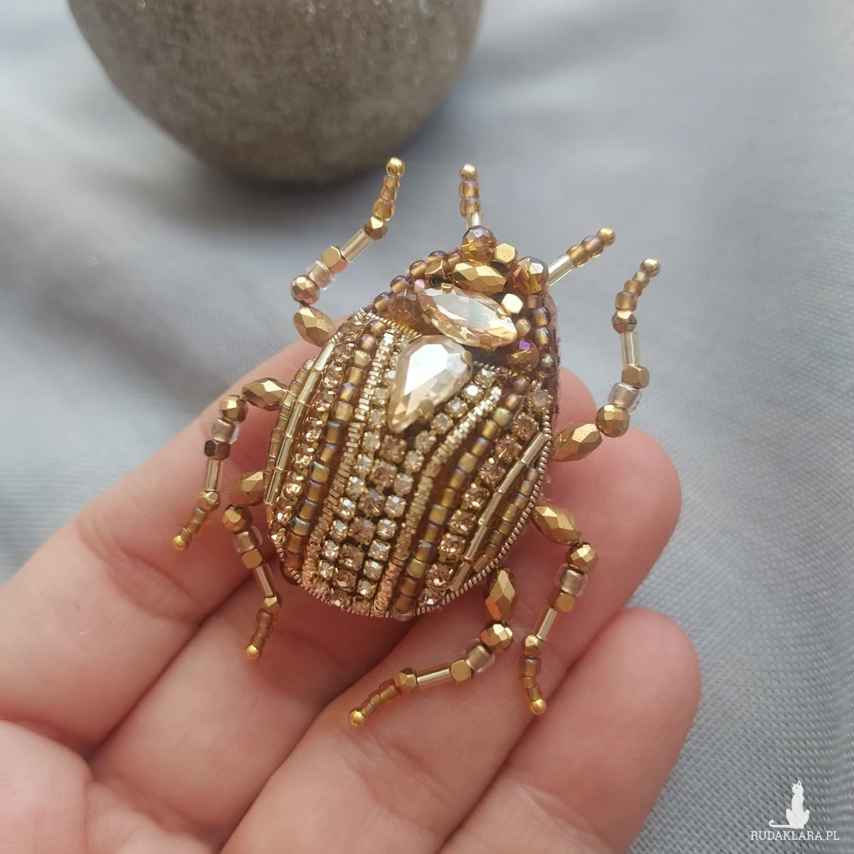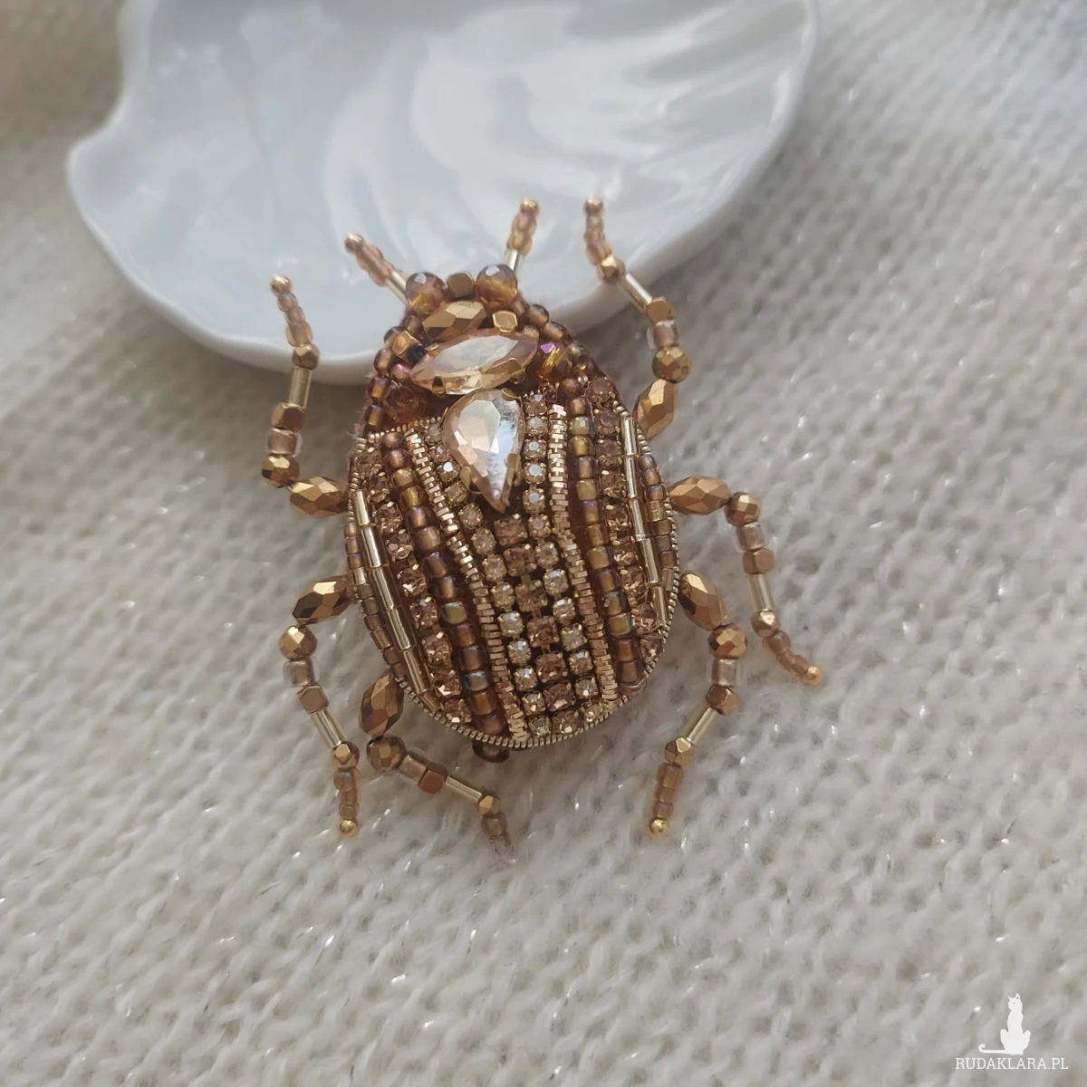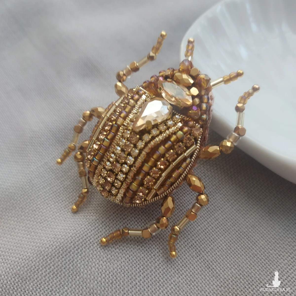 Wyjątkowa, jedyna w swoim rodzaju broszka ŻUCZEK w kolorze złotym przyciągnie uwagę niespotykanym blaskiem koralików oraz kryształków pięknie mieniących się w promieniach wiosenno-letniego słońca.
