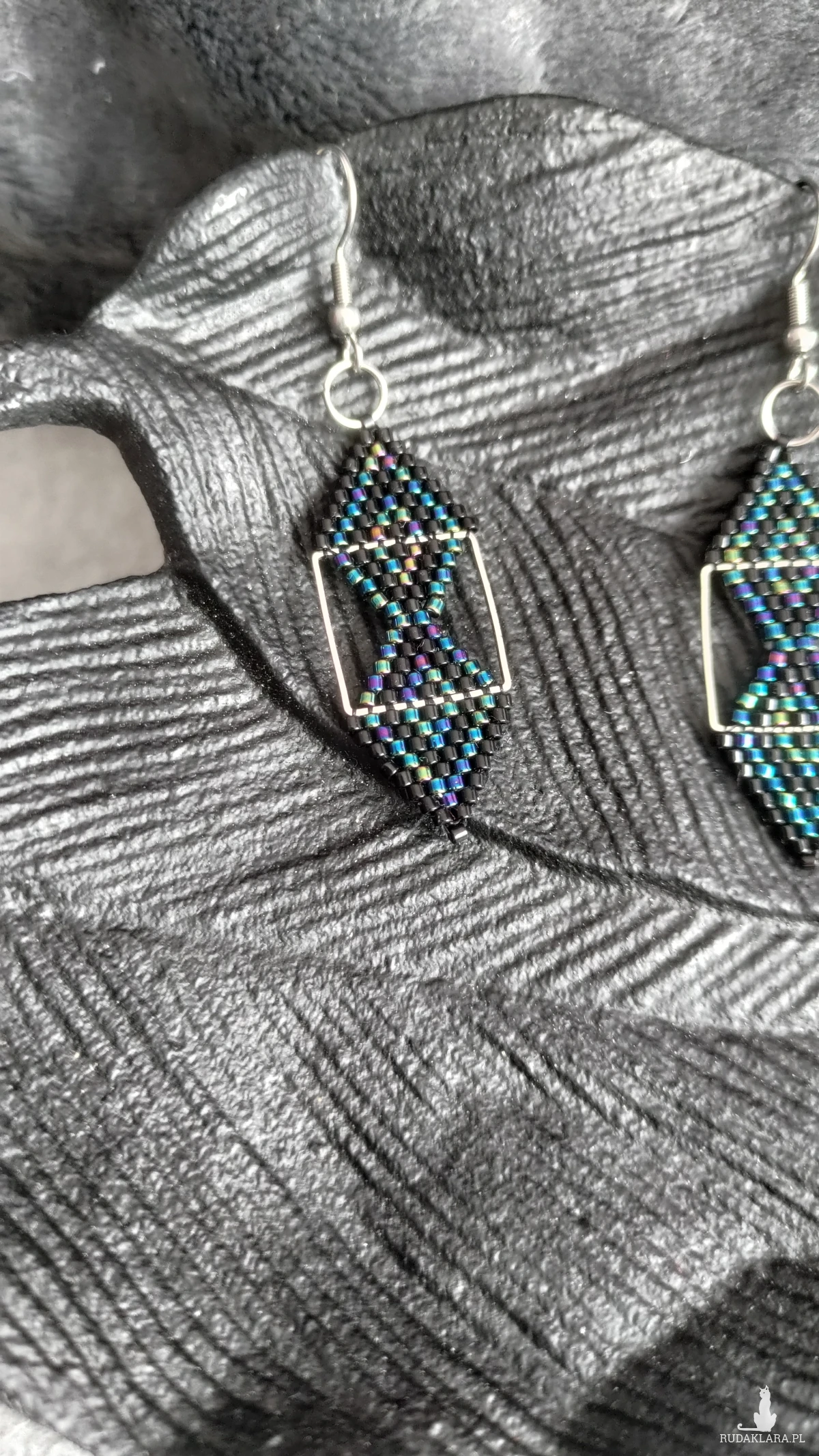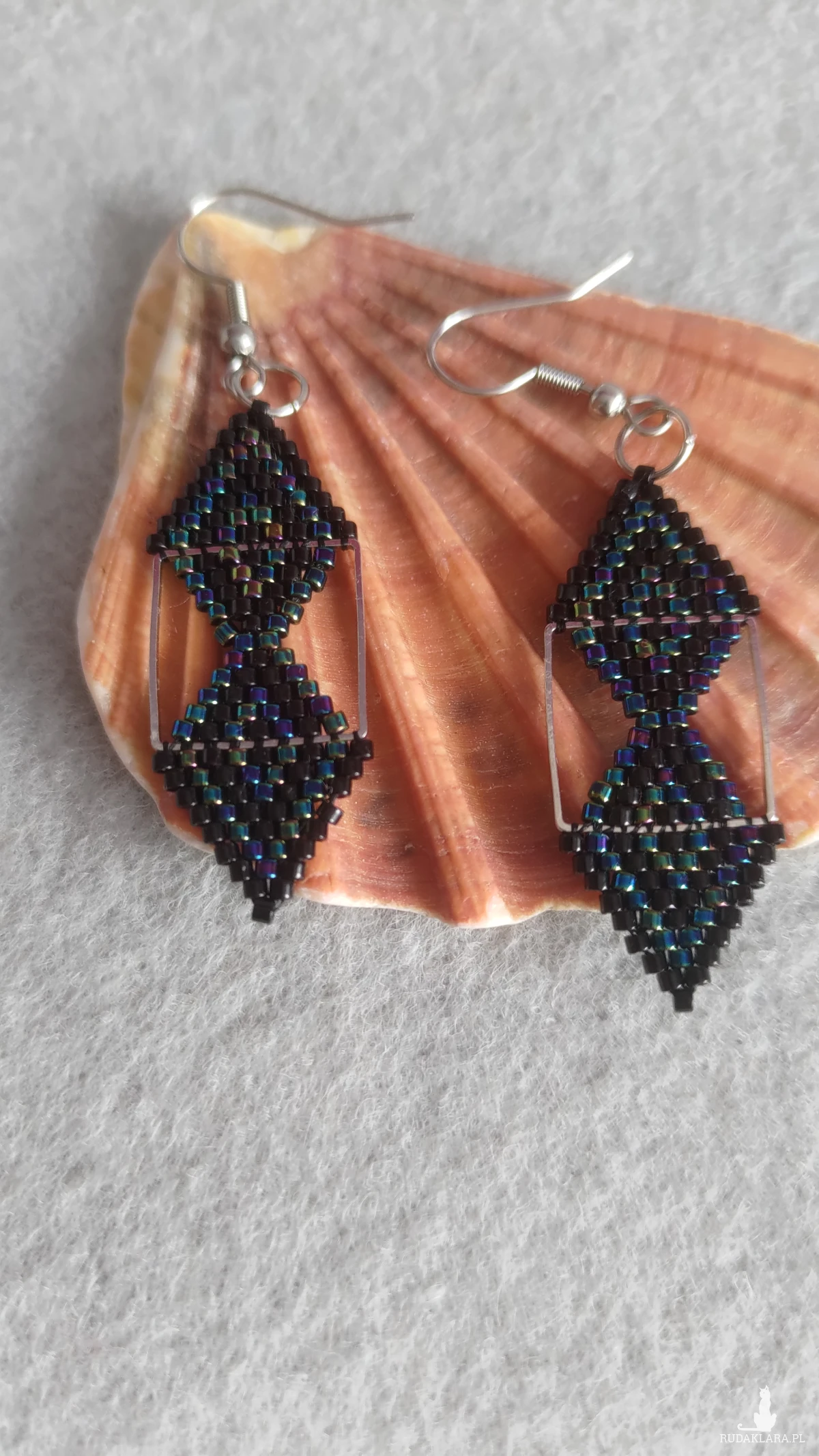 Kolczyki z czarnych i tęczowych koralików myuki, zrobine na kwadratowej, metalowej bazie. Kolczyki są stylowe i nietuzinkowe, pięknie błyszczą w słońcu, dla osób, które lubią zaskakiwać. Kolczyki zawieszone są na biglach ze stali chirurgicznej.