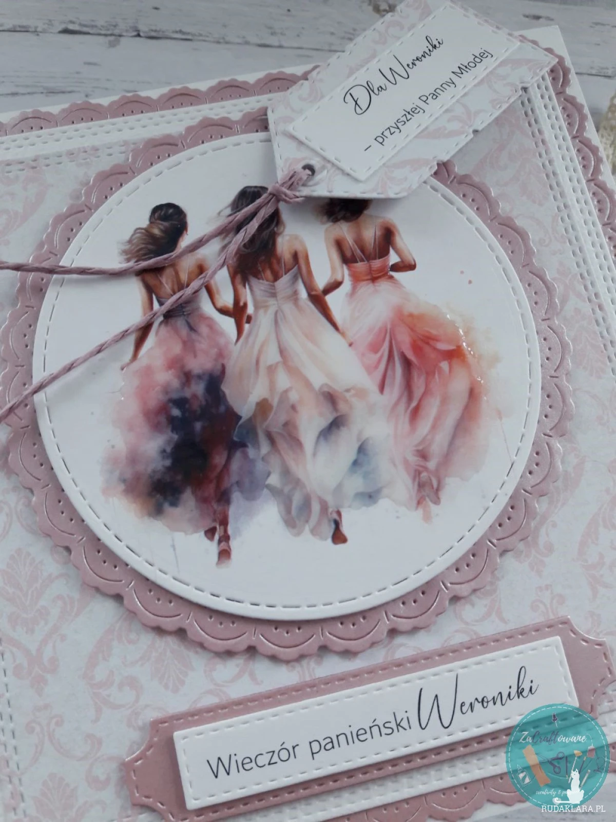 Do kartki dołączam GRATIS w postaci widocznej na zdjęciu etykietki, za pomocą której można podpisać upominek dla przyszłej Panny Młodej i przyczepić ją do wstążki, którą obwiązany jest prezent, za pomocą sznureczka, który również znajduje się w zestawie.