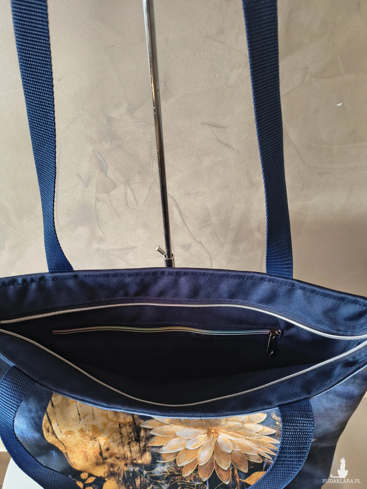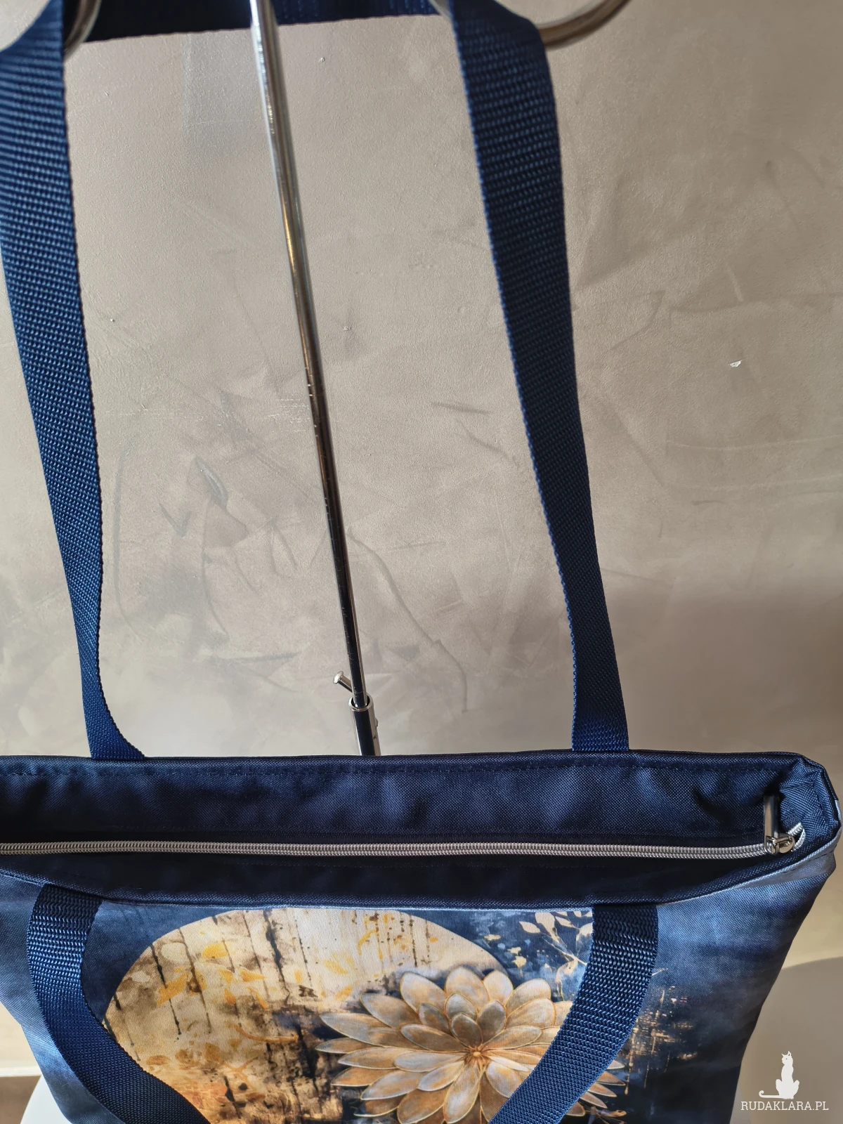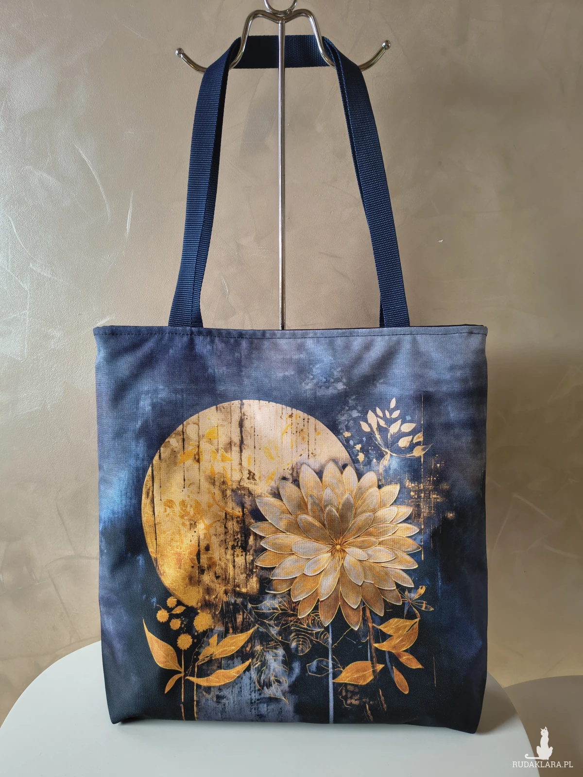 To bardzo pojemna torba, a do tego wytrzymała Wykonana z materiału wodoodpornego, więc nie straszny jej deszcz czy zabrudzenia. Wewnątrz znajduje się wodoodporna podszewka z kieszonką na zamek. Torba zapinana na zamek. Na przedniej ścianie panel z kwiatami na tle księżyca. Tył torby granatowy.