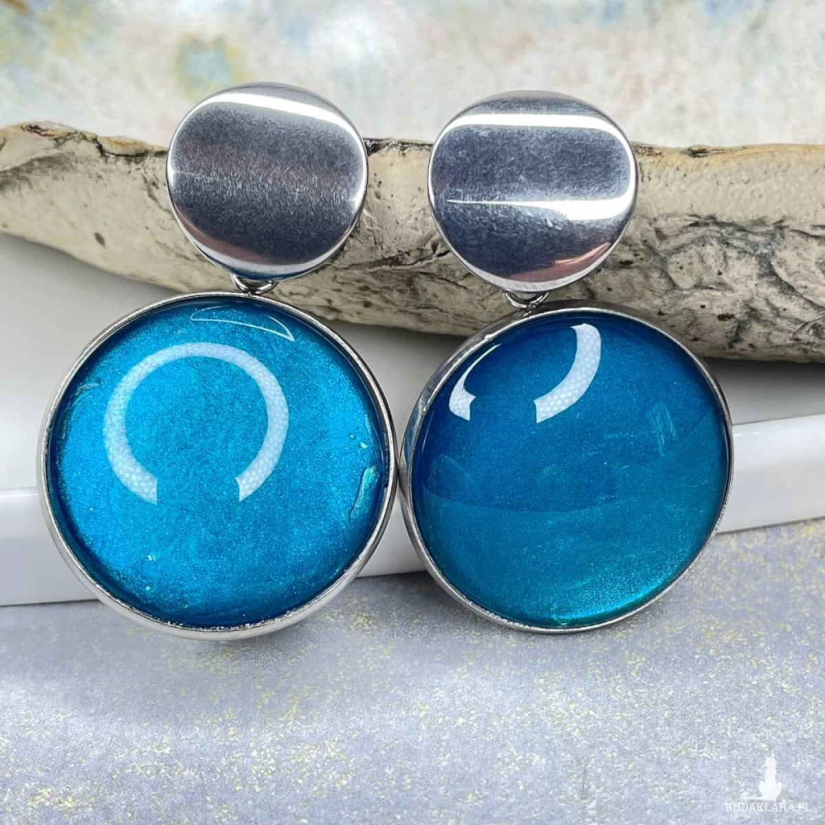 Te pełne blasku kolczyki są częścią kolekcji “W blasku perłowego księżyca”. Kolczyki wykonane są z ręcznie malowanych kaboszonów umieszczonych w bazach ze stali szlachetnej. Szklane elementy zachwycają subtelnym, opalizującym blaskiem, który jest niczym odbicie księżyca na tafli wody. Kolczyki mienią się w świetle, przyciągając wzrok i dodają elegancji każdej stylizacji. Ten dodatek jest idealny dla osób ceniących sobie wyrafinowaną i ponadczasową biżuterię.