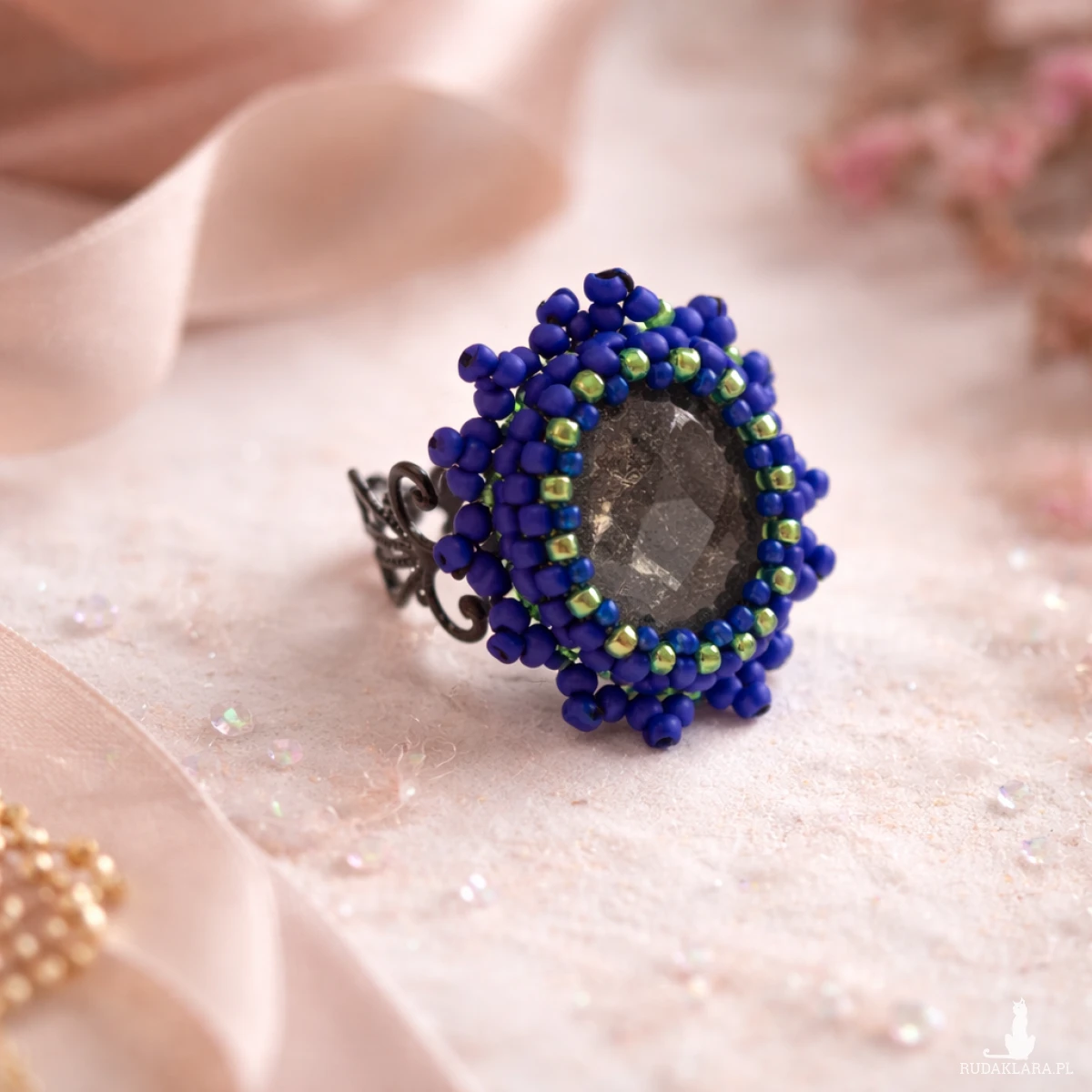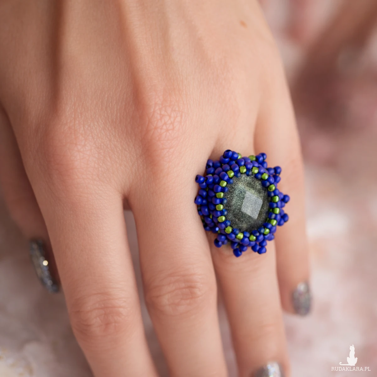 Aurora Noctis to wyjątkowy pierścionek handmade wykonany techniką haftu koralikowego. Kompozycja matowych fioletowych i błyszczących zielonych koralików tworzy efekt subtelnego kontrastu inspirowanego nocnym światłem i aurą polarnej poświaty.