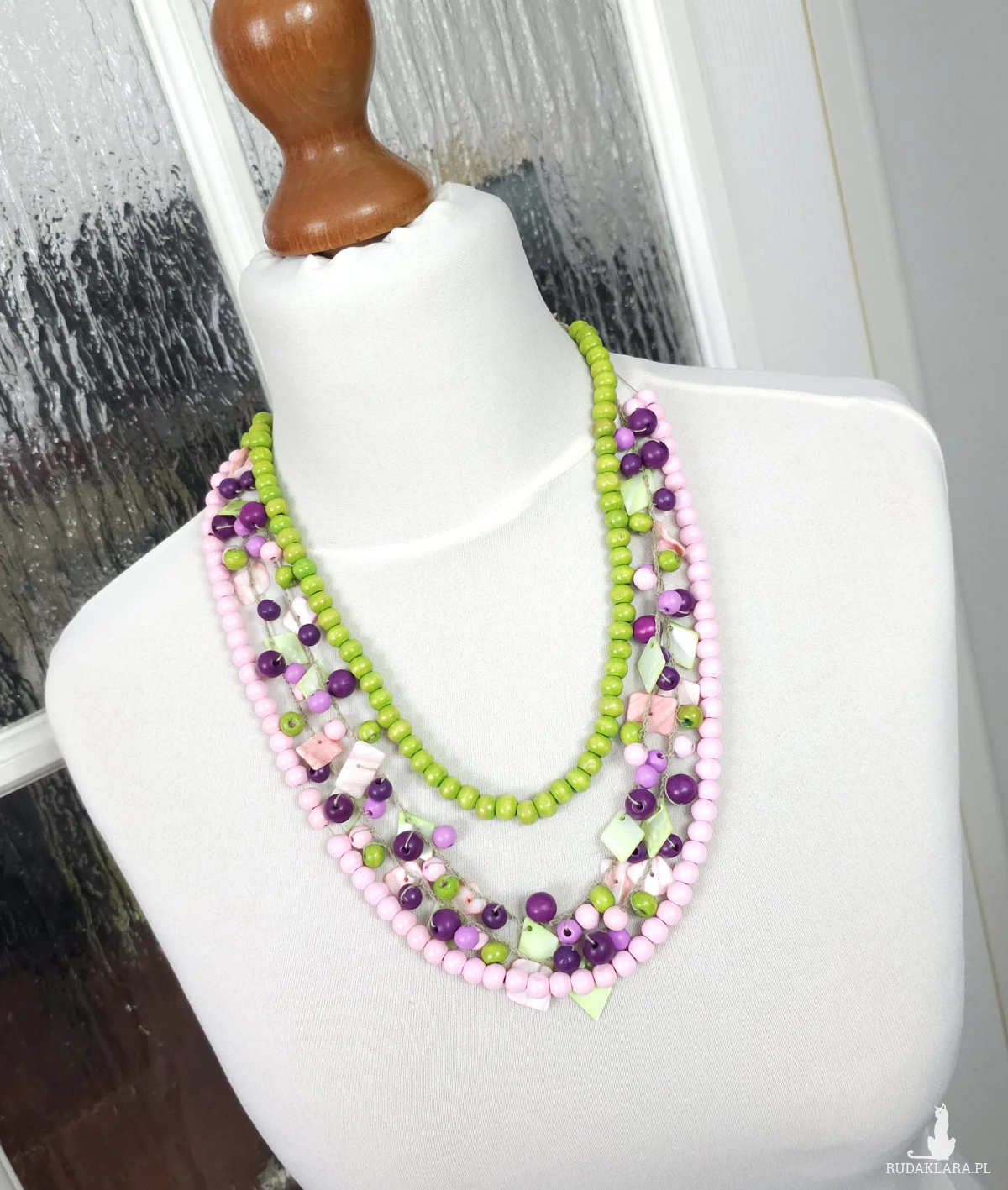 Wielowarstwowy naszyjnik wykonany z naturalnych materiałów: barwionego drewna, muszli oraz masy perłowej.