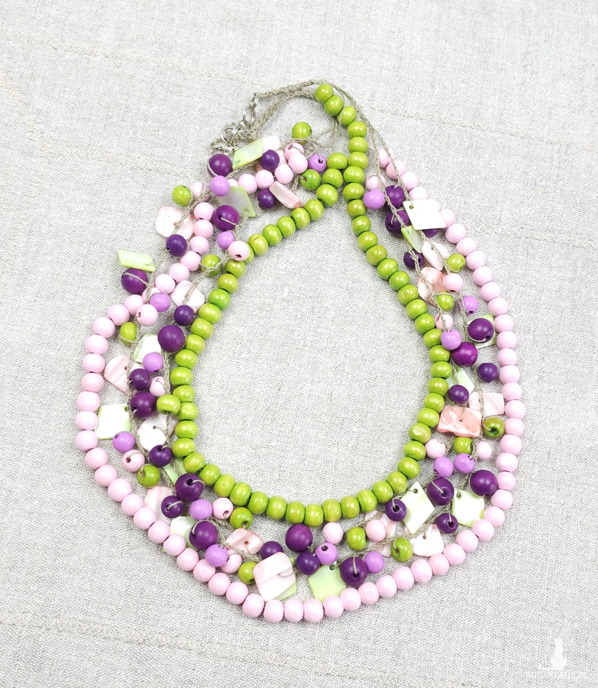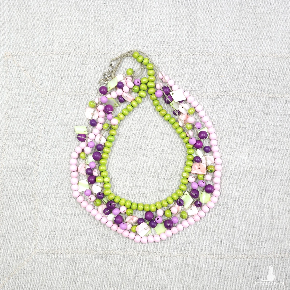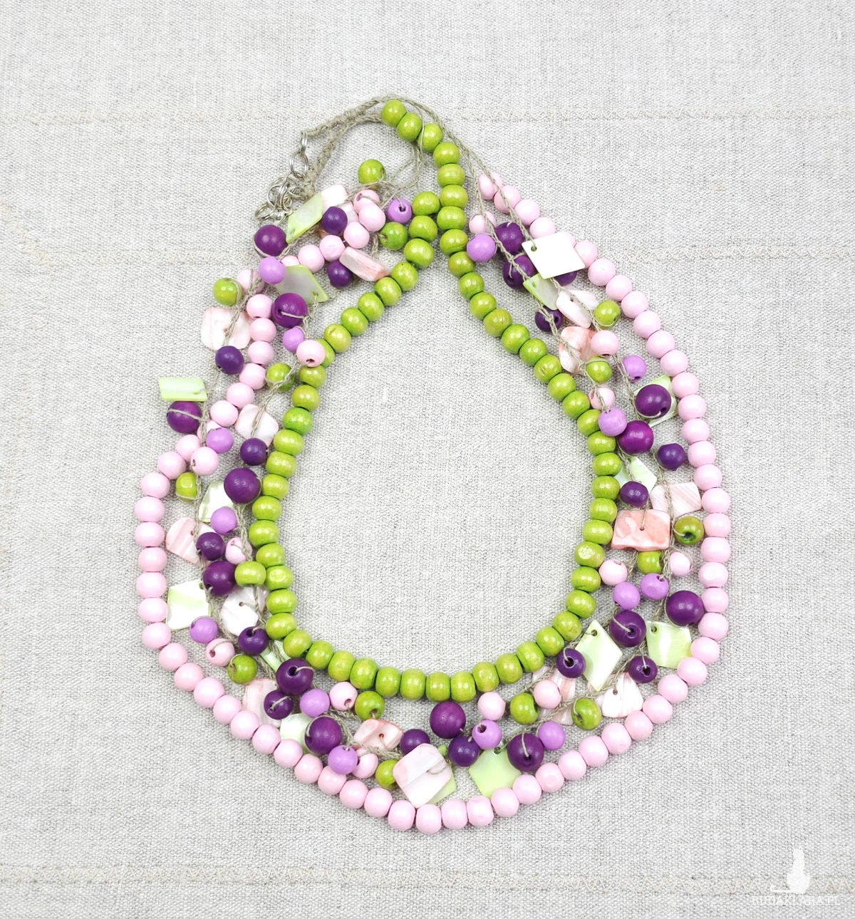 7030 Naszyjnik boho z drewna i muszli – len, masa perłowa, róż i zieleń