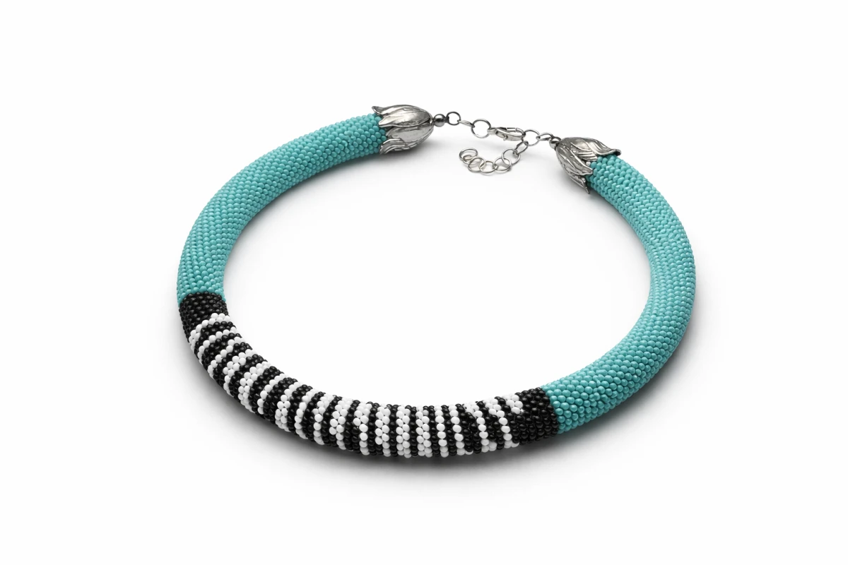 Dodaj koloru i wyrazistości swojej stylizacji dzięki unikatowemu naszyjnikowi wykonanemu techniką sznura szydełkowo-koralikowego. To idealne połączenie nowoczesnego designu z precyzyjnym rękodziełem. Centralnym punktem naszyjnika jest kontrastowy, czarno-biały motyw pasów przypominający zebrę, który płynnie przechodzi w soczysty, turkusowy błękit. Całość została wykończona eleganckimi elementami w kolorze srebra – ozdobne końcówki w kształcie tulipanów dodają mu romantycznego, a zarazem luksusowego charakteru. Wykonany z tysięcy drobnych koralików szklanych, co zapewnia piękny połysk i trwałość. Naszyjnik jest lekki, elastyczny i przyjemny dla skóry. Wyposażony w solidne zapięcie typu karabińczyk z łańcuszkiem przedłużającym, co pozwala na idealne dopasowanie długości. Doskonale sprawdzi się zarówno do białej koszuli, jak i letniej sukienki czy casualowego t-shirtu.