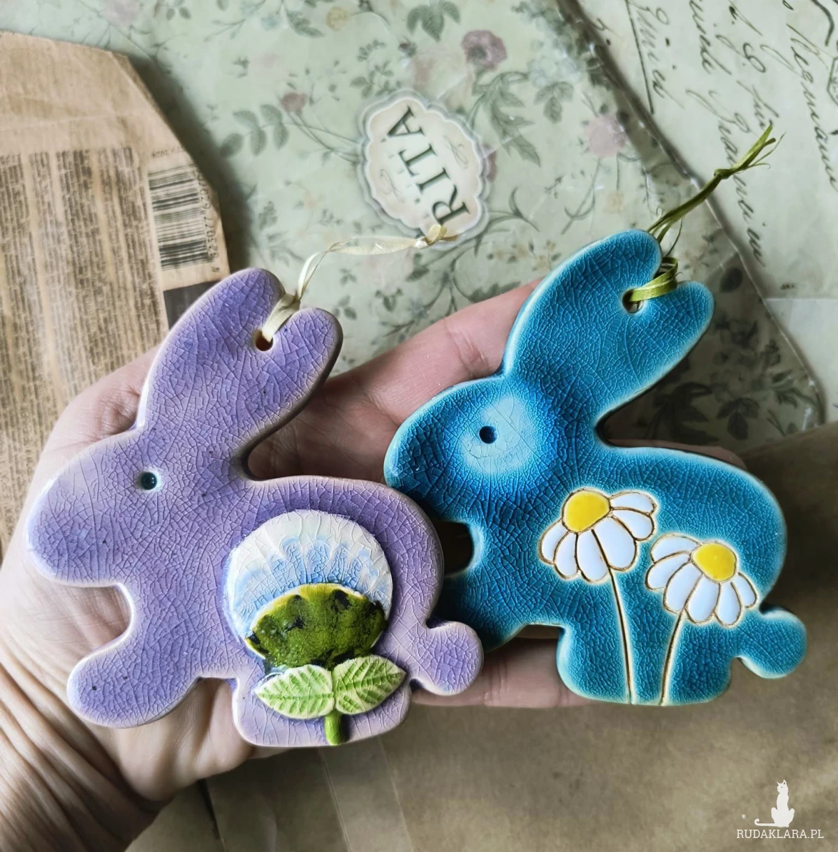 Zestaw 2 zajączków, wykonanyz gliny szamotowej, wypalony na biskwit, a następnie szkliwiony w tem. 1260 st. Wymiary ok 9cm x 9,5 cm. Idealne do ozdoby domu na Wielkanoc lub jako upominek. Serdecznie polecam.