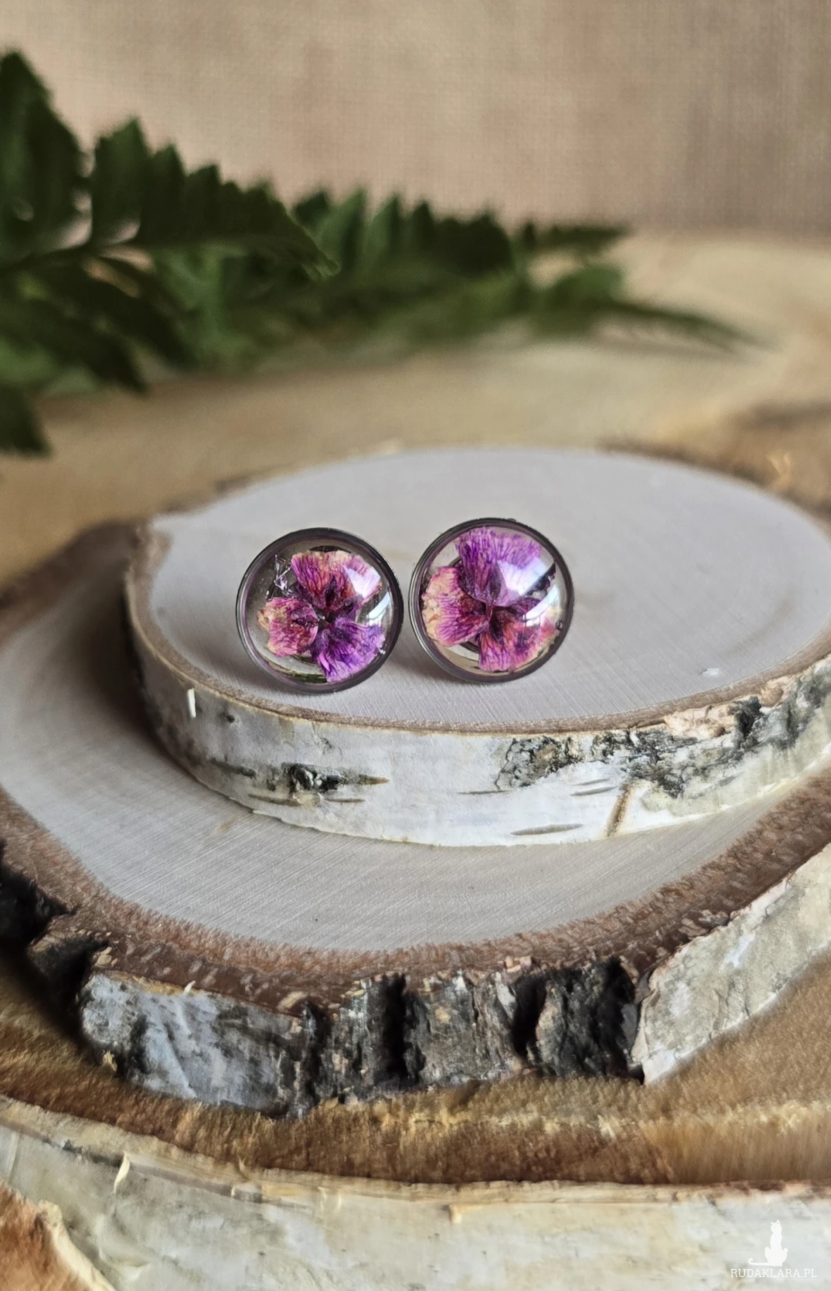 Srebrne kolczyki z fioletowymi kwiatami małe wkręty sztyfty z żywicy żywica epoksydowa z suszonymi prawdziwymi kwiatami
