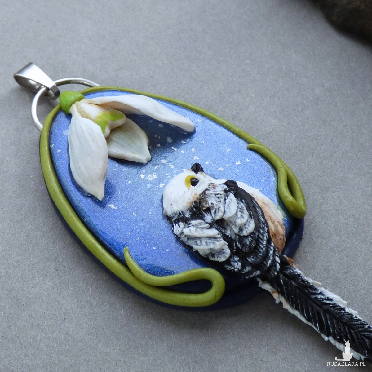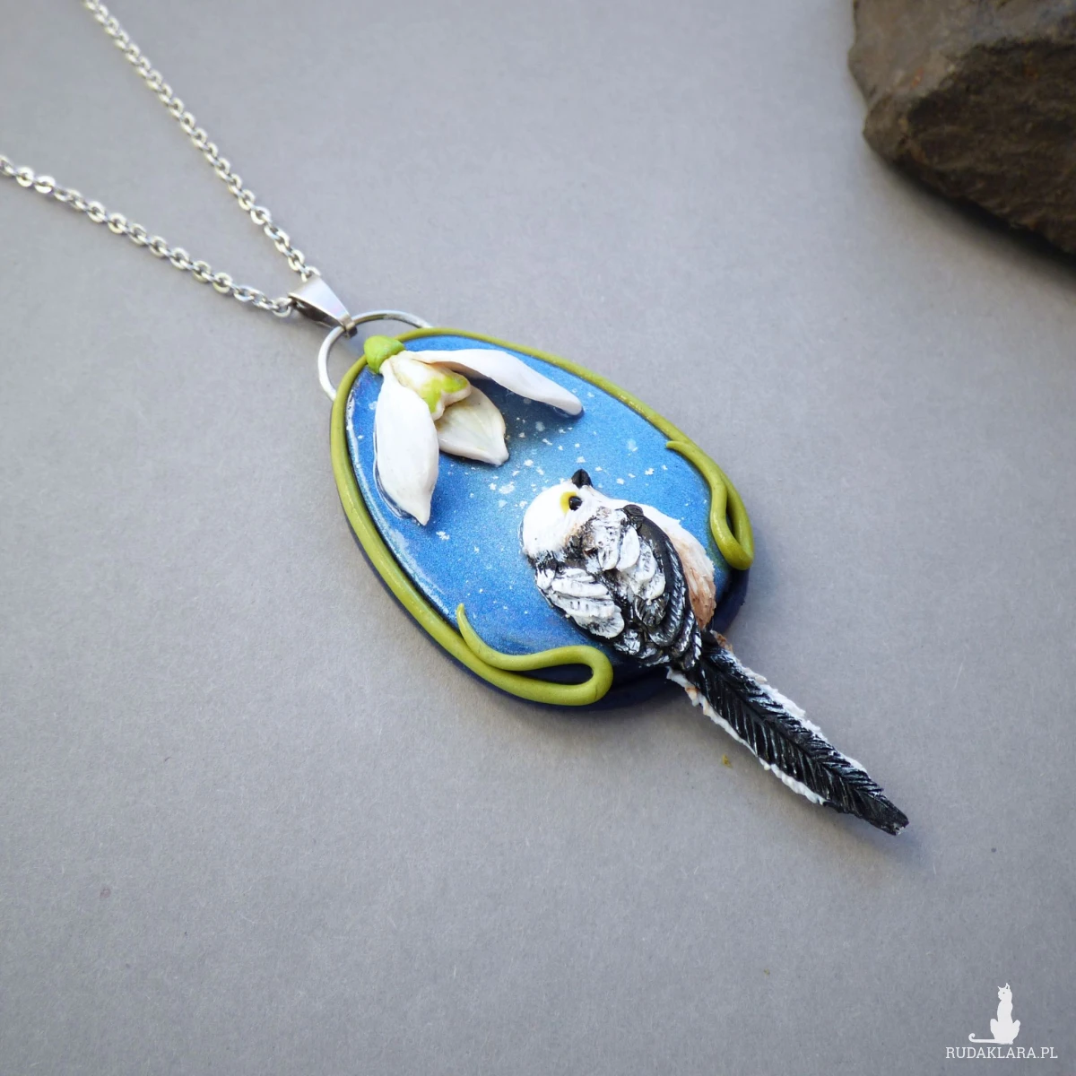 Materiały: glinka polimerowa (modelina Fimo), metalowa baza (stal szlachetna), farby akrylowe, lakier fimo, czarny onyks kulka 2mm (oko ptaka), łańcuszek ze stali szlachetnej.