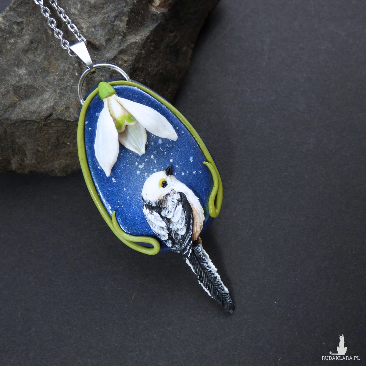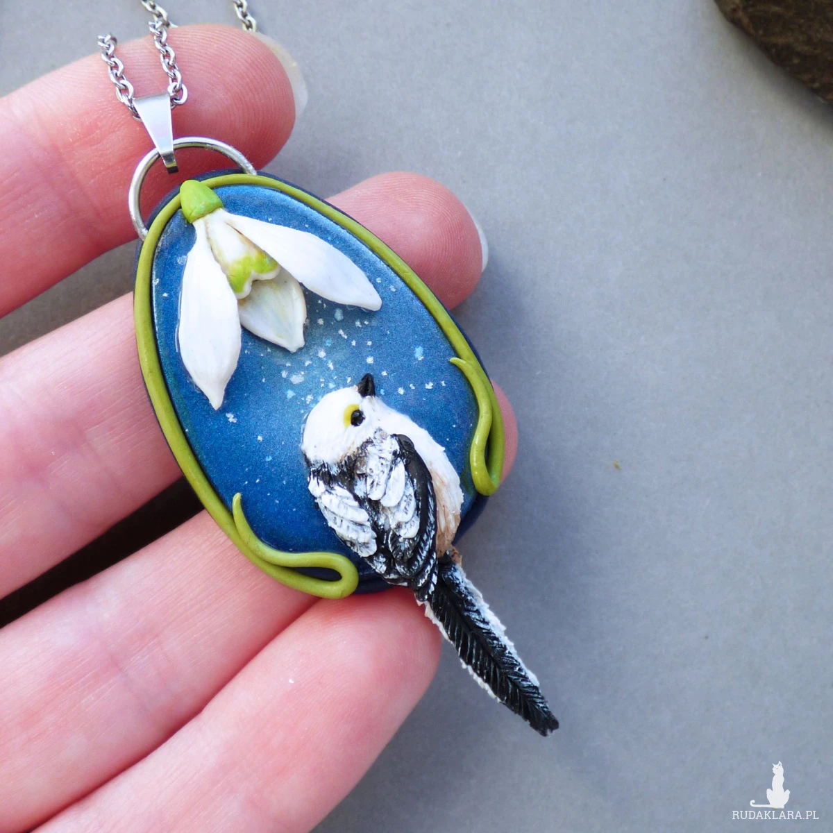 Unikatowy naszyjnik inspirowany końcówką zimy i pierwszymi oznakami wiosny. Na głębokim, granatowym tle znajduje się ręcznie wyrzeźbiony kwiat przebiśniegu, a poniżej – raniuszek (uroczy, puchaty ptaszek z długim ogonkiem). Tło zostało pokryte błyszczącym lakierem, dzięki czemu daje efekt lodowej tafli i pięknie odbija światło – jak zimny poranek, kiedy wiosna dopiero „puka” do drzwi.