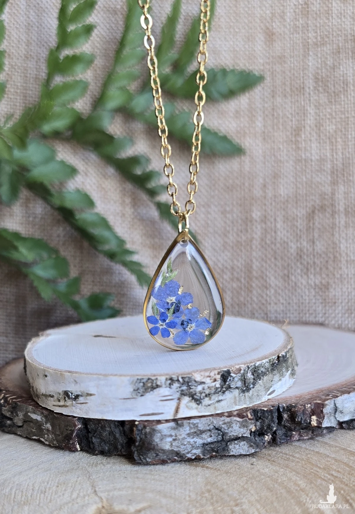 Złota zawieszka złoty wisiorek kwiat naszyjnik żywica z żywicy kwiaty łezka łza niezapominajka niezapominajki