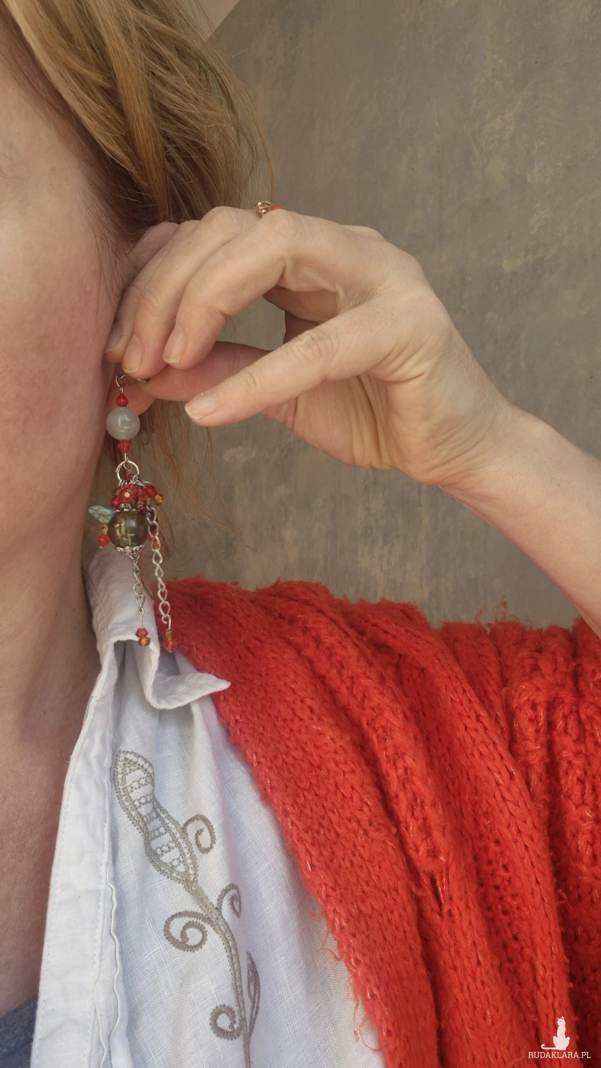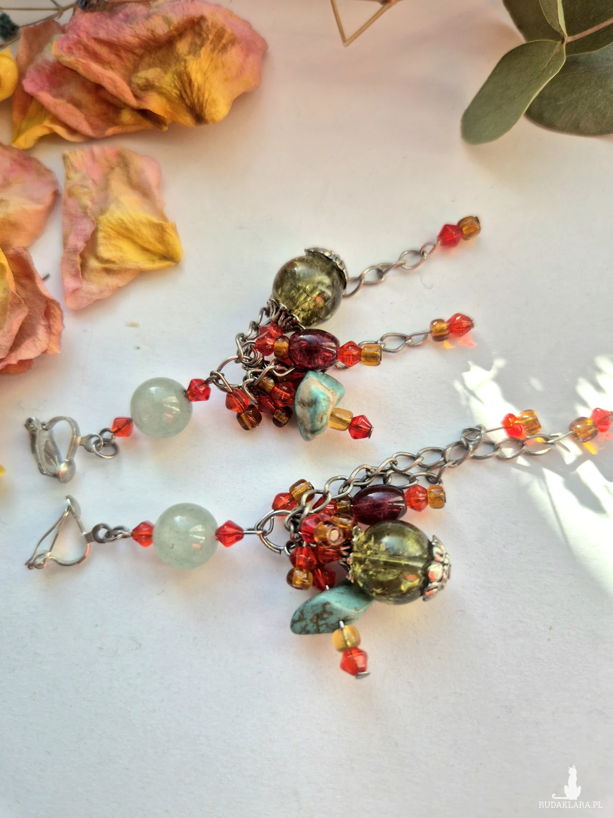 Klipsy : pasikonik nóżką tupał kiedy króla chrząszczy chrupał.Klipsy kolorowy lekkie długie wiszące rękodzieło wykonane w pojedynczym egzemplarzu Box X1