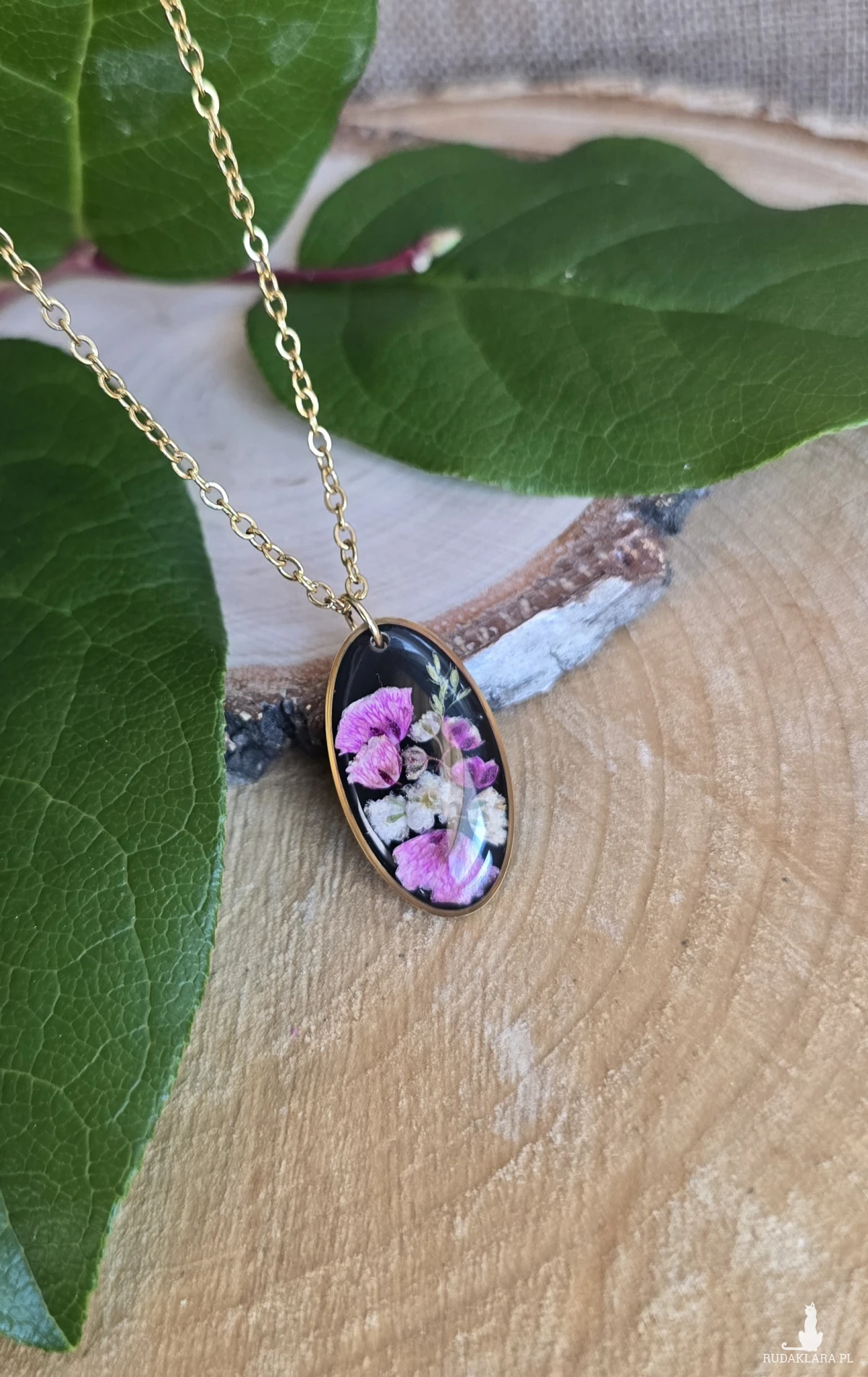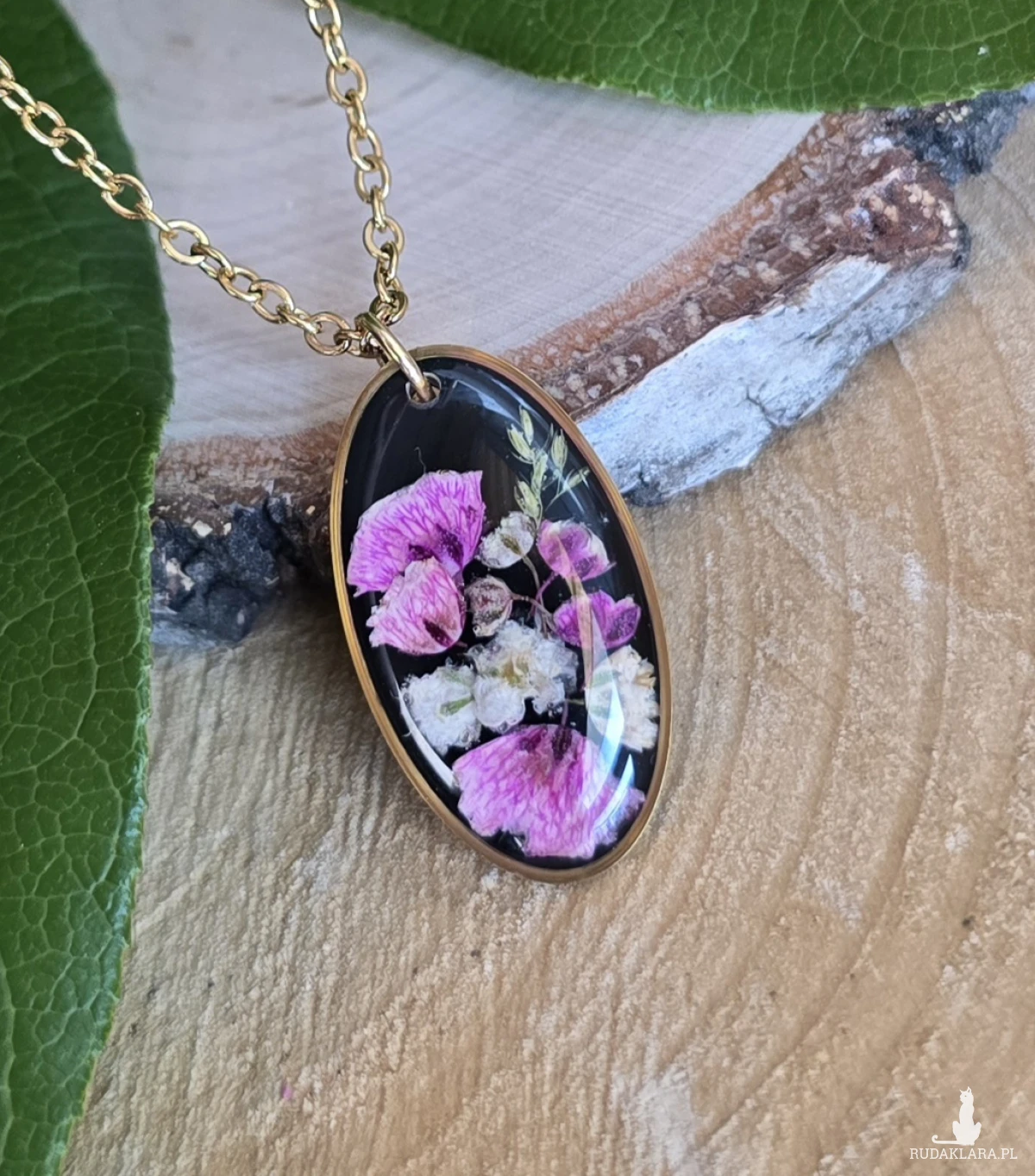 Oferuję Państwu unikalną biżuterię. Zawieszka jest wykonana z suszonych kwiatów i żywicy epoksydowej. Biżuteria jest wspaniałym i oryginalnym prezentem na lata.