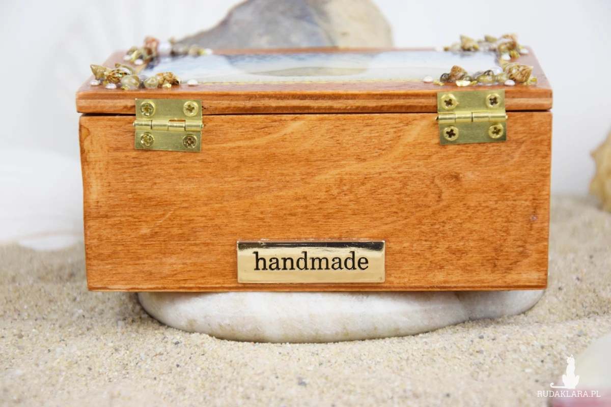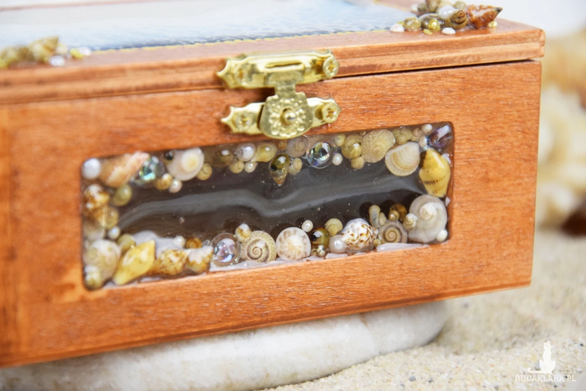 Z przodu szkatułki umieszczono dekoracyjne okienko, w którym znajduje się starannie ułożona kompozycja z muszli, bursztynów, pereł oraz elementów ozdobnych. Dla trwałości i ochrony wszystkie muszle zostały pokryte warstwą żywicy, dzięki czemu są zabezpieczone przed uszkodzeniami.