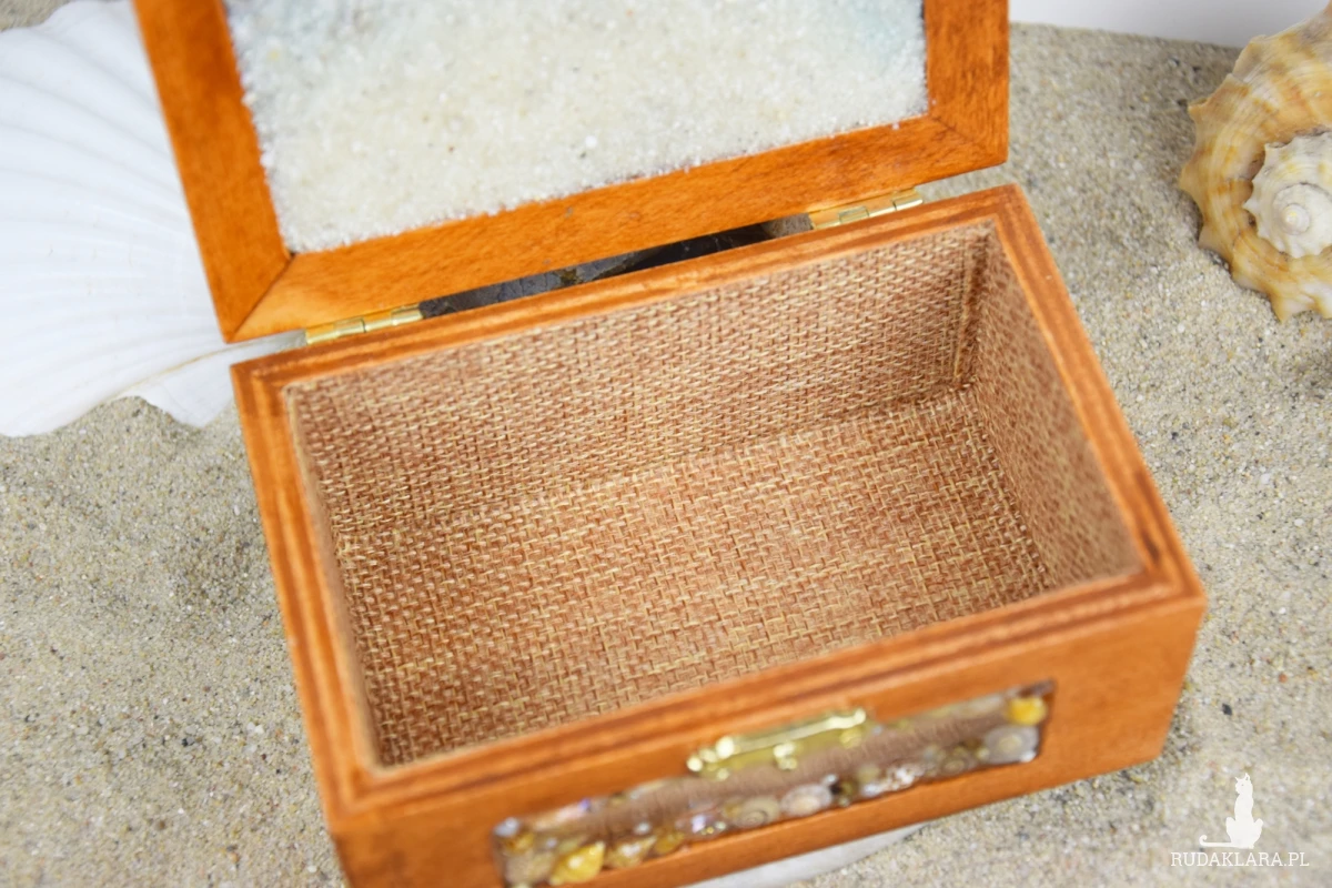 Wnętrze szkatułki wyłożono tkaniną przypominającą jutę, która pięknie komponuje się z naturalnym, morskim charakterem dekoracji.