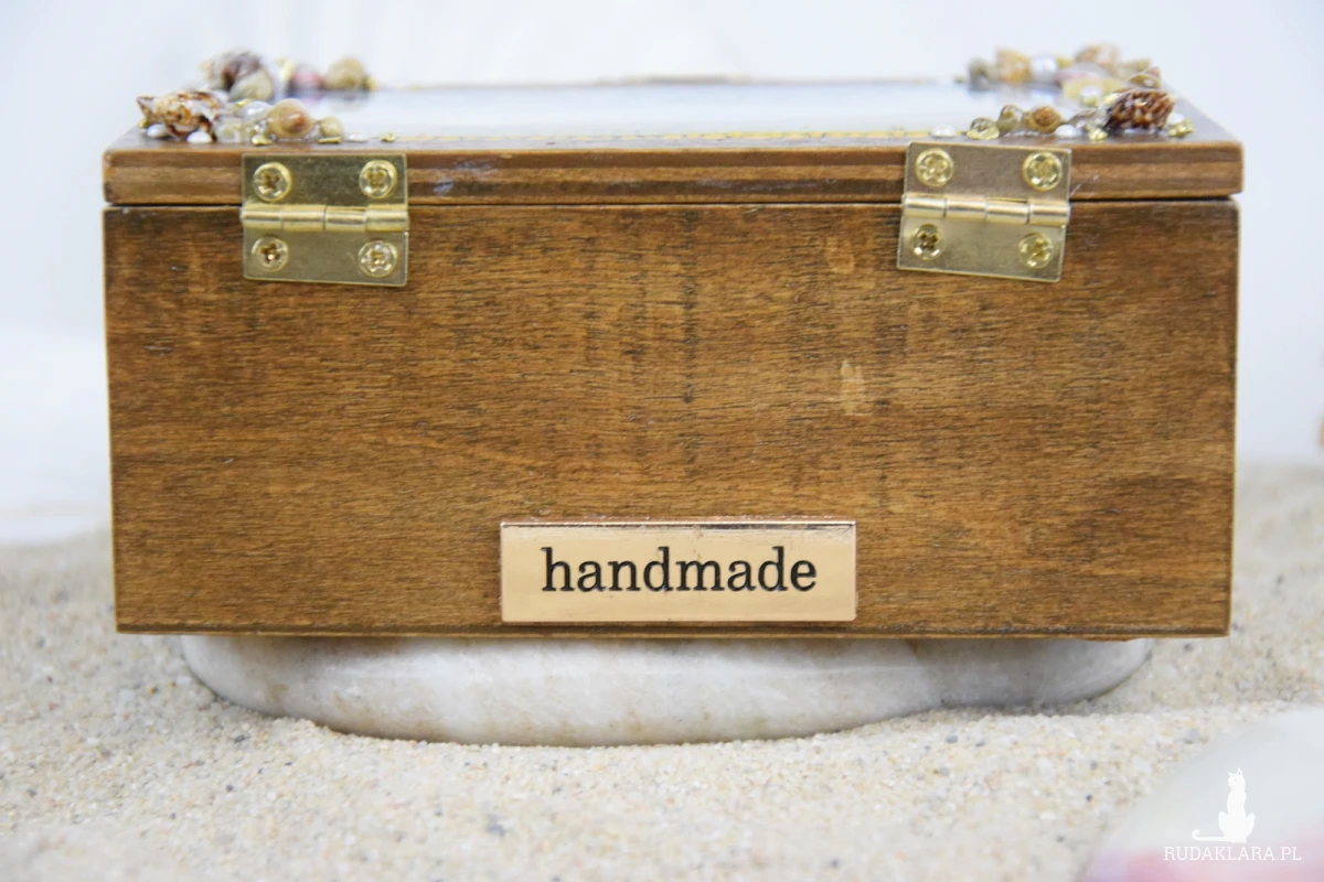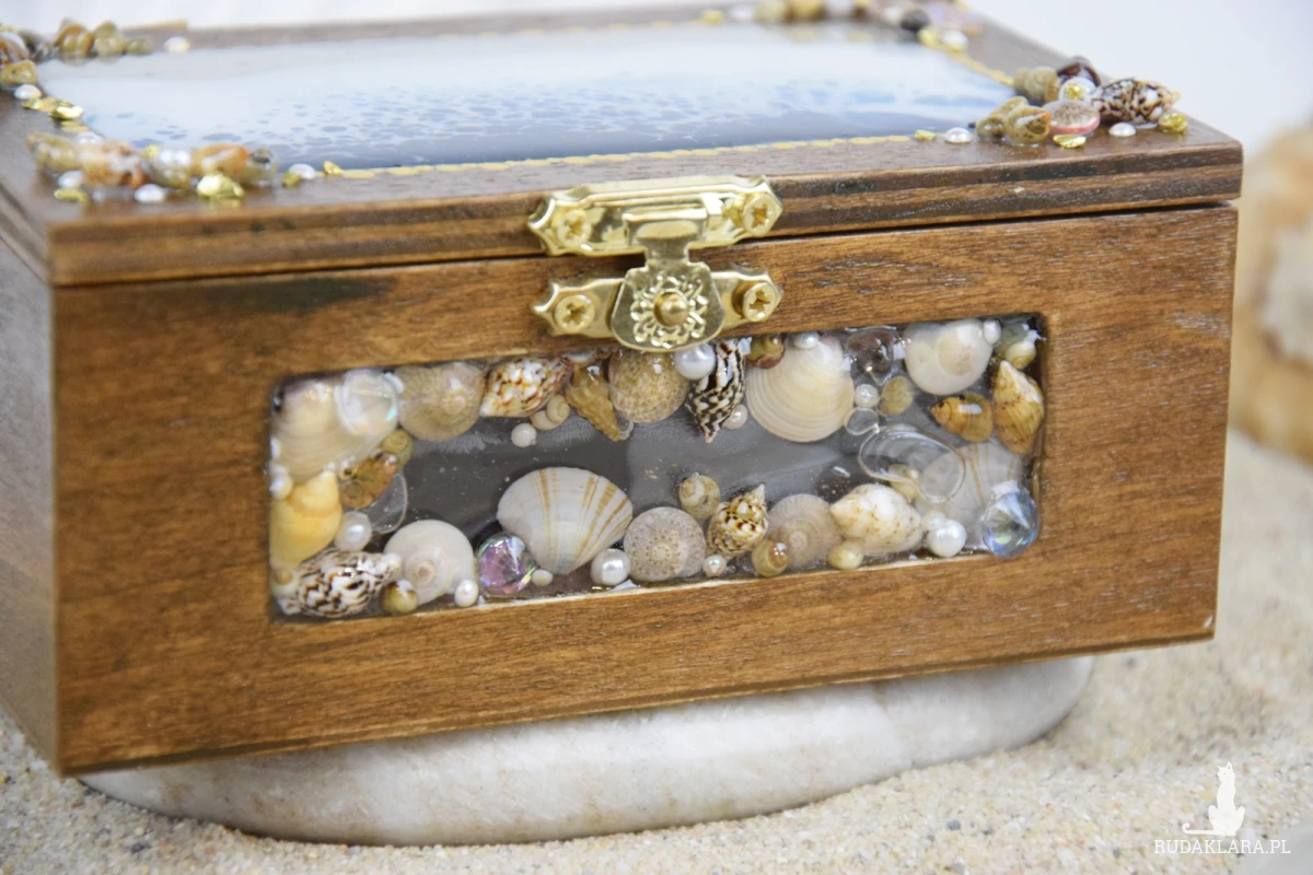 Z przodu szkatułki umieszczono dekoracyjne okienko, w którym znajduje się starannie ułożona kompozycja z muszli, bursztynów, pereł oraz elementów ozdobnych. Dla trwałości i ochrony wszystkie muszle zostały pokryte warstwą żywicy, dzięki czemu są zabezpieczone przed uszkodzeniami.