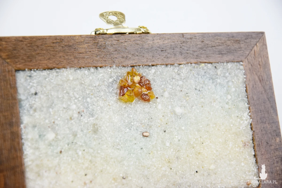 Na spodzie pokrywy znajduje się drobny piasek, na którym ułożone zostało serce stworzone z prawdziwych polskich bursztynów – subtelny i symboliczny akcent dodający całości wyjątkowego uroku. Szkatułka została osadzona na korkowych stopkach, które chronią powierzchnię mebli i zapewniają stabilność.