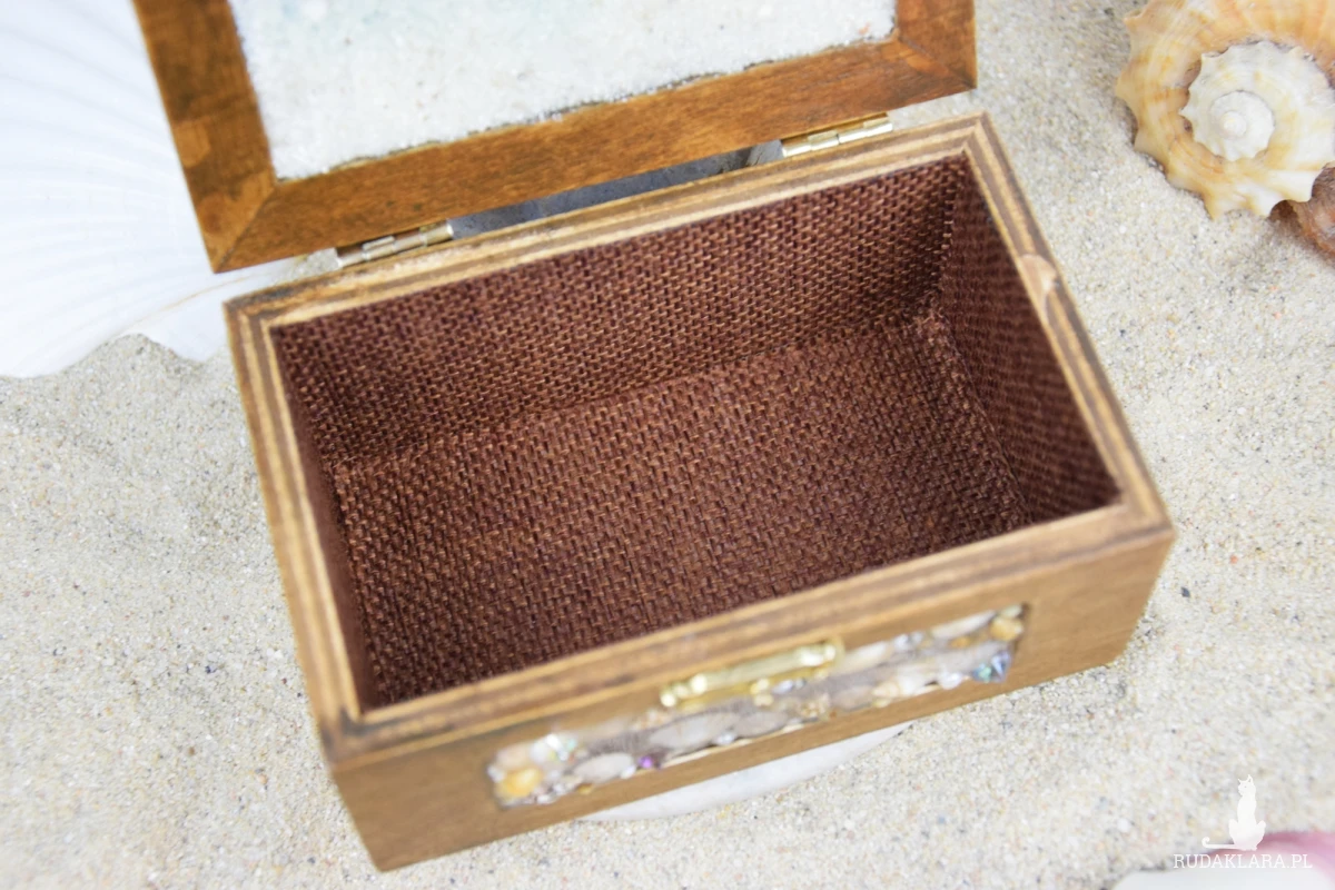 Wnętrze szkatułki wyłożono tkaniną przypominającą jutę, która pięknie komponuje się z naturalnym, morskim charakterem dekoracji.