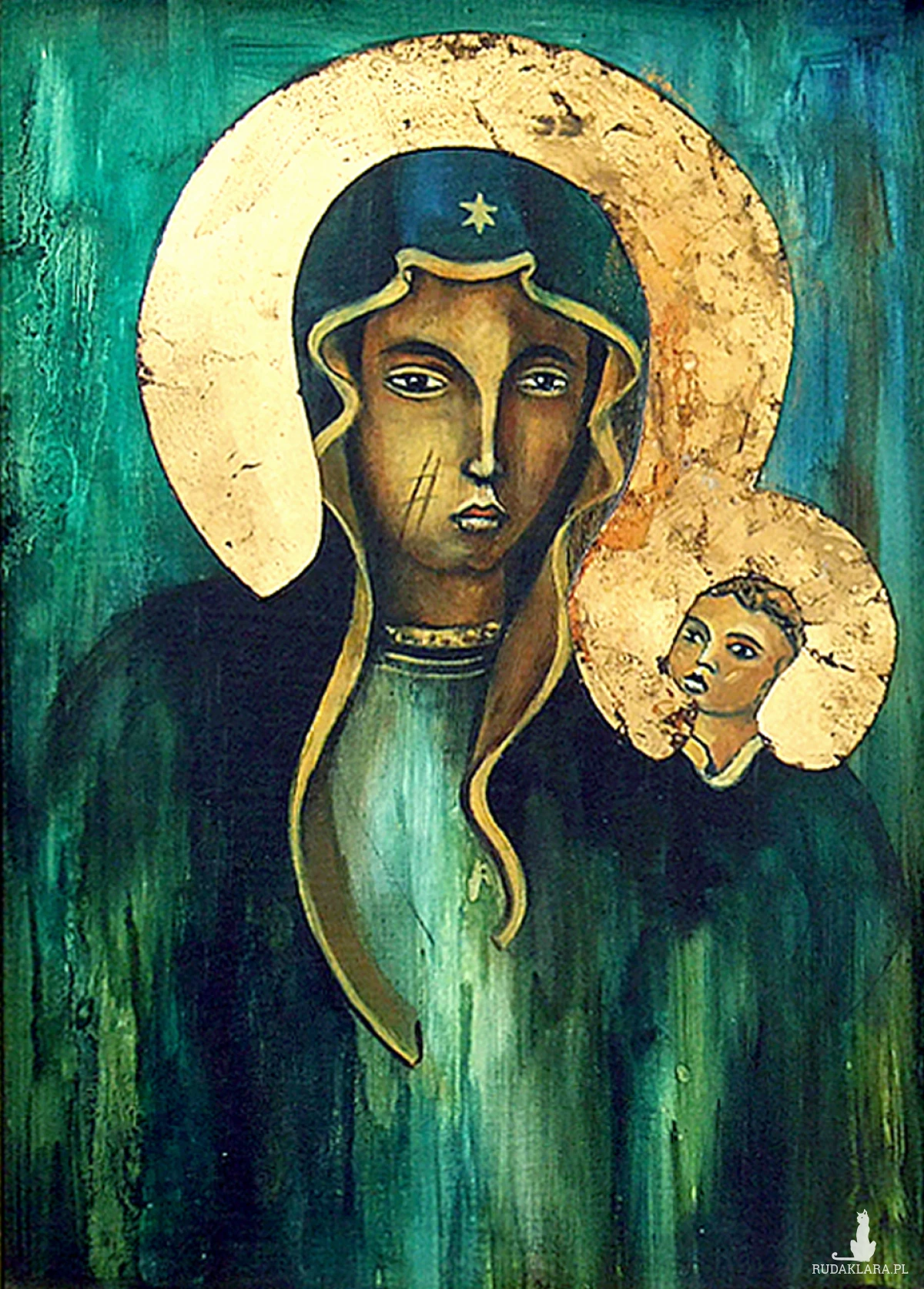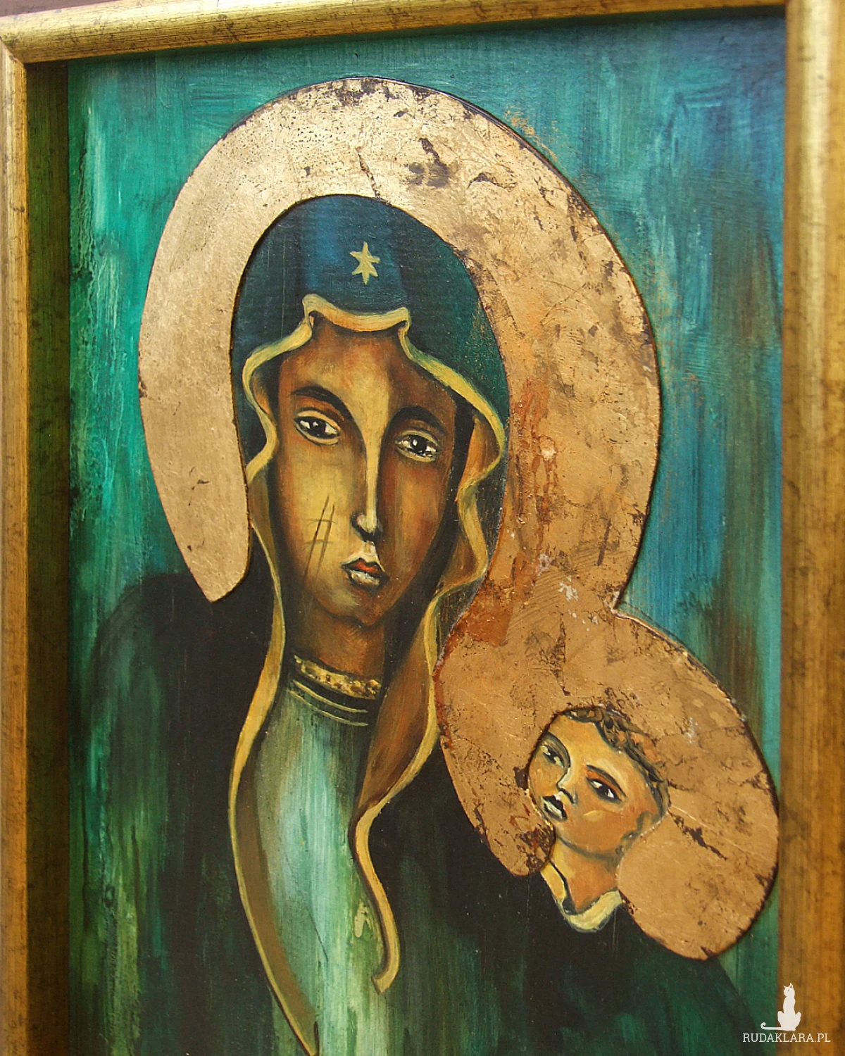 Obraz olejny malowany na płycie hdf - Madonna. Aureloe wokół postaci pokryte są złotą patyną, delikatnie odstającą od obrazu, całość zabezpieczona jest werniksem.