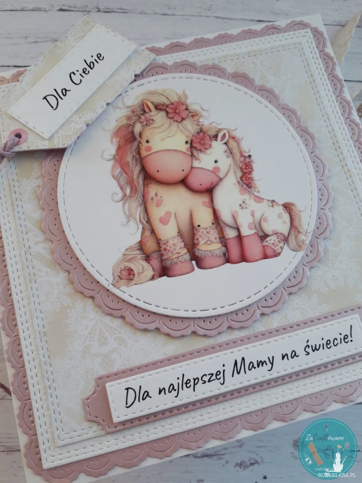Ręcznie robiona kartka na Dzień Mamy z uroczymi konikami wykonana metodą scrapbookingu z wykorzystaniem profesjonalnych materiałów i z dbałością o każdy szczegół.
