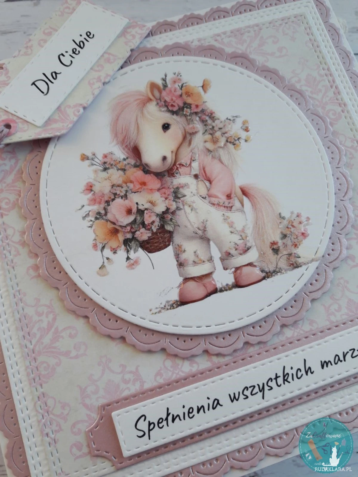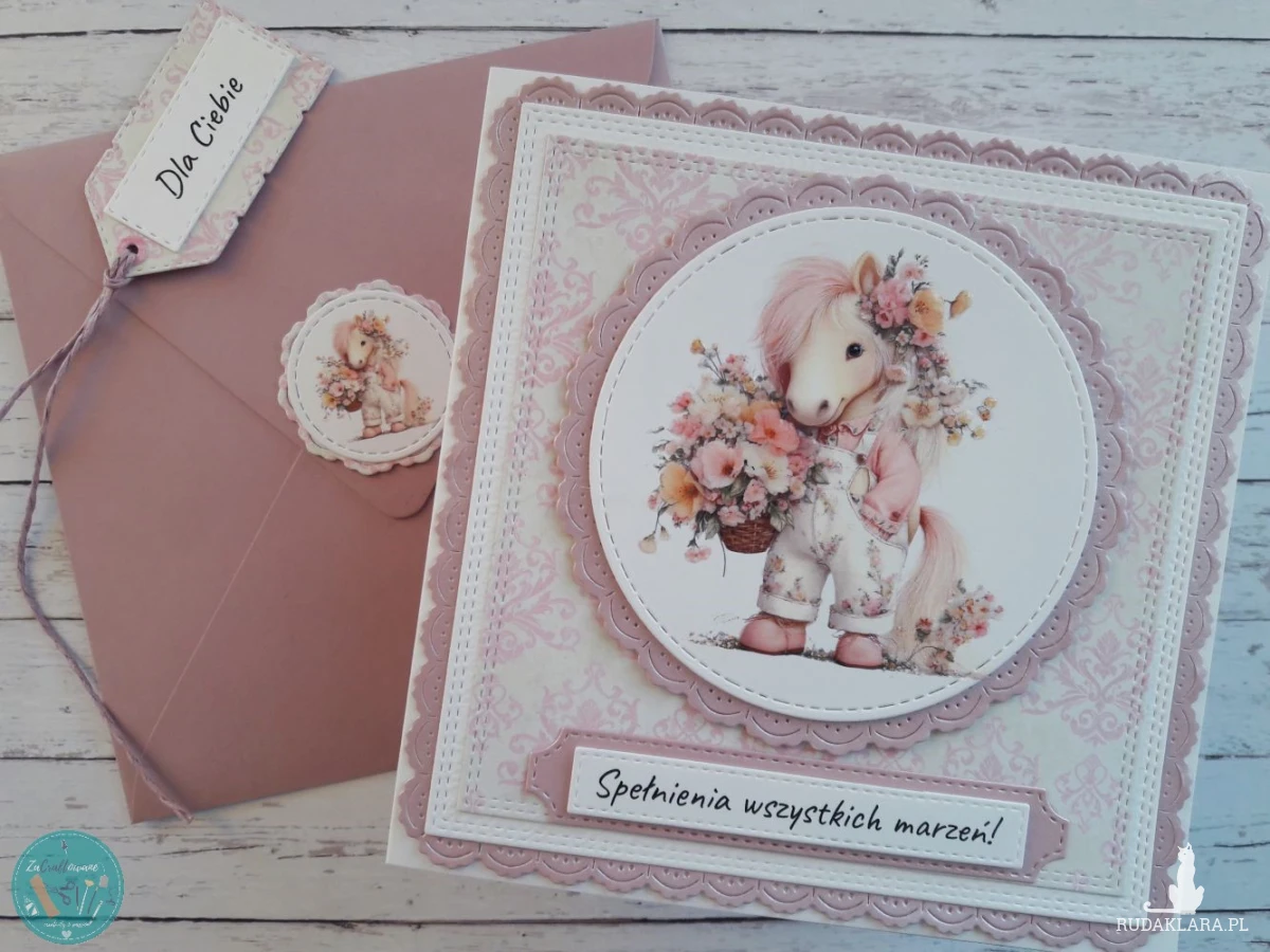 Ręcznie robiona kartka urodzinowa dla nastolatki z uroczym konikiem w ogrodniczkach wykonana metodą scrapbookingu z wykorzystaniem profesjonalnych materiałów i z dbałością o każdy szczegół.