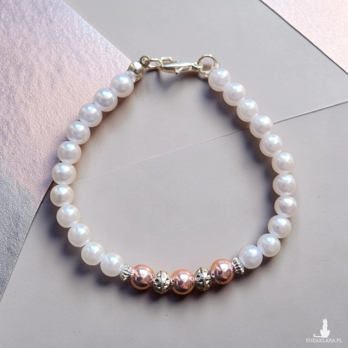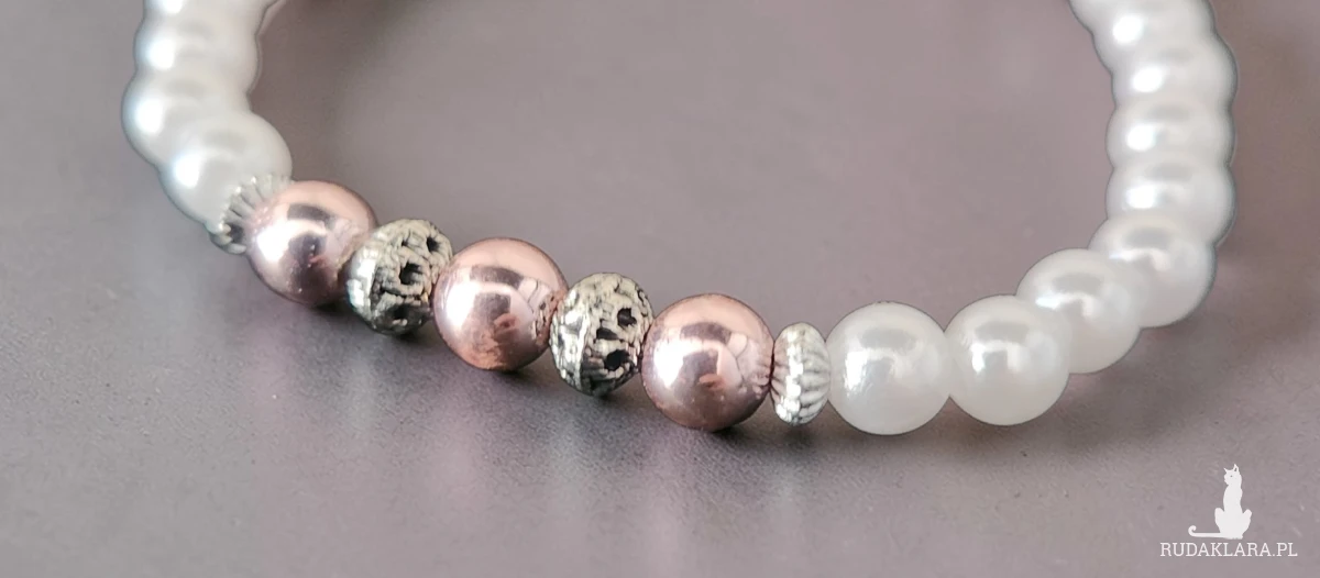Stylowa bransoletka wykonana z delikatnych, białych perełek, uzupełniona ozdobnymi koralikami w odcieniu różowego złota oraz srebrnymi elementami dekoracyjnymi. Całość tworzy elegancką i subtelną biżuterię, która pięknie prezentuje się na nadgarstku.