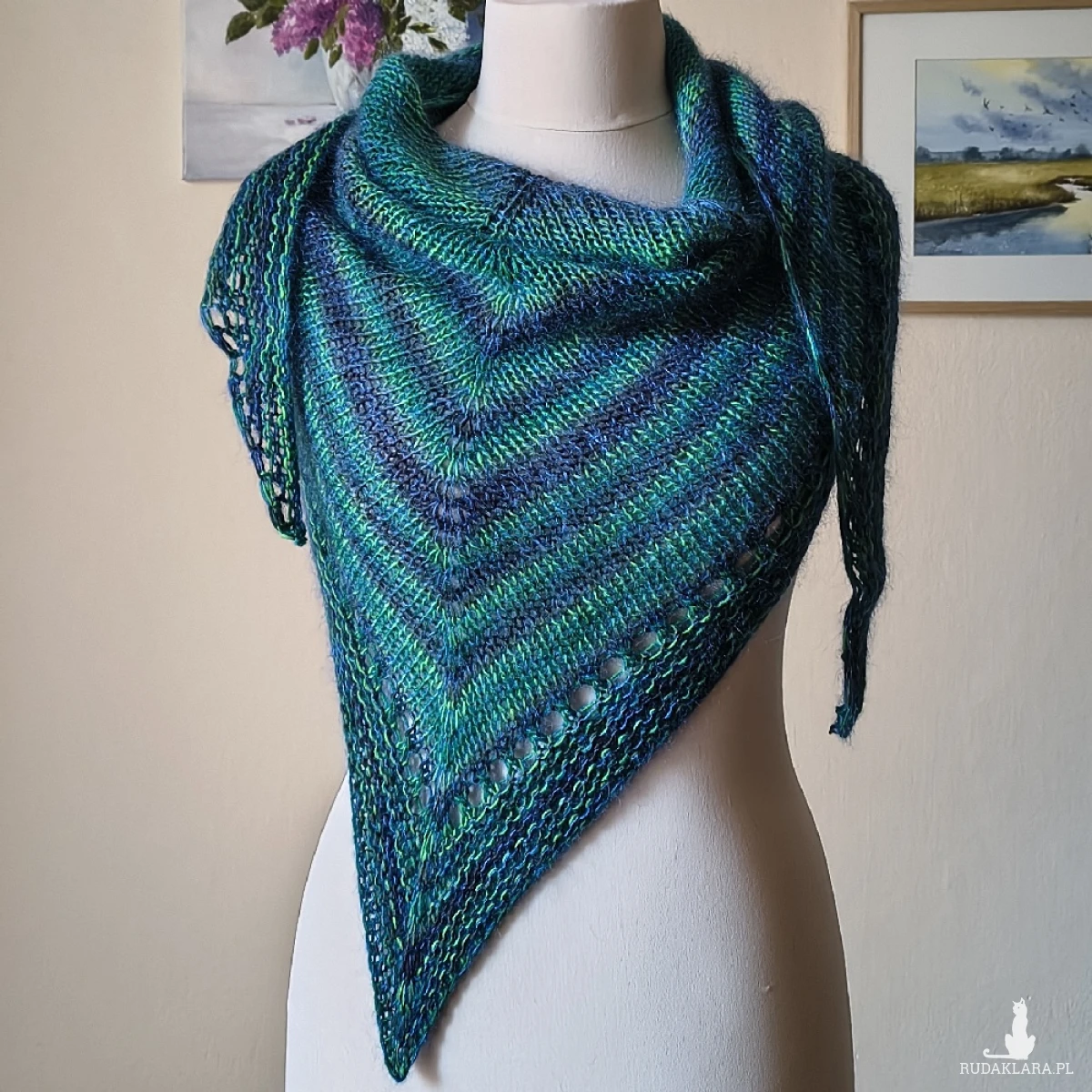 Duża ekskluzywna chusta wykonana ręcznie na drutach podwójną nitką z najwyższej jakości włóczek: cudownie miękkiego kanadyjskiego moheru z jedwabiem (75%/25%) i niezwykłej, certyfikowanej, ręcznie barwionej (niestety znacznie droższej) urugwajskiej wełenki merino 100%. Kombinacja włóczek dała wyjątkowy efekt kolorystyczny. Chusta jest bardzo ciepła, miła, delikatnie puchata i przede wszystkim lekka. Latem z powodzeniem zastąpi wierzchnie okrycie, a w chłodniejszych miesiącach będzie świetnym dodatkiem do dowolnych stylizacji. Wymiary: 202 cm. bok najdłuższy, 78 wysokość trójkąta. Pranie wyłącznie ręczne.