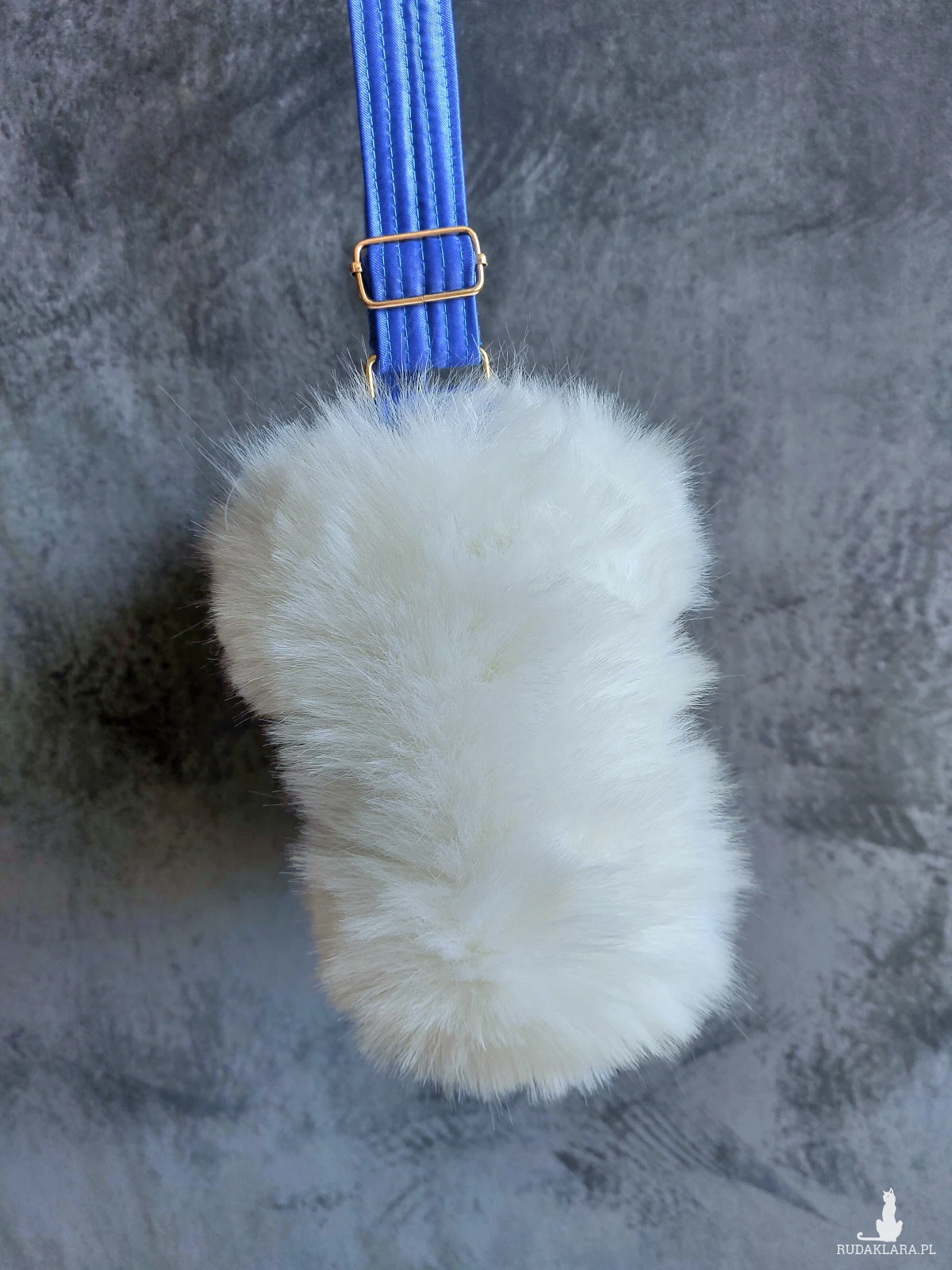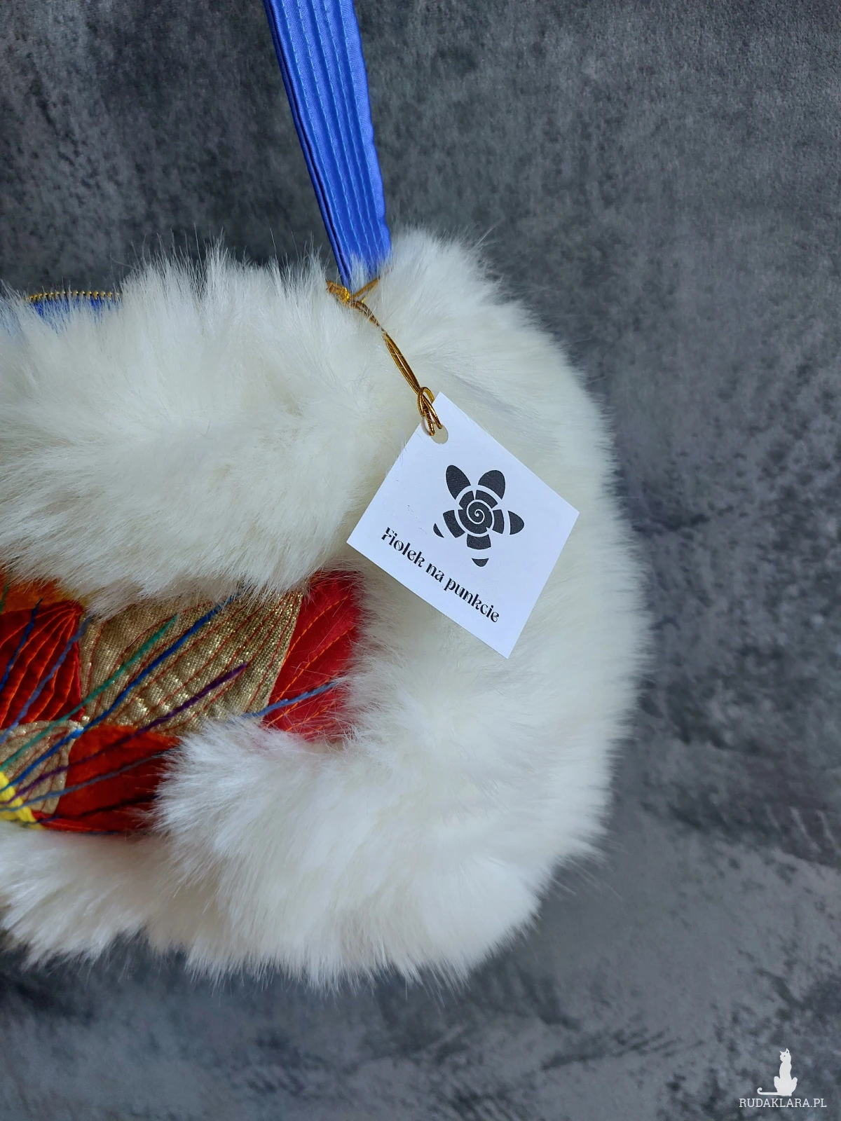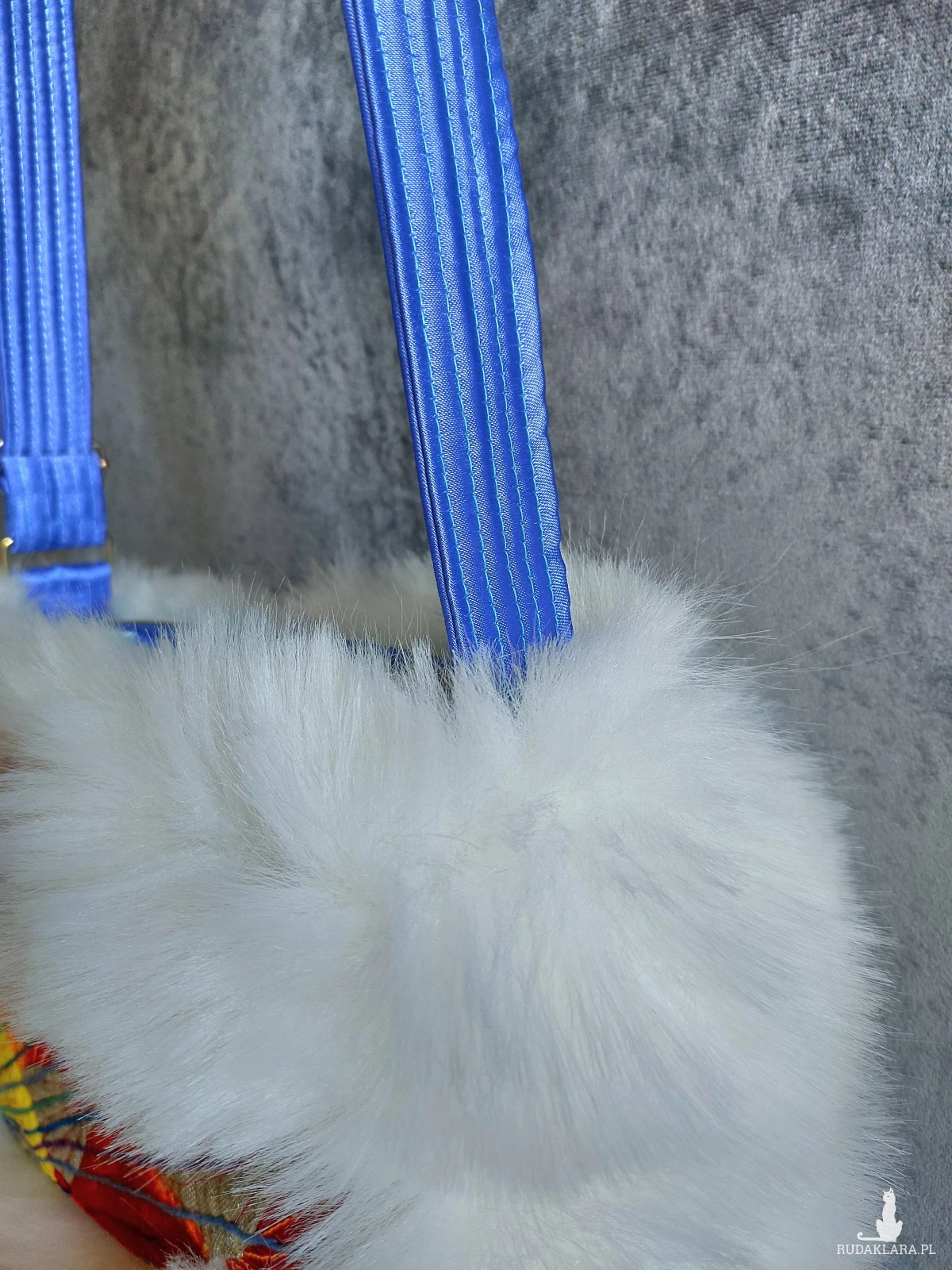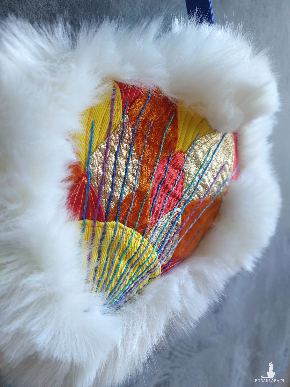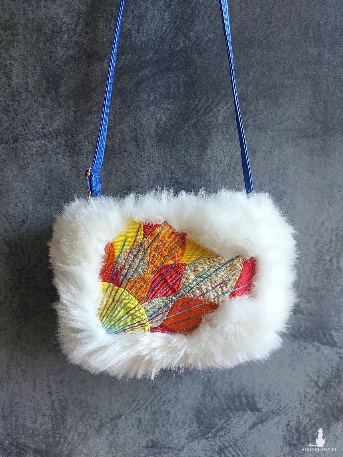 Torebka na ramię wykonana w pojedynczym egzemplarzu. Utrzymana w artystycznym stylu, powstała z pojedynczych, kolorowych elementów składających się na ścianki. Obramowana białym, gęstym futerkiem. Pasek i wnętrze w niebieskim kolorze. W środku kieszonka. Torebka zapinana jest na zamek. Wymiary: 26/ 18/ 8 cm, pasek regulowany o maksymalnej długości 130 cm.
