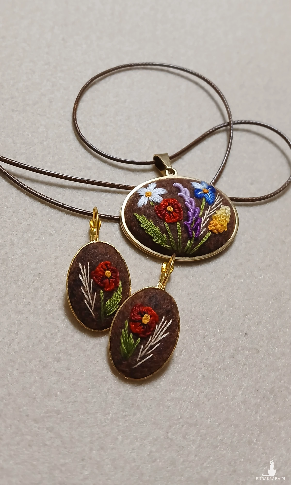 Perfekcyjnie dopracowany haft na filcu wykonałam polską bawełnianą muliną za pomocą igły. Jest on zabezpieczony impregnatem do tkanin ale po dłuższym użytkowaniu można go odświeżyć przy pomocy delikatnego mydła i letniej wody.
