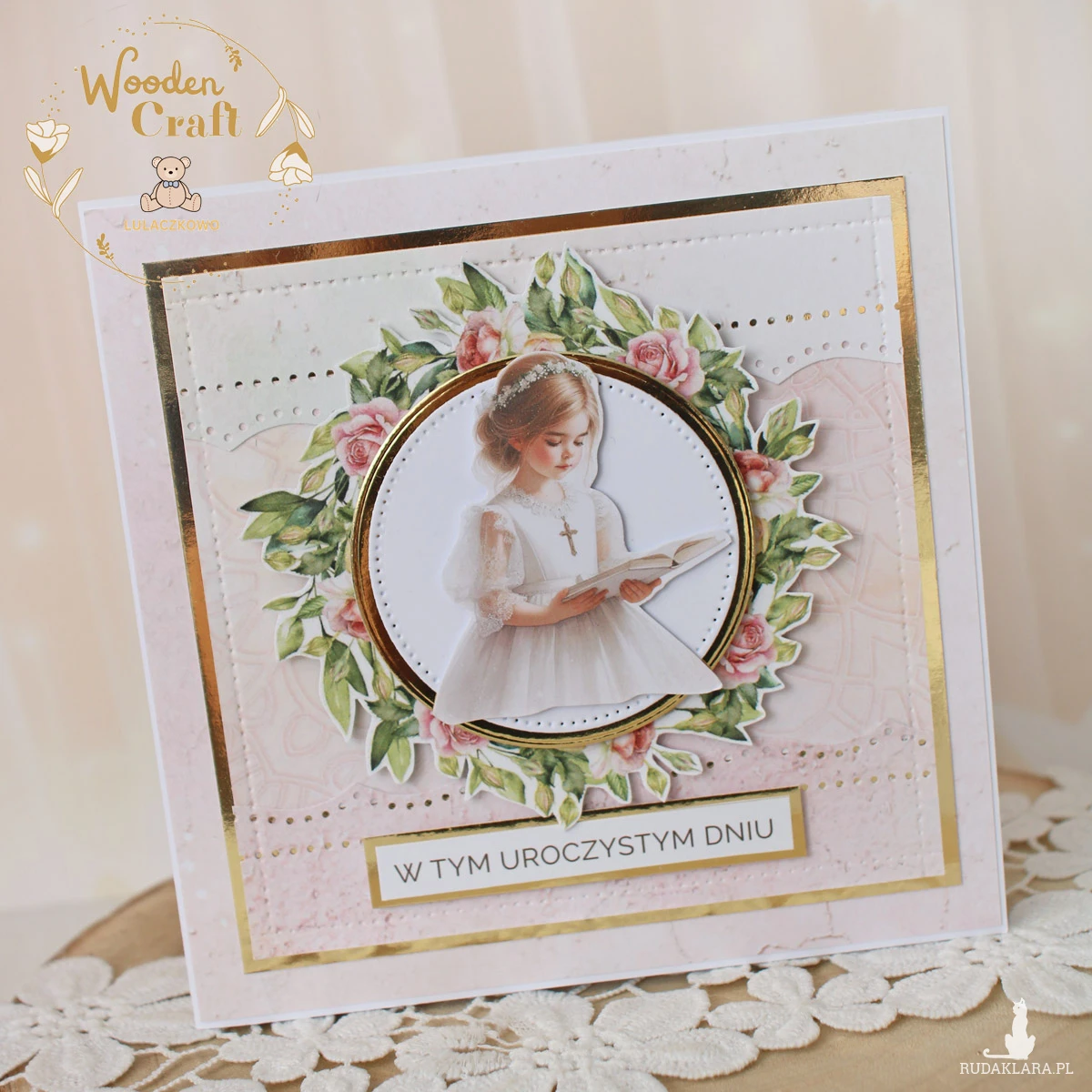 Piękna, elegancka kartka komunijna, pamiątka Pierwszej Komunii Świętej mieszcząca się do koperty, wykonana ręcznie z najwyższą starannością, z cudownej kolekcji papierów "Rose Wine", utrzymana w pastelowych odcieniach malinowego różu, kremu i bieli, z dodatkiem złotych, błyszczących akcentów. Na środku kartki umieszona została grafika dziewczynki komunijnej czytającej biblię, otoczona kwiatowym wianuszkiem, dodatkowo napis "W Tym Uroczystym Dniu"- do napisu mogę również dodać imię dziecka lub całkowicie zmienić go na inny.