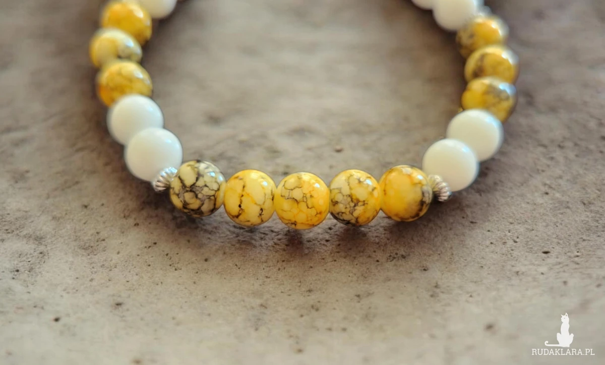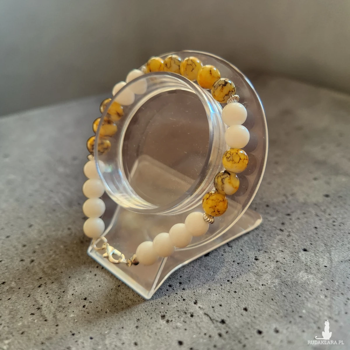 Elegancka i delikatna bransoletka wykonana intensywnie żółtych koralikow z charakterystycznym żyłkowaniem zostały połączone z gładkimi, mlecznobiałymi kamieniami, tworząc harmonijną i stylową kompozycję. Całość uzupełniają ozdobne przekładki oraz solidne metalowe zapięcie.