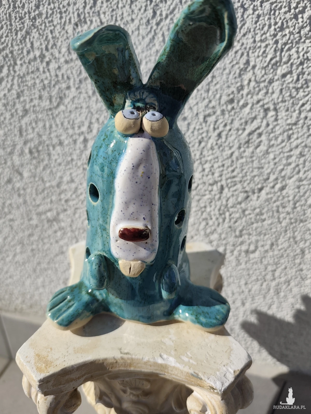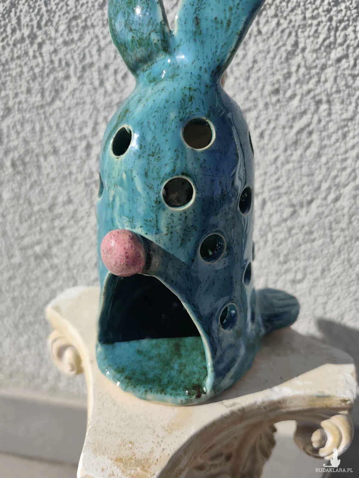 Królik ceramiczny lampion, ręcznie wykonany, szkliwiony i dwukrotnie wypalany w piecu ceramicznym na wysoką temperaturę.