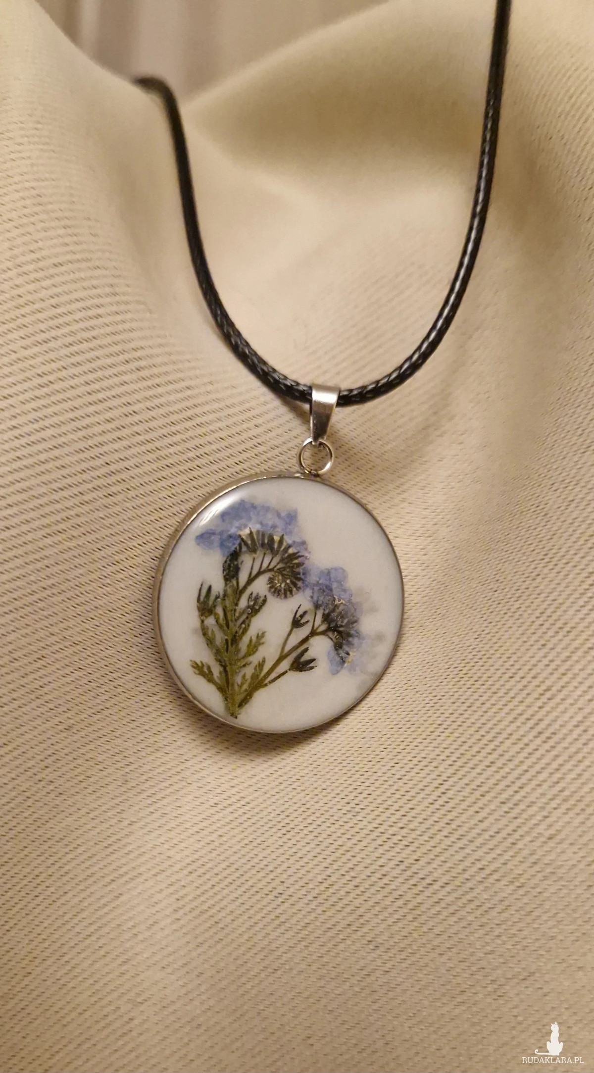 Wisiorek z okrągłym oczkiem z żywicy w metalowej bazie. W żywicy zatopiono suszony kwiat w delikatnym błękitnym kolorze, który wyróżnia się na białym tle. Całość dopełnia woskowany sznurek w kolorze czarnym.