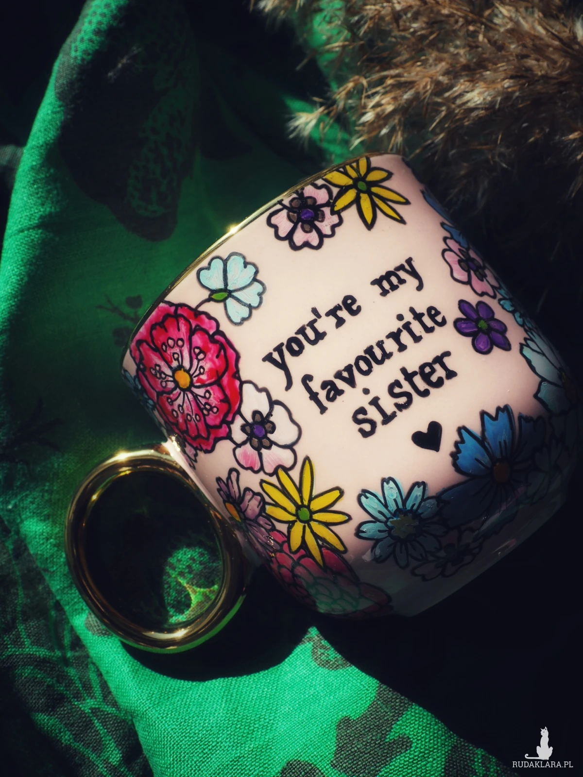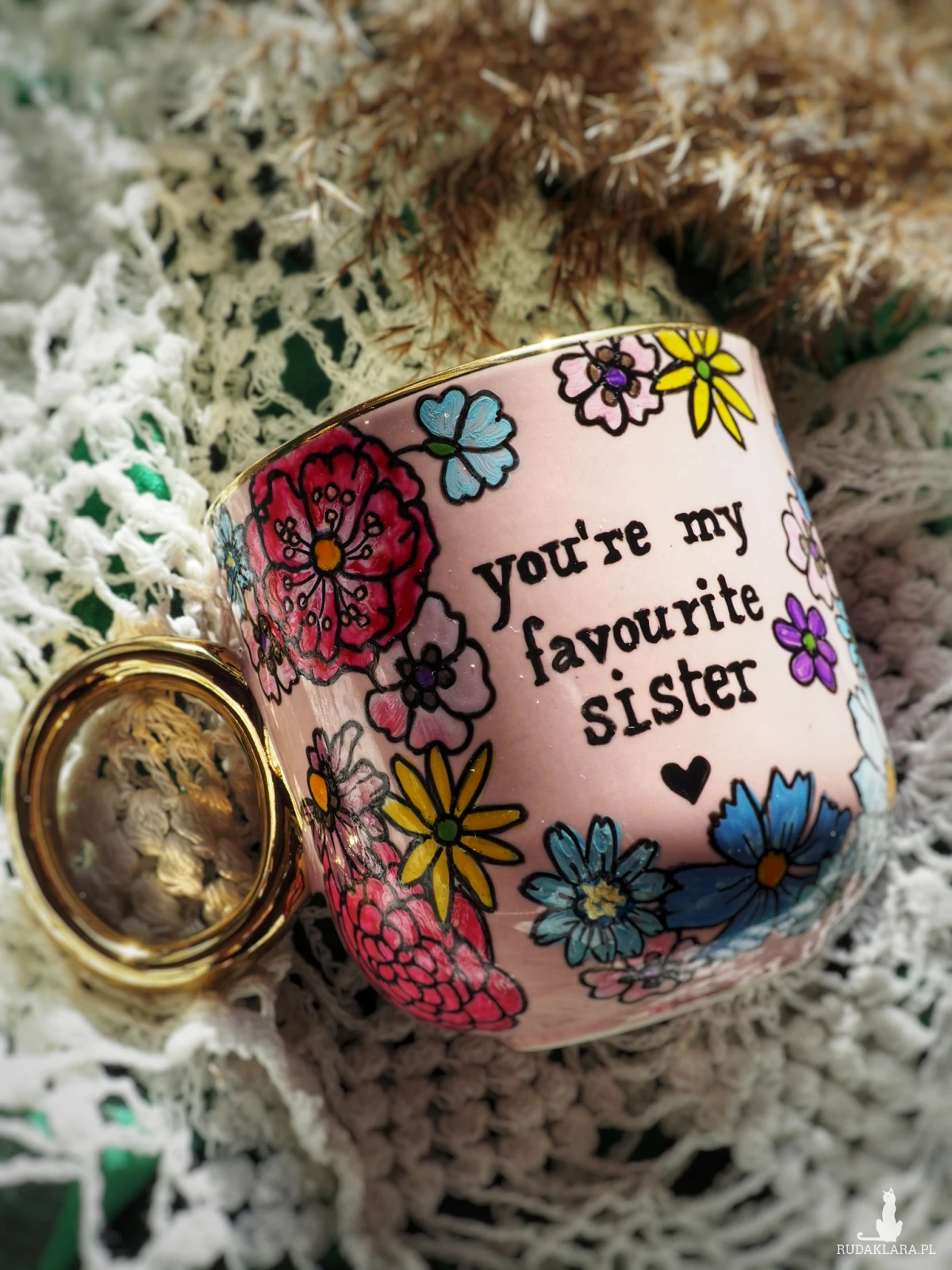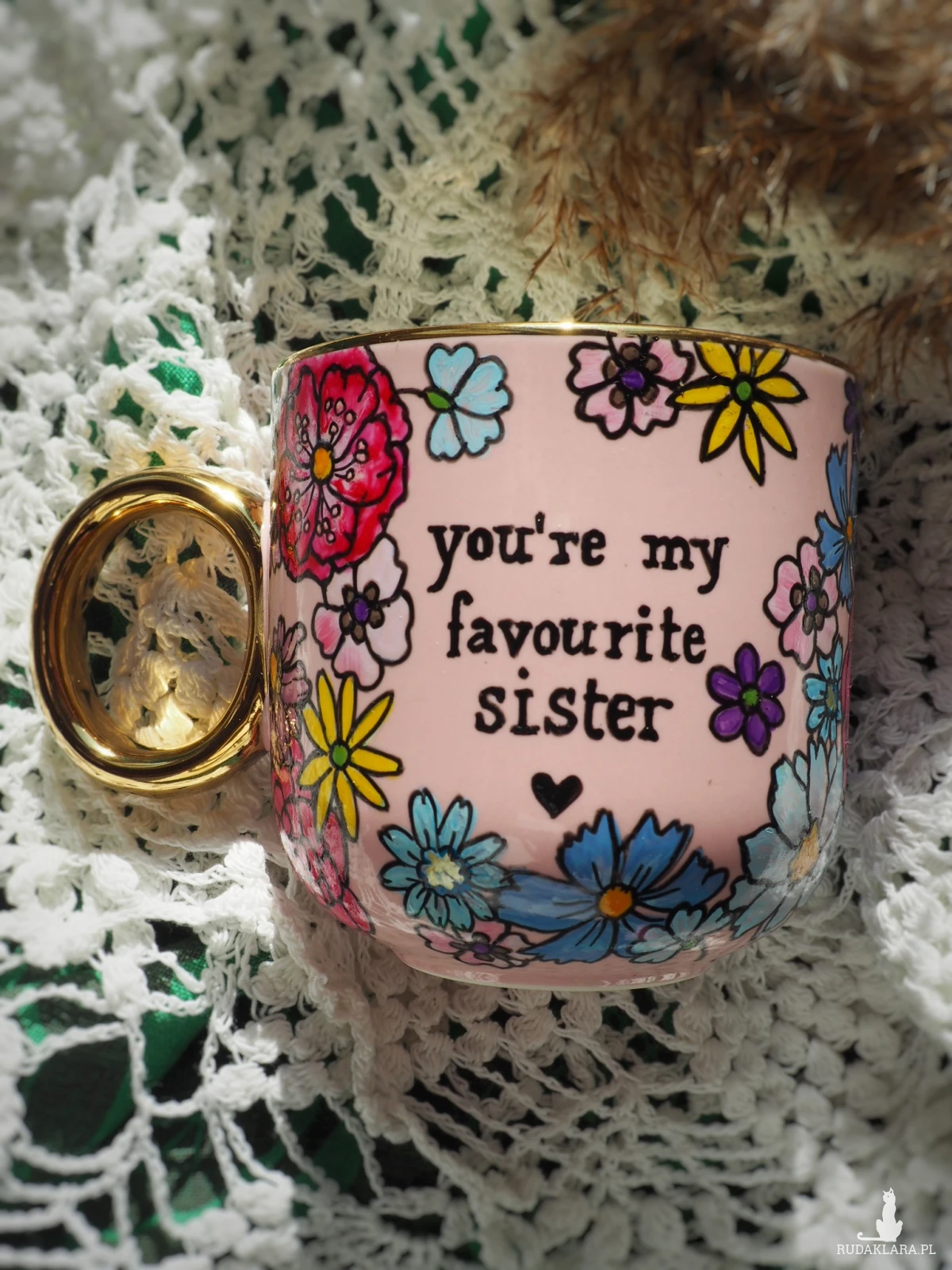 Ręcznie malowany kubek z napisem "You're my favourite sister"" i kolorowym kwiatowym wzorem to doskonały prezent dla siostry lub przyjaciółki, którą traktujesz jak najukochańszą siostrę - "sister from another mister" :)