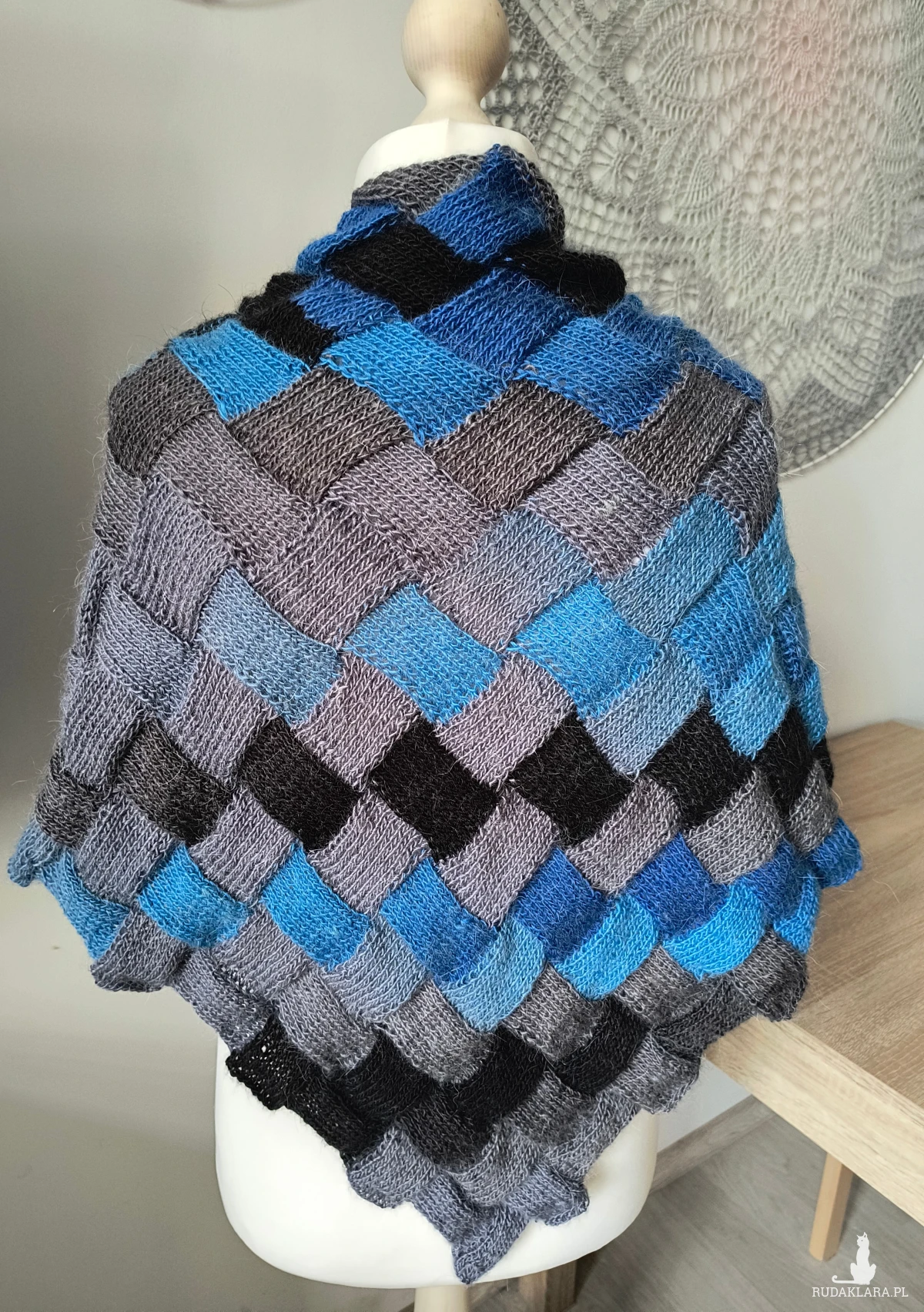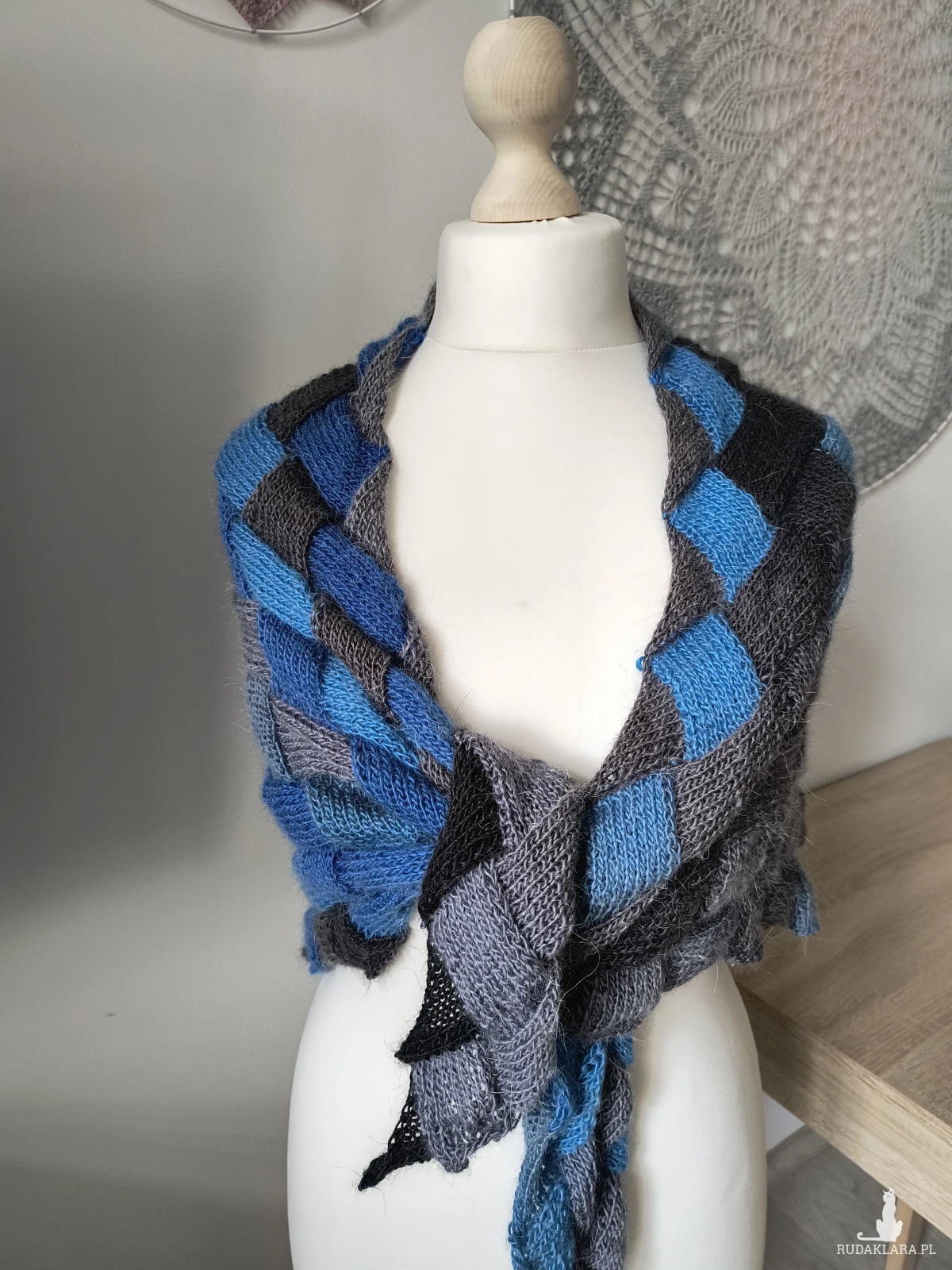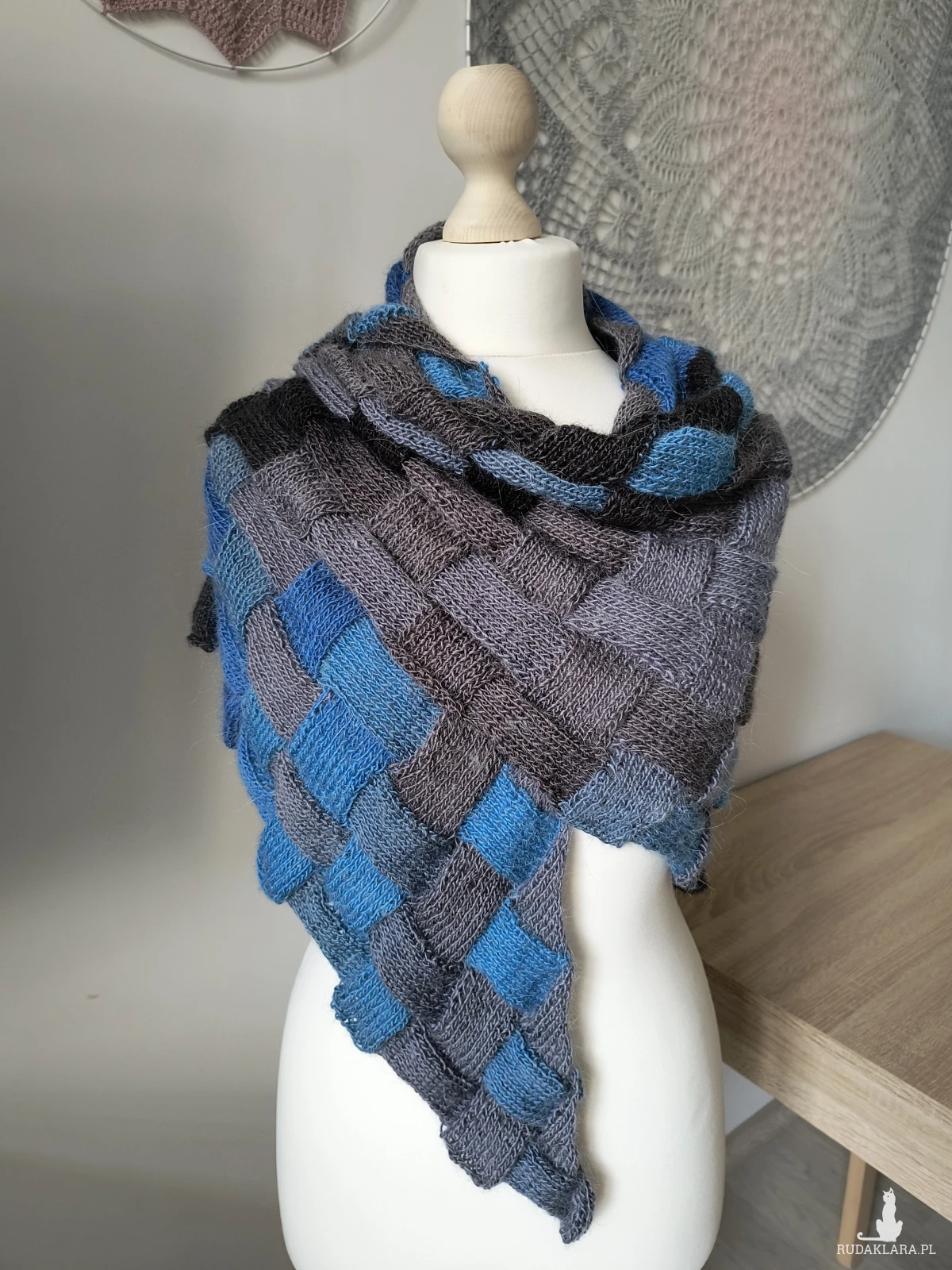 Chusta robiona na drutach. Alpaka z akrylem w kolorze ombre. Odcienie szary, czarny, niebieski.