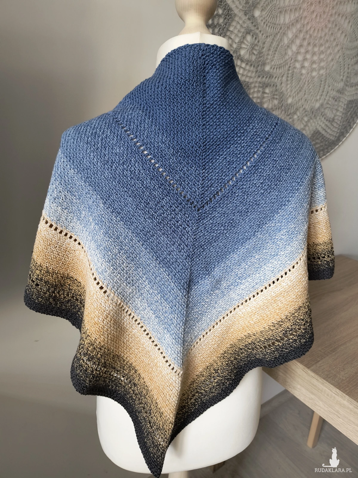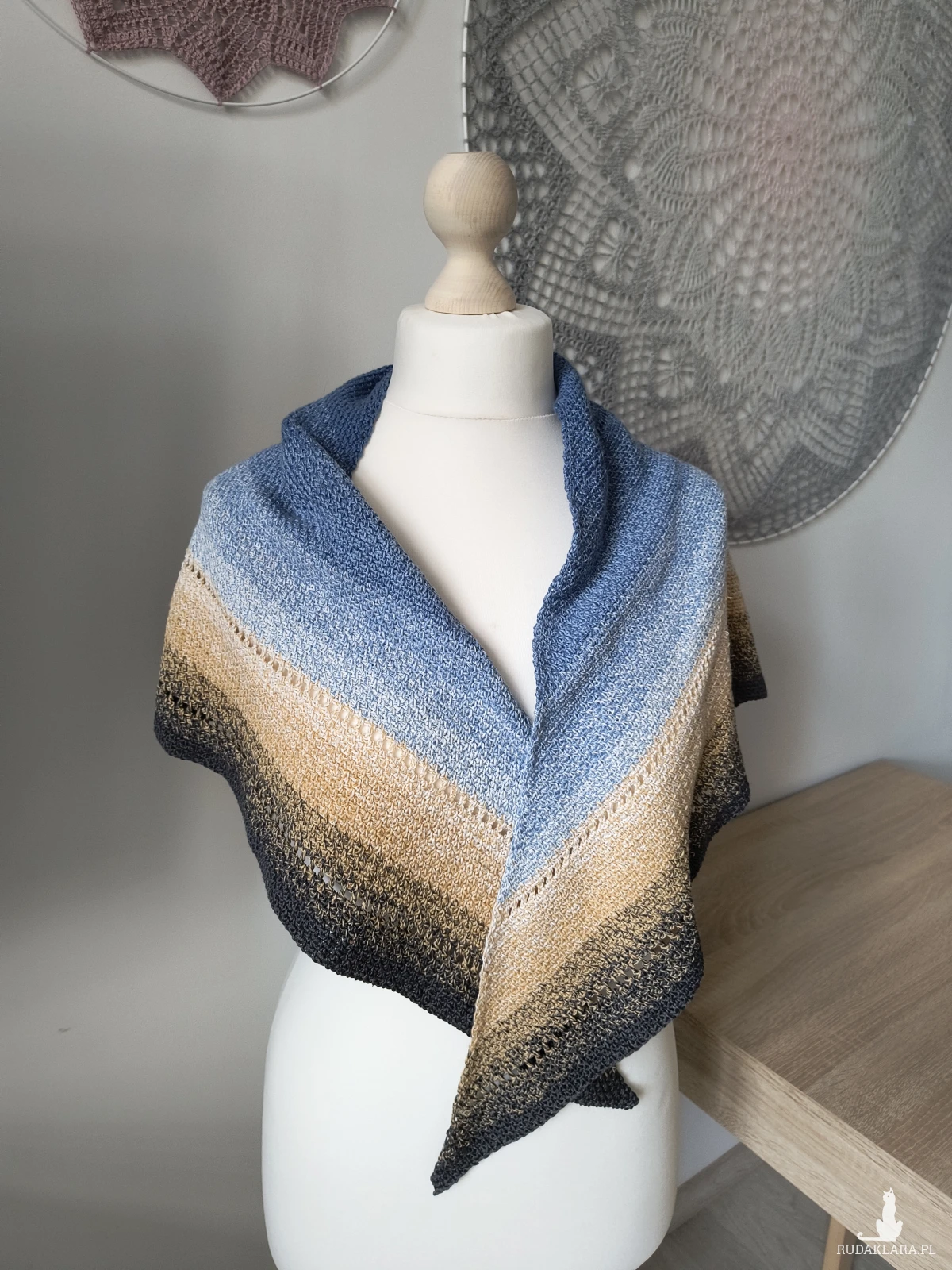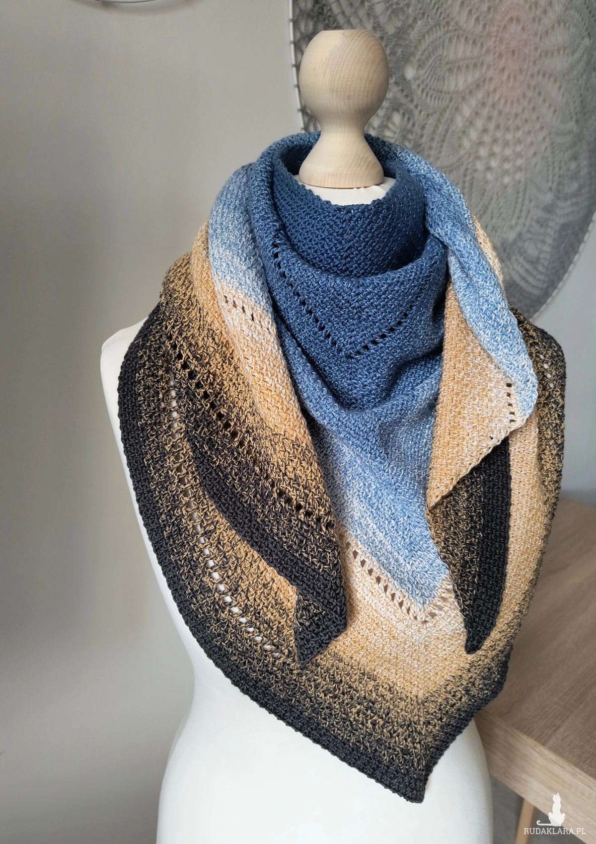 Chusta robiona na szydełku. 55% bawełna 45% akryl w kolorze ombre. Odcienie niebieski, masło i szary z brązem.