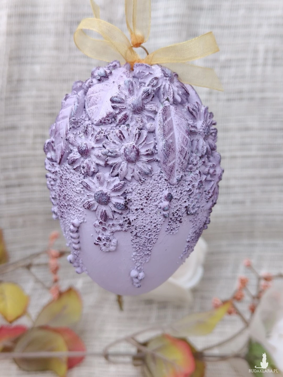 Wyjątkowa, ręcznie zdobiona pisanka w subtelnym, lawendowym odcieniu to elegancka dekoracja wielkanocna, która zachwyca bogactwem detali. Jej powierzchnię zdobią misternie wykonane kwiaty, liście oraz dekoracyjne faktury, podkreślone delikatnym przecieraniem w ciemniejszym tonie fioletu. Całość wieńczy satynowa kokarda w ciepłym, złocistym kolorze, dodająca kompozycji lekkości i klasy.