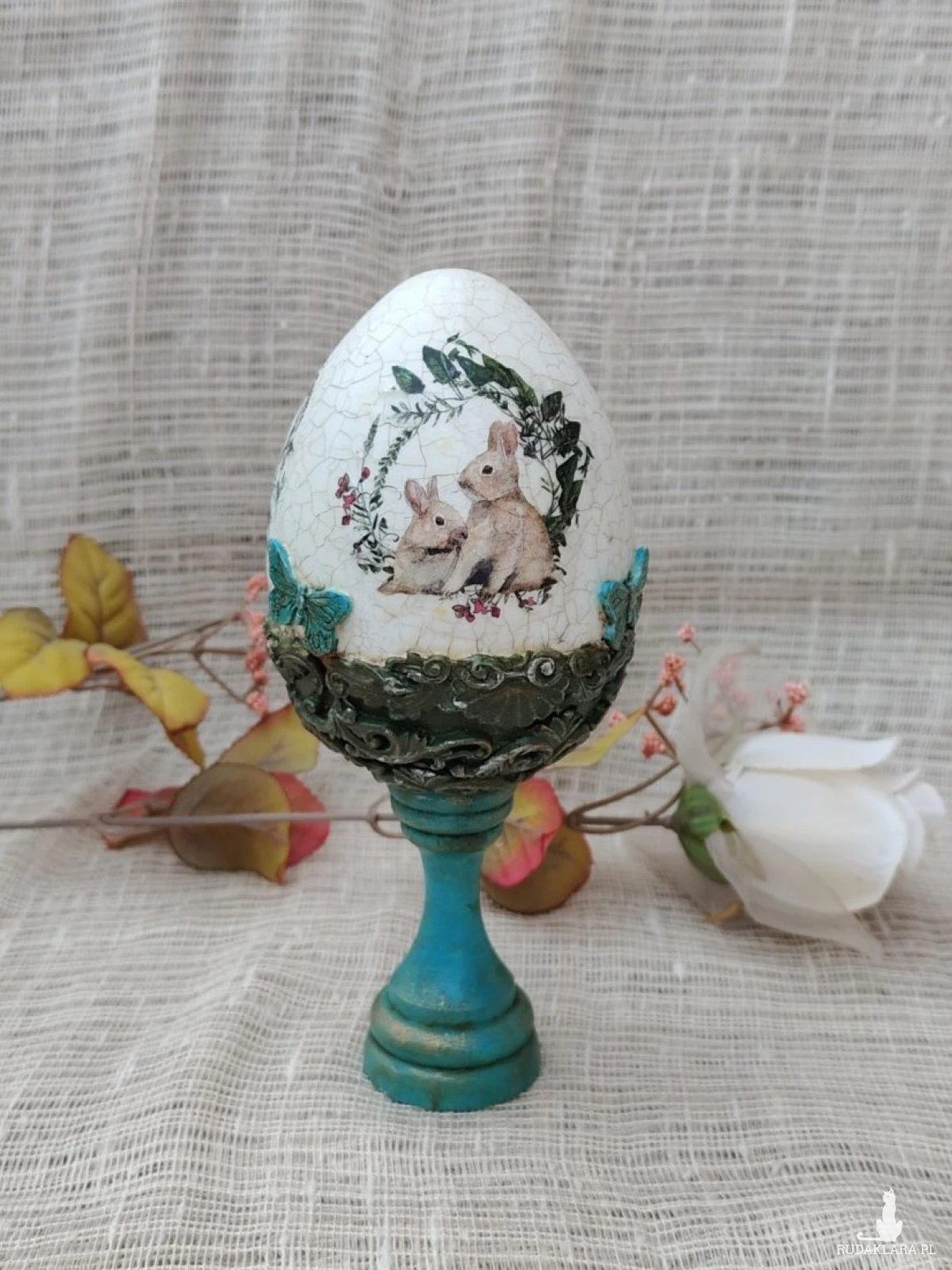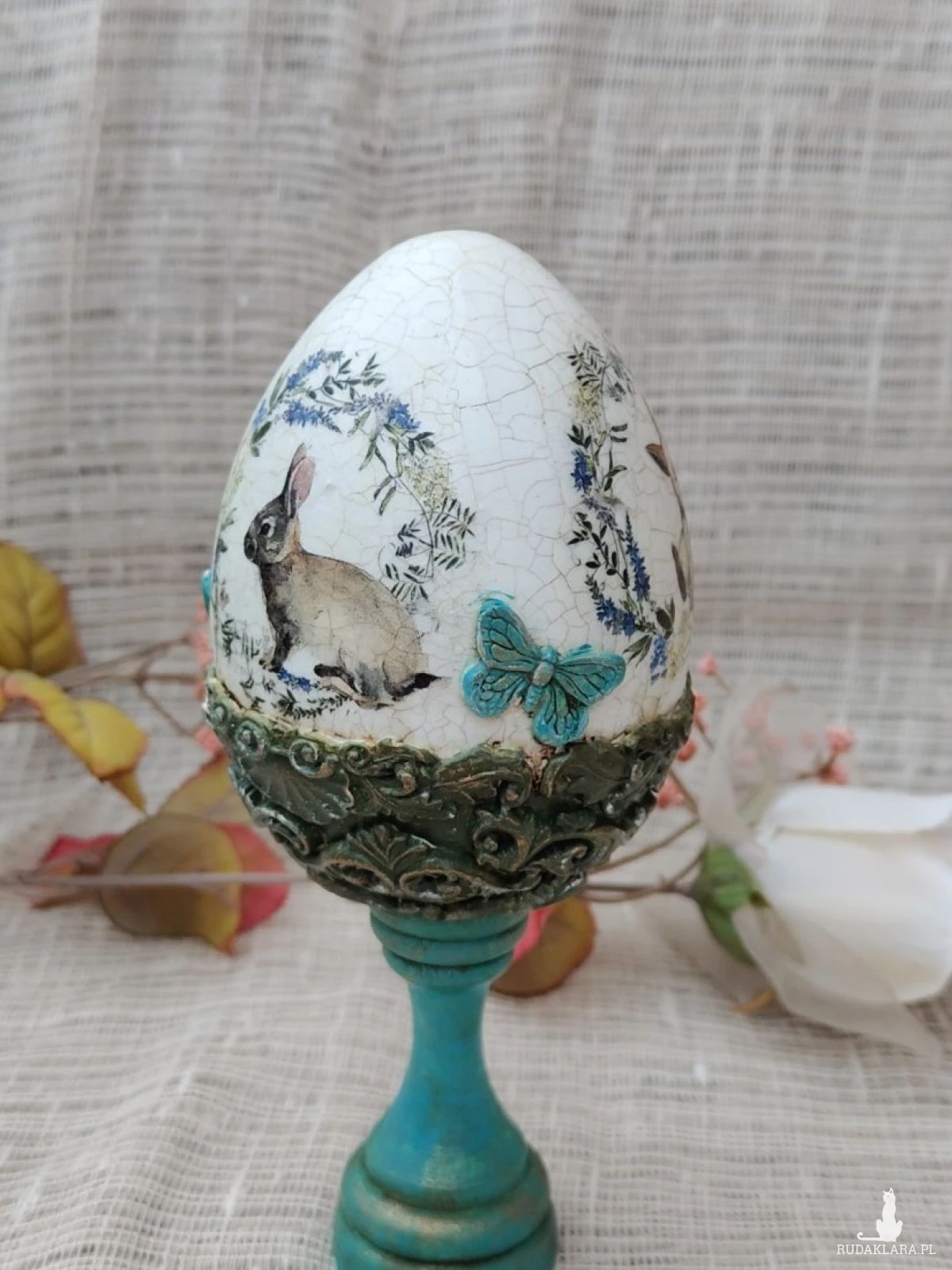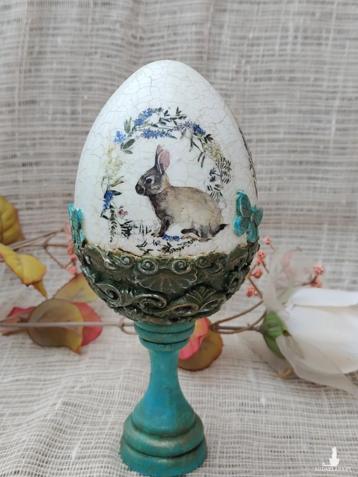 Wyjątkowa pisanka dekoracyjna w stylu vintage, ręcznie wykończona techniką decoupage i postarzana efektem spękań (crackle). Centralnym motywem jest uroczy zajączek otoczony wianuszkiem z delikatnych kwiatów i ziół, co nadaje całości sielski, wiosenny charakter. Dolna część pisanki osadzona jest na stylizowanym, turkusowym postumencie z ozdobnymi reliefami, który podkreśla jej elegancję i sprawia, że dekoracja pięknie prezentuje się na stole, komodzie lub w witrynie. Idealna jako wielkanocna ozdoba lub oryginalny prezent.