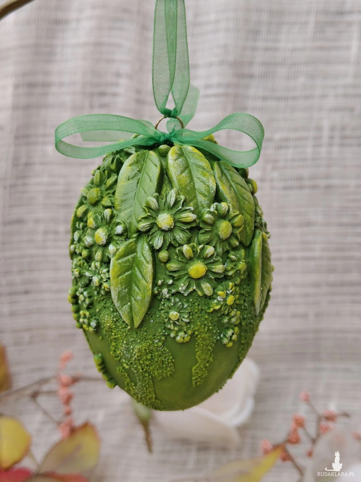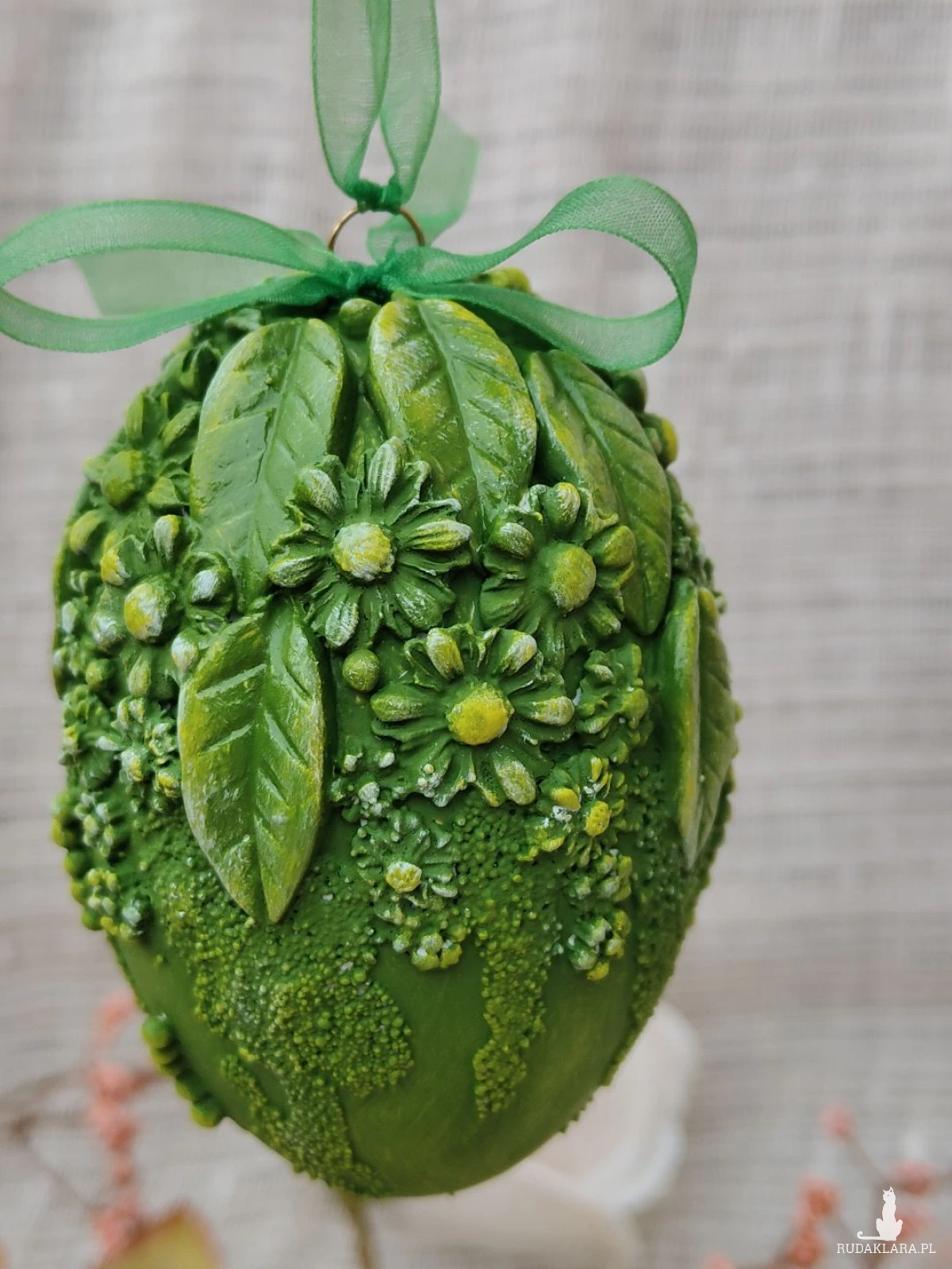 Wyjątkowa pisanka dekoracyjna w intensywnym, soczystym odcieniu zieleni, inspirowana budzącą się do życia wiosenną łąką. Bogato zdobiona kompozycją liści, drobnych kwiatów i subtelnych faktur 3D tworzy efekt przestrzennej, ręcznie modelowanej dekoracji. Całość dopełnia delikatna, półtransparentna wstążka, dzięki której pisankę można zawiesić na gałązkach, w oknie, na stroiku lub świątecznym drzewku wielkanocnym.