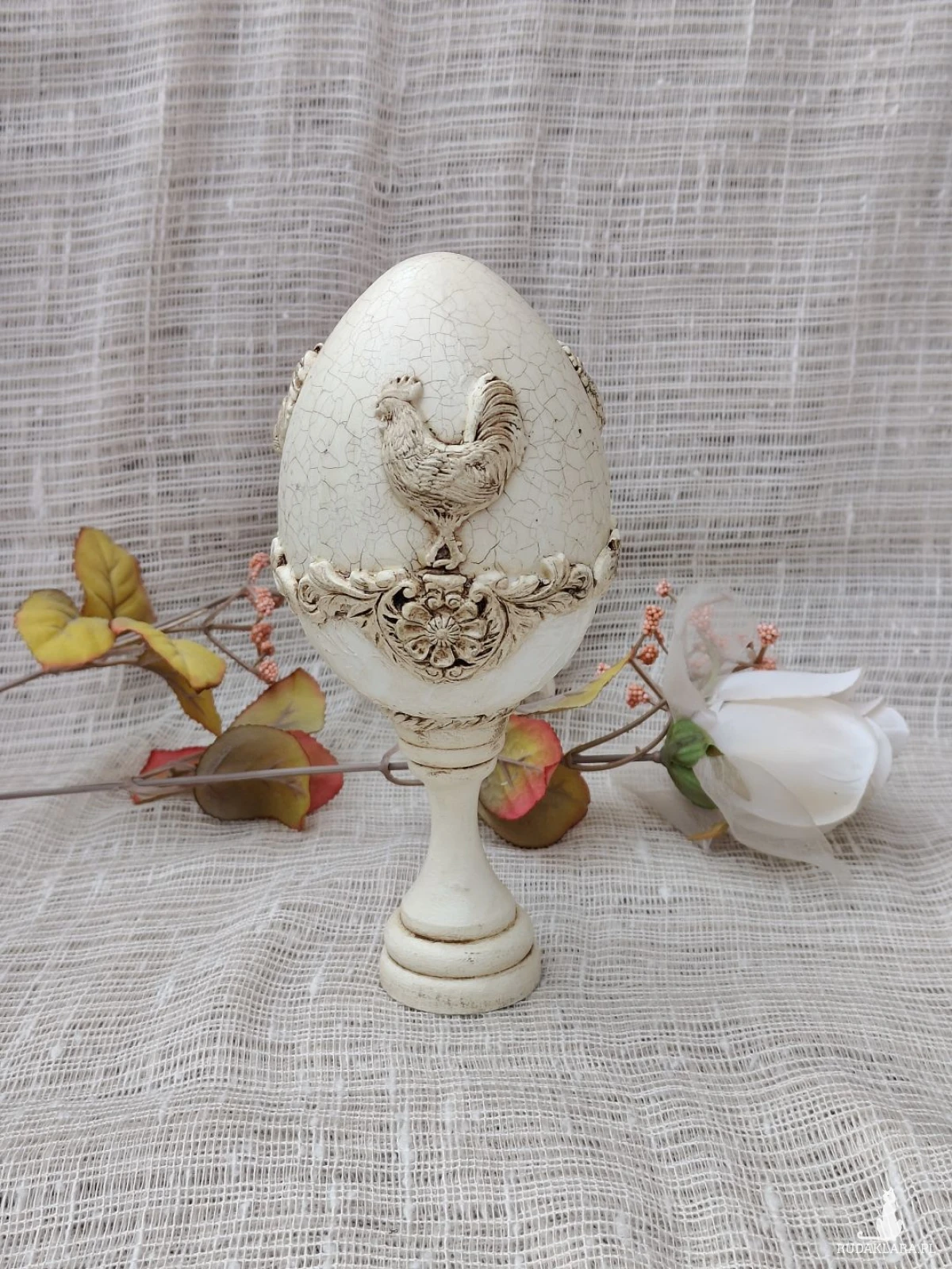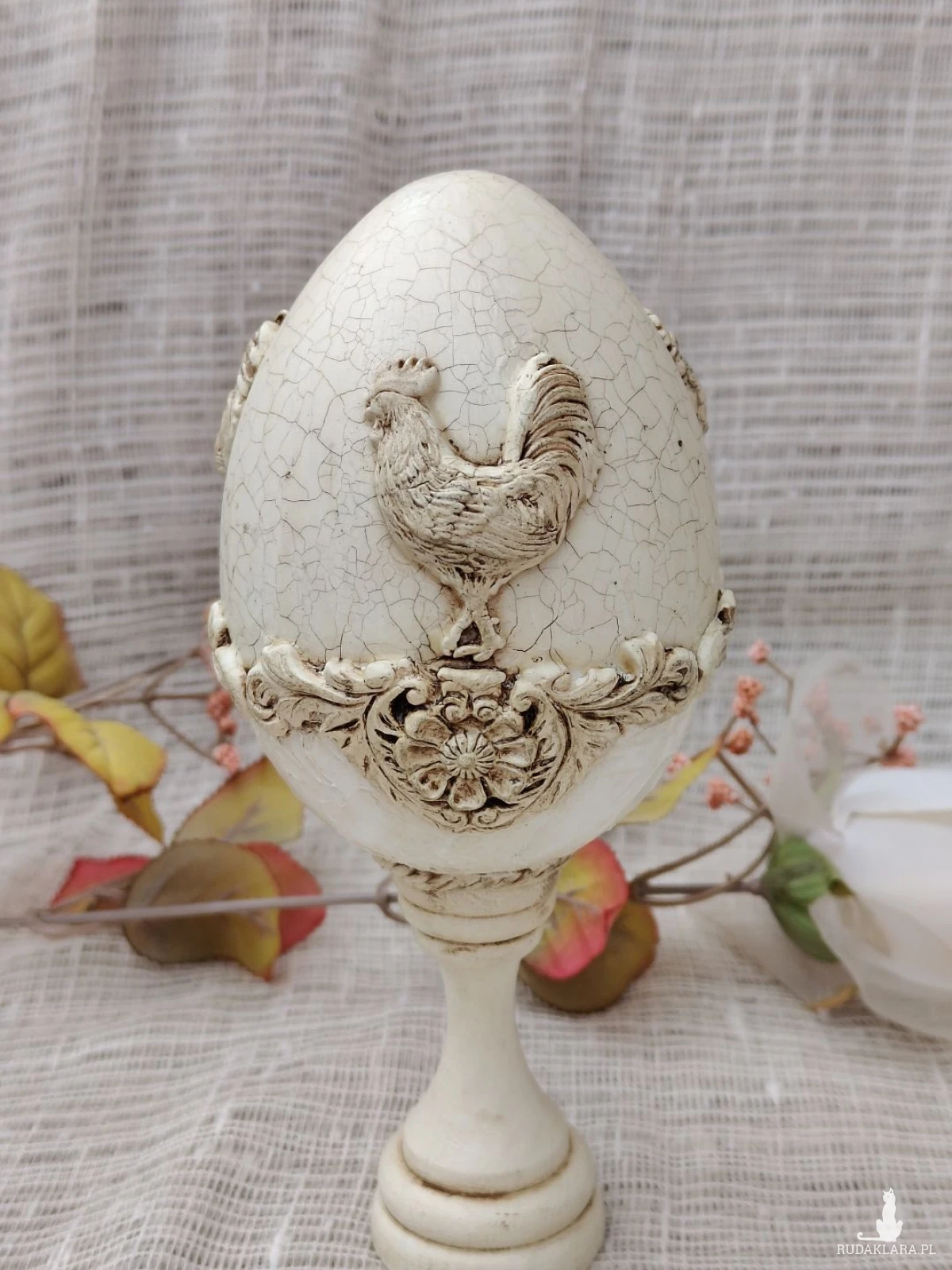 Elegancka pisanka dekoracyjna w odcieniu ciepłej, postarzanej bieli, inspirowana stylem prowansalskim i rustykalnym. Centralnym motywem jest dekoracyjny relief koguta – symbolu domowego ciepła, poranka i nowego początku. Całość zdobią subtelne ornamenty roślinne oraz efekt spękań (crackle), który nadaje pisance szlachetnego, vintage’owego charakteru.