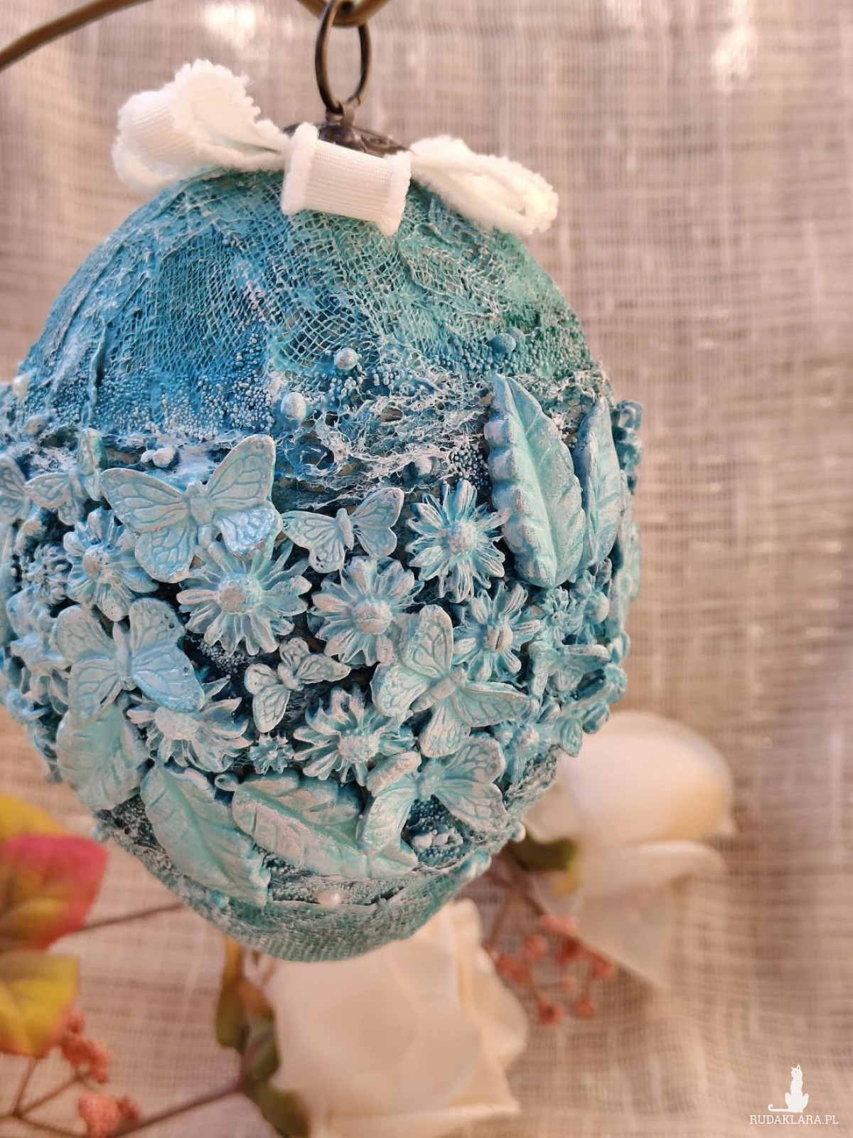 Błękitna Łąka to wyjątkowa, ręcznie zdobiona pisanka, która zachwyca świeżością koloru i bogactwem detali. Intensywny odcień turkusu przeplata się z subtelnymi przetarciami, tworząc efekt artystycznej głębi i lekkości. Kompozycja przestrzennych motyli, kwiatów oraz liści otula całą formę, nadając jej romantyczny, a jednocześnie elegancki charakter. To dekoracja, która przyciąga spojrzenia i wprowadza do wnętrza wiosenną energię oraz nutę luksusu.