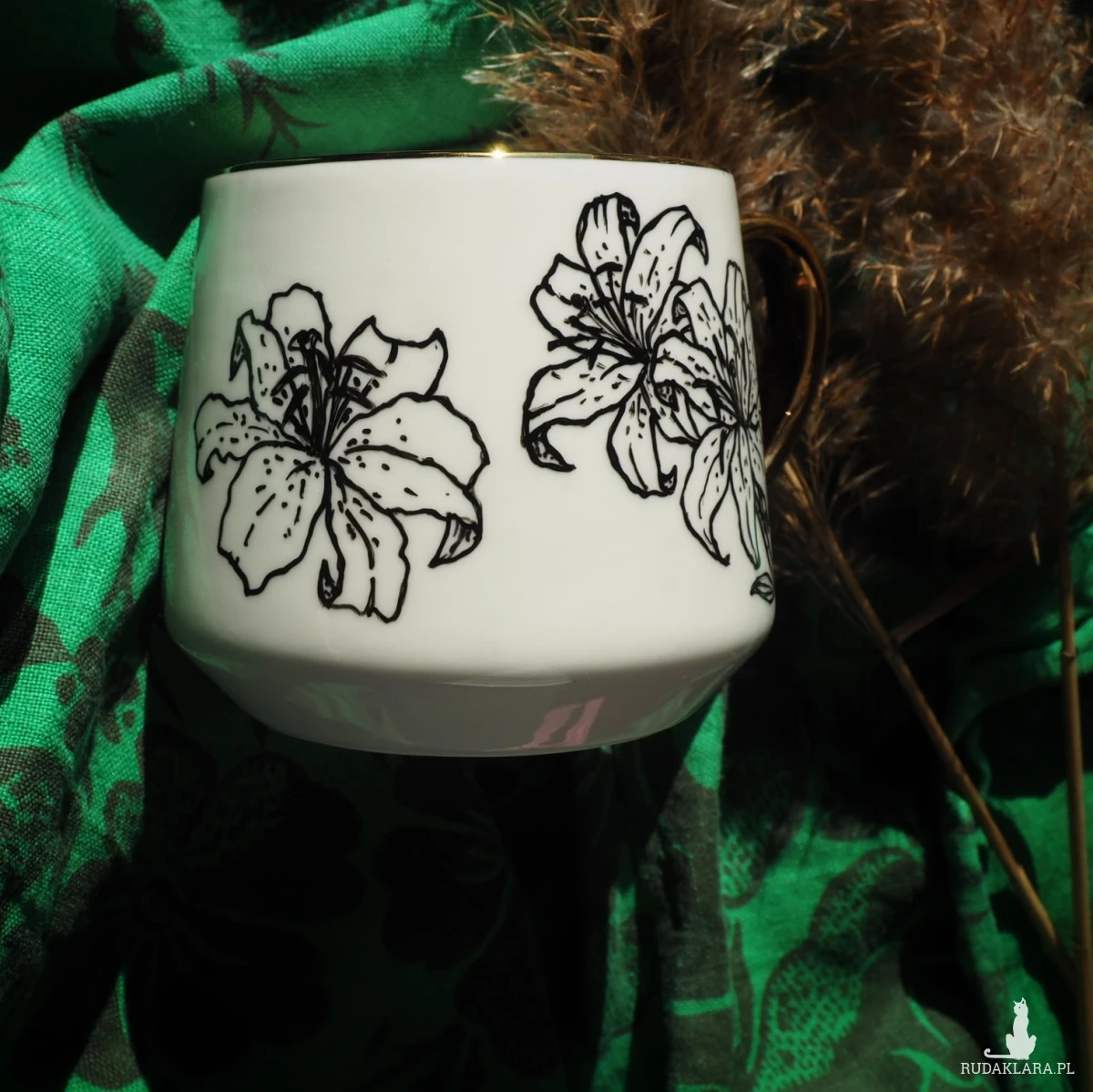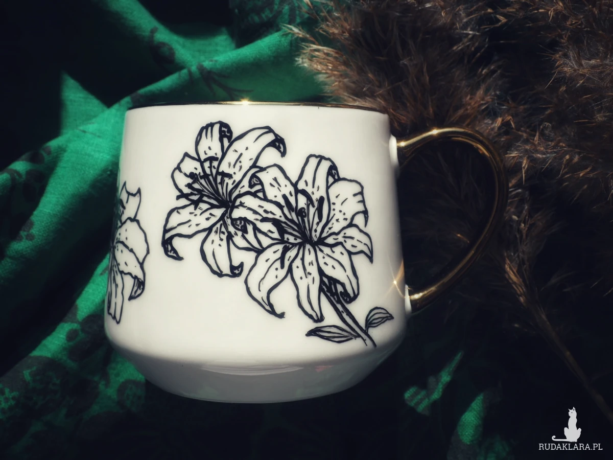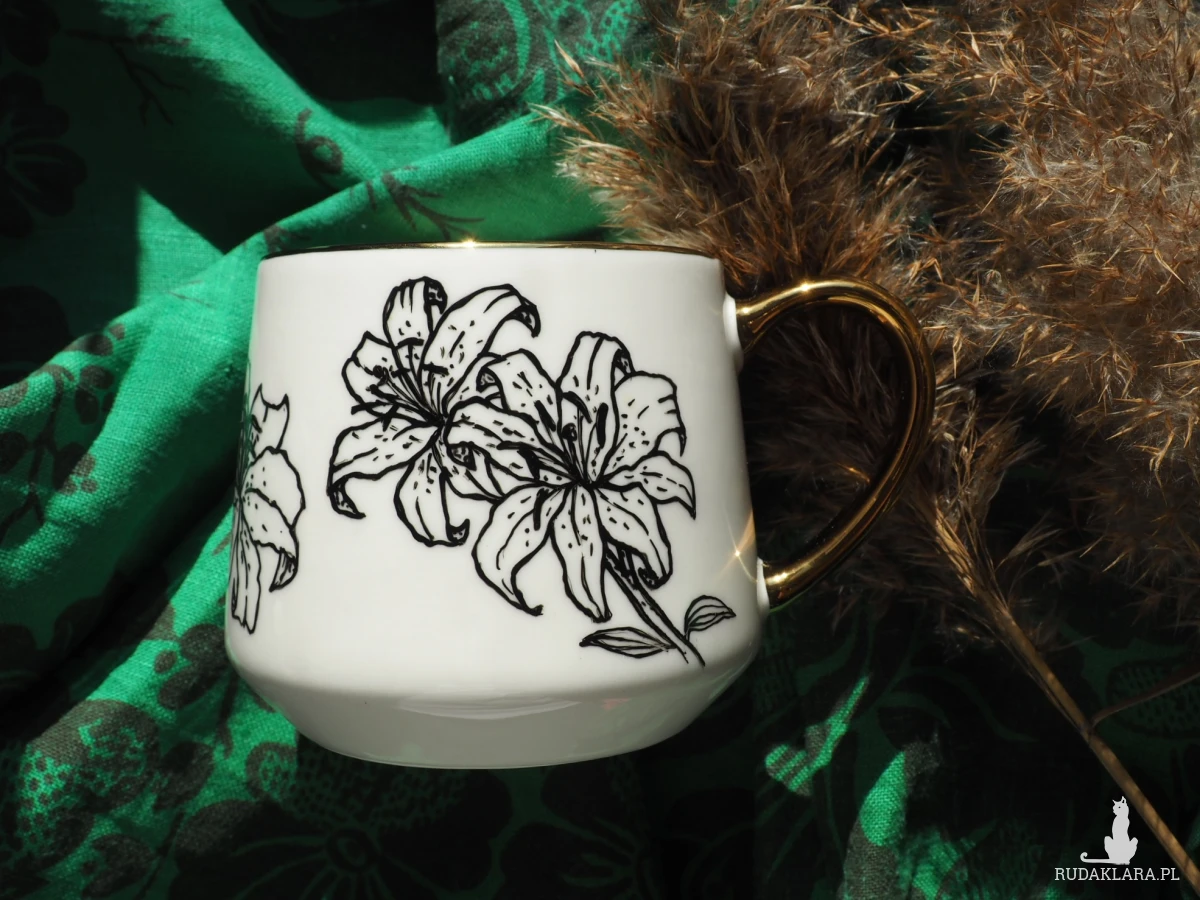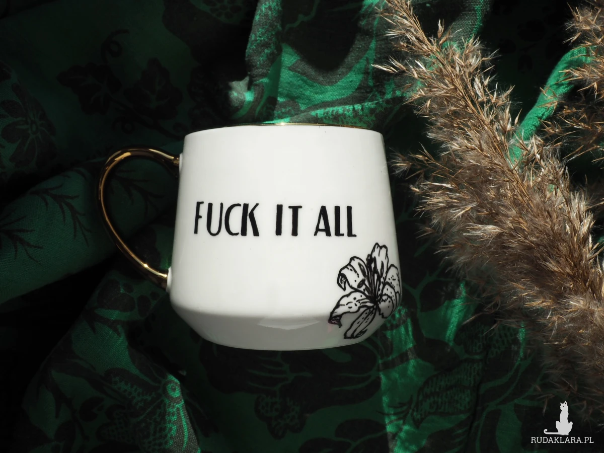 Połączenie eleganckiego wzoru z nieeleganckim hasłem - ręcznie malowany czarno-biały kubek z rysunkiem lilii i napisem "F'uck it all" to świetny pomysł na udany dzień lub udany prezent.